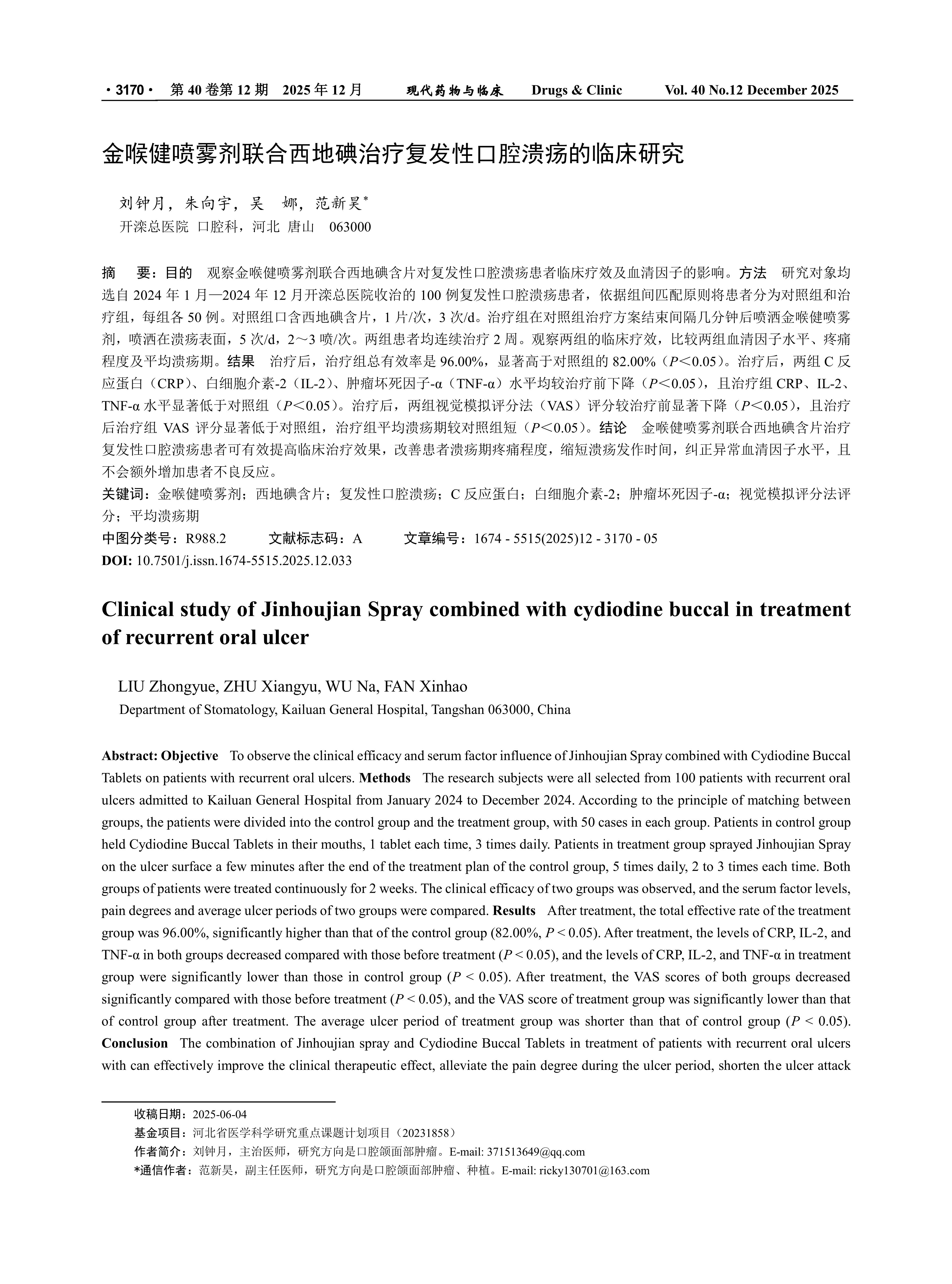 Objective To observe the clinical efficacy and serum factor influence of Jinhoujian Spray combined with Cydiodine Buccal Tablets on patients with recurrent oral ulcers. Methods The research subjects were all selected from 100 patients with recurrent oral ulcers admitted to Kailuan General Hospital from January 2024 to December 2024. According to the principle of matching between groups, the patients were divided into the control group and the treatment group, with 50 cases in each group. Patients in control group held Cydiodine Buccal Tablets in their mouths, 1 tablet each time, 3 times daily. Patients in treatment group sprayed Jinhoujian Spray on the ulcer surface a few minutes after the end of the treatment plan of the control group, 5 times daily, 2 to 3 times each time. Both groups of patients were treated continuously for 2 weeks. The clinical efficacy of two groups was observed, and the serum factor levels, pain degrees and average ulcer periods of two groups were compared. Results After treatment, the total effective rate of the treatment group was 96.00%, significantly higher than that of the control group (82.00%, P < 0.05). After treatment, the levels of CRP, IL-2, and TNF-α in both groups decreased compared with those before treatment (P < 0.05), and the levels of CRP, IL-2, and TNF-α in treatment group were significantly lower than those in control group (P < 0.05). After treatment, the VAS scores of both groups decreased significantly compared with those before treatment (P < 0.05), and the VAS score of treatment group was significantly lower than that of control group after treatment. The average ulcer period of treatment group was shorter than that of control group (P < 0.05). Conclusion The combination of Jinhoujian spray and Cydiodine Buccal Tablets in treatment of patients with recurrent oral ulcers with can effectively improve the clinical therapeutic effect, alleviate the pain degree during the ulcer period, shorten the ulcer attack time, correct the abnormal serum factor levels, and will not increase the adverse reactions of patients.