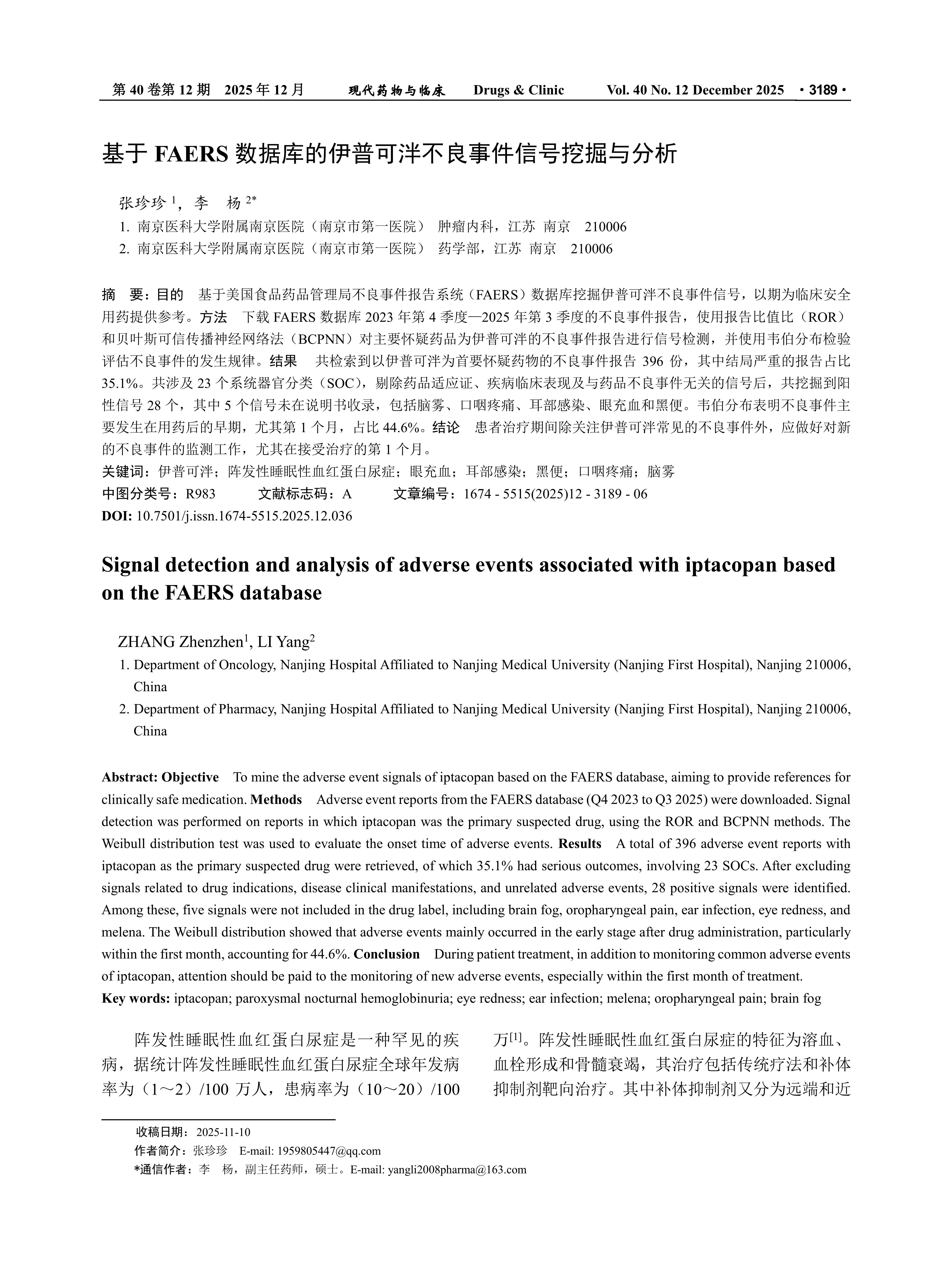 目的 基于美国食品药品管理局不良事件报告系统(FAERS)数据库挖掘伊普可泮不良事件信号,以期为临床安全用药提供参考。方法 下载FAERS数据库2023年第4季度—2025年第3季度的不良事件报告,使用报告比值比(ROR)和贝叶斯可信传播神经网络法(BCPNN)对主要怀疑药品为伊普可泮的不良事件报告进行信号检测,并使用韦伯分布检验评估不良事件的发生规律。结果 共检索到以伊普可泮为首要怀疑药物的不良事件报告396份,其中结局严重的报告占比35.1%。共涉及23个系统器官分类(SOC),剔除药品适应证、疾病临床表现及与药品不良事件无关的信号后,共挖掘到阳性信号28个,其中5个信号未在说明书收录,包括脑雾、口咽疼痛、耳部感染、眼充血和黑便。韦伯分布表明不良事件主要发生在用药后的早期,尤其第1个月,占比44.6%。结论 患者治疗期间除关注伊普可泮常见的不良事件外,应做好对新的不良事件的监测工作,尤其在接受治疗的第1个月。