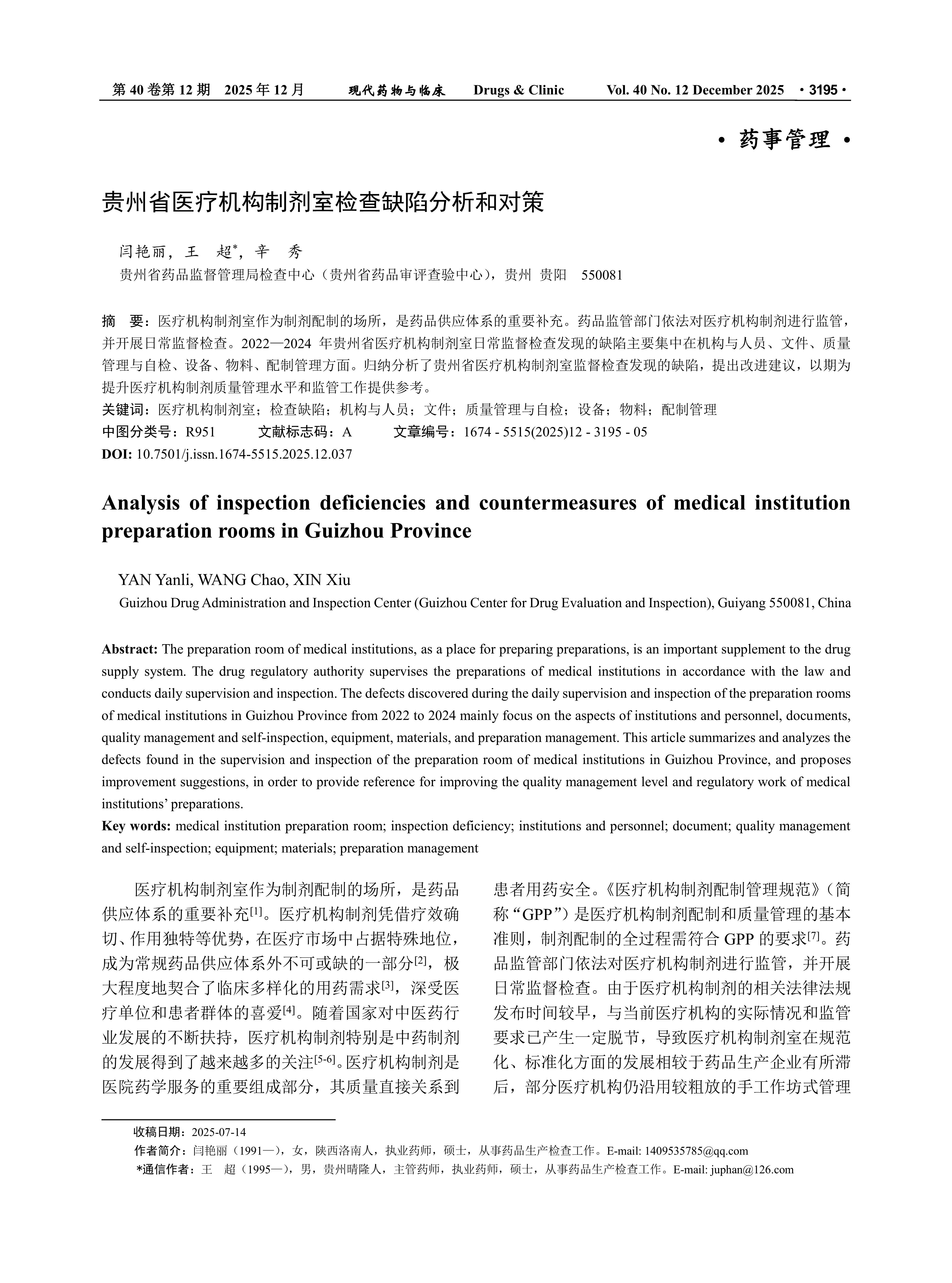 The preparation room of medical institutions, as a place for preparing preparations, is an important supplement to the drug supply system. The drug regulatory authority supervises the preparations of medical institutions in accordance with the law and conducts daily supervision and inspection. The defects discovered during the daily supervision and inspection of the preparation rooms of medical institutions in Guizhou Province from 2022 to 2024 mainly focus on the aspects of institutions and personnel, documents, quality management and self-inspection, equipment, materials, and preparation management. This article summarizes and analyzes the defects found in the supervision and inspection of the preparation room of medical institutions in Guizhou Province, and proposes improvement suggestions, in order to provide reference for improving the quality management level and regulatory work of medical institutions’ preparations.