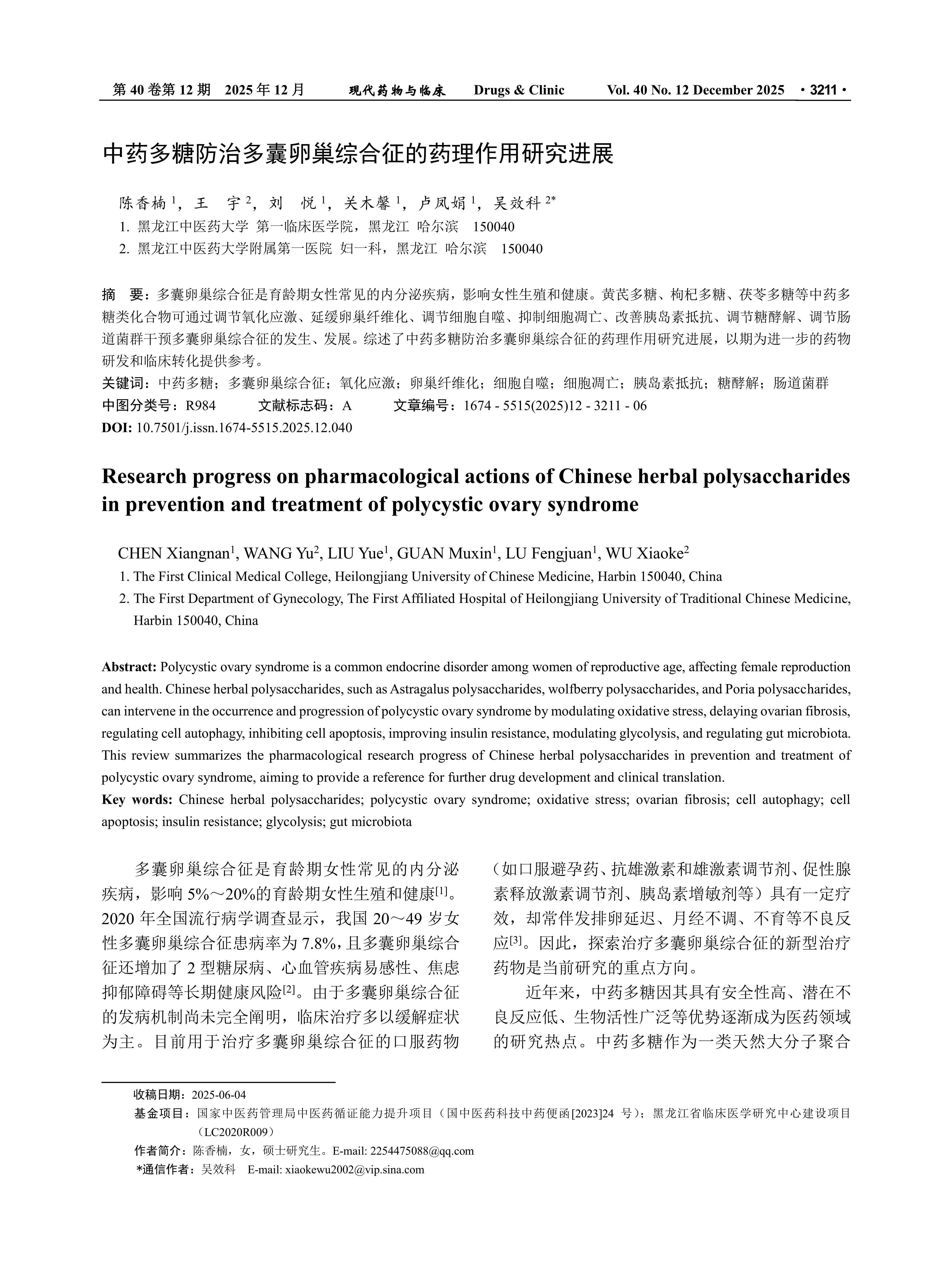 多囊卵巢综合征是育龄期女性常见的内分泌疾病,影响女性生殖和健康。黄芪多糖、枸杞多糖、茯苓多糖等中药多糖类化合物可通过调节氧化应激、延缓卵巢纤维化、调节细胞自噬、抑制细胞凋亡、改善胰岛素抵抗、调节糖酵解、调节肠道菌群干预多囊卵巢综合征的发生、发展。综述了中药多糖防治多囊卵巢综合征的药理作用研究进展,以期为进一步的药物研发和临床转化提供参考。