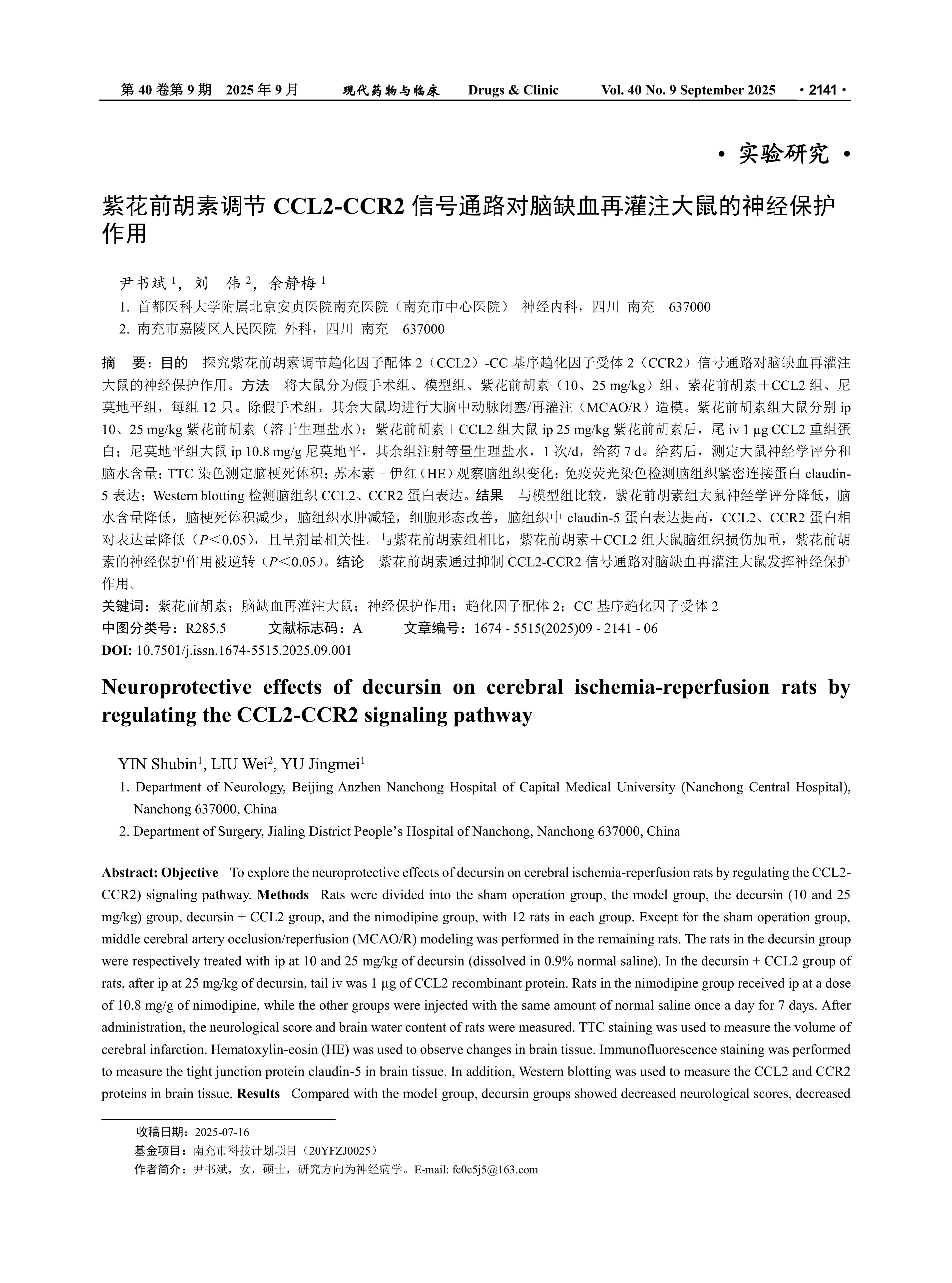 紫花前胡素调节CCL2-CCR2信号通路对脑缺血再灌注大鼠的神经保护作用