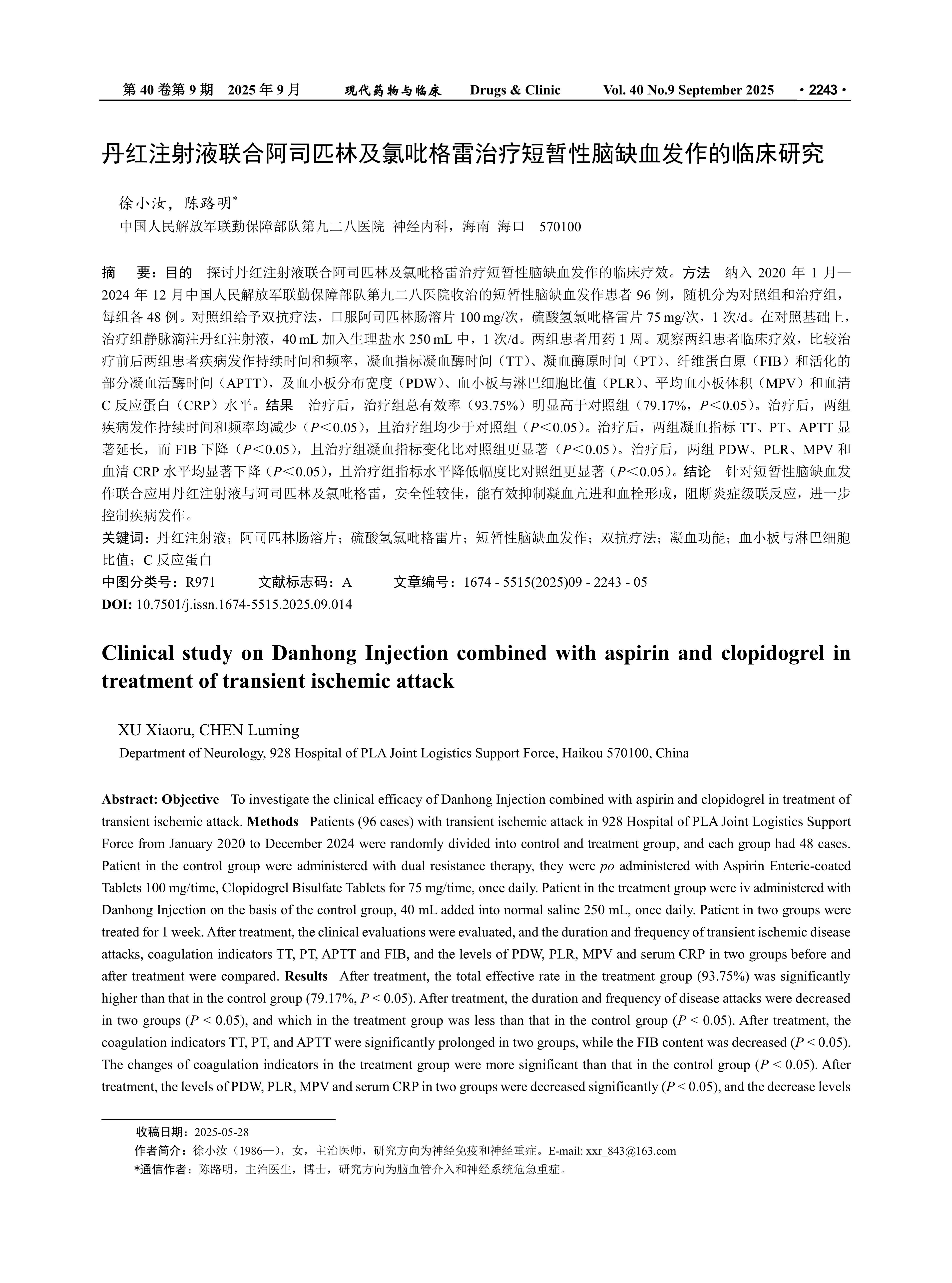 Clinical study on Danhong Injection combined with aspirin and clopidogrel in treatment of transient ischemic attack