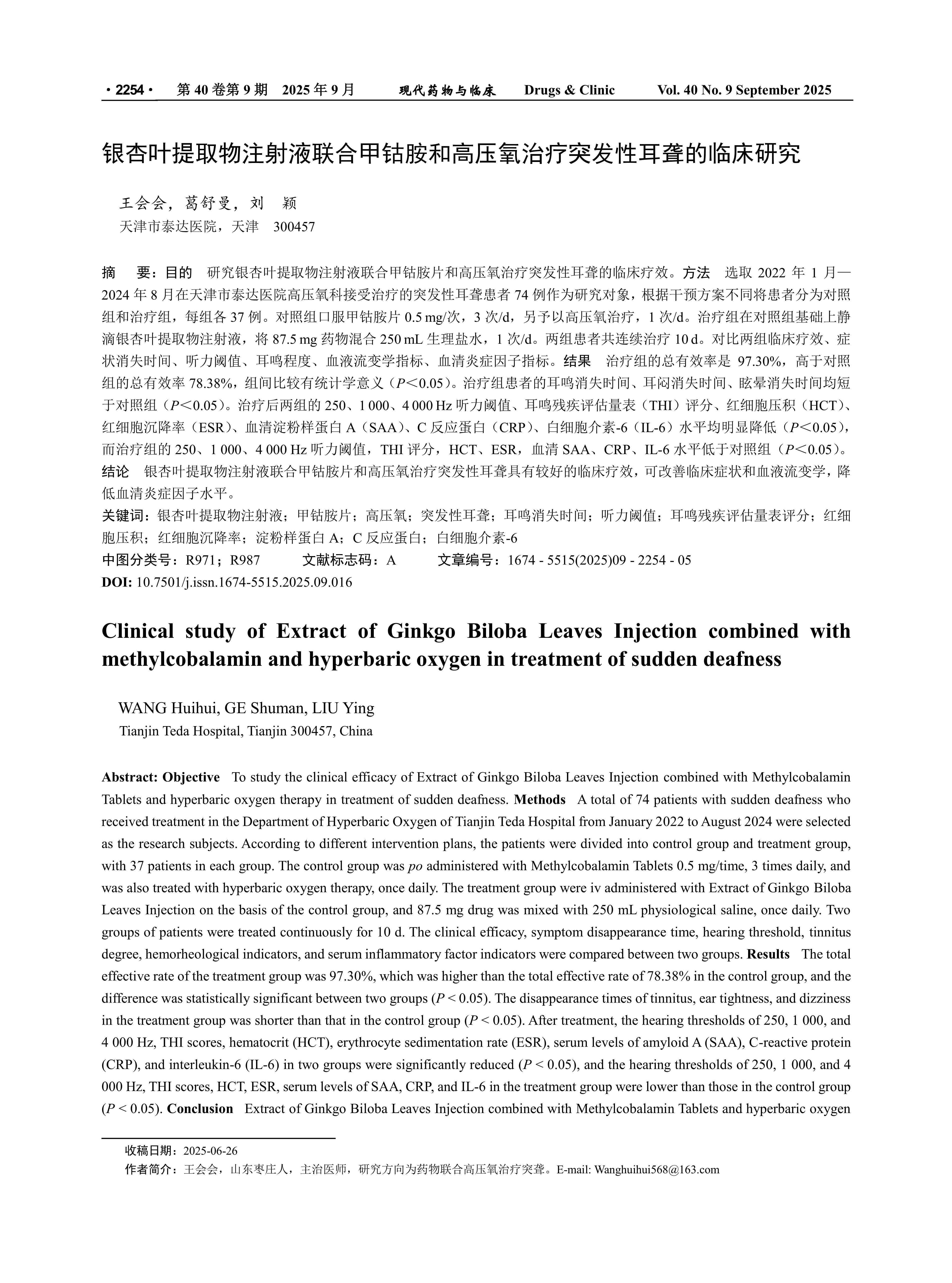 Clinical study of Extract of Ginkgo Biloba Leaves Injection combined with methylcobalamin and hyperbaric oxygen in treatment of sudden deafness