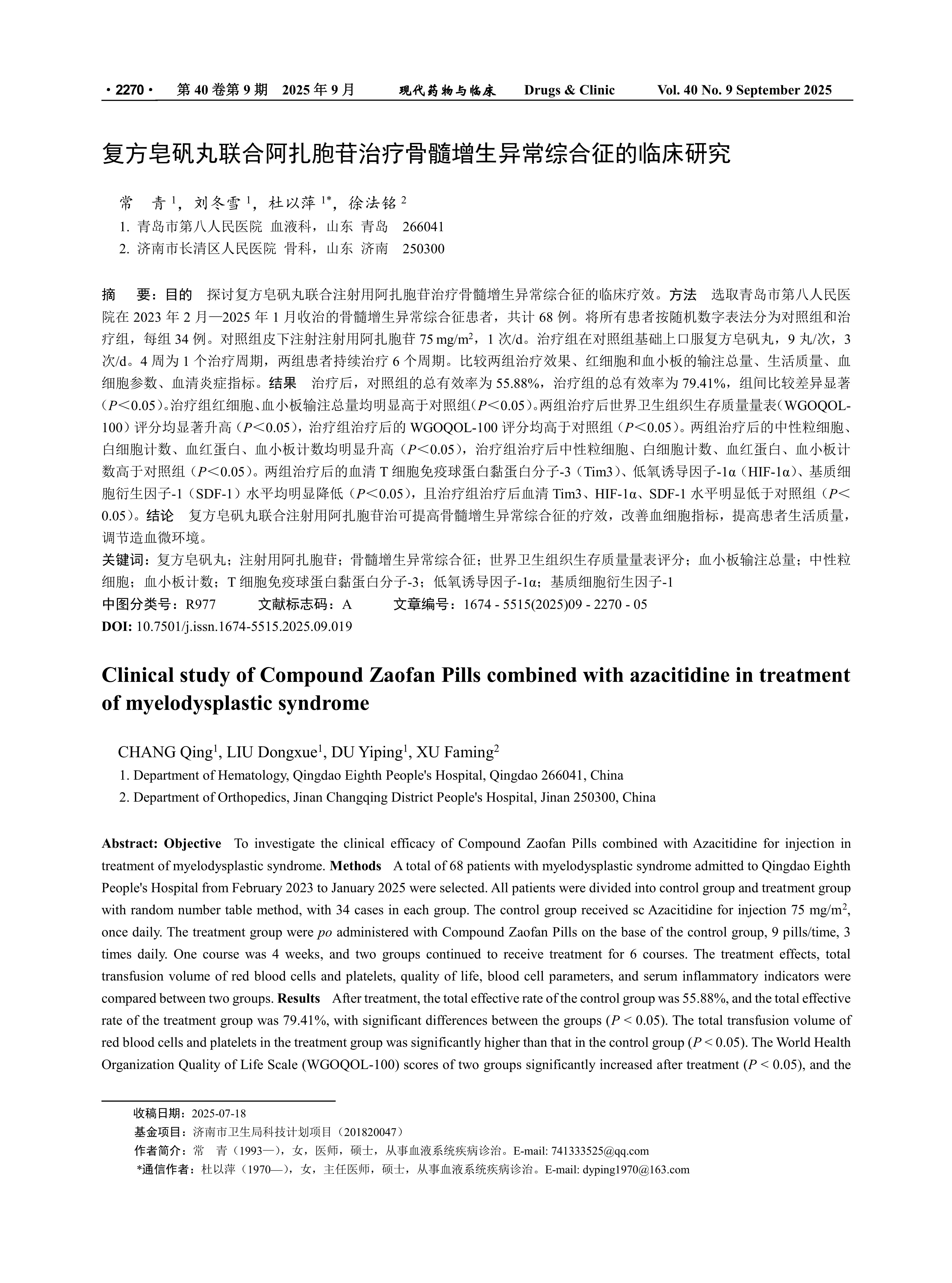 Clinical study of Compound Zaofan Pills combined with azacitidine in treatment of myelodysplastic syndrome