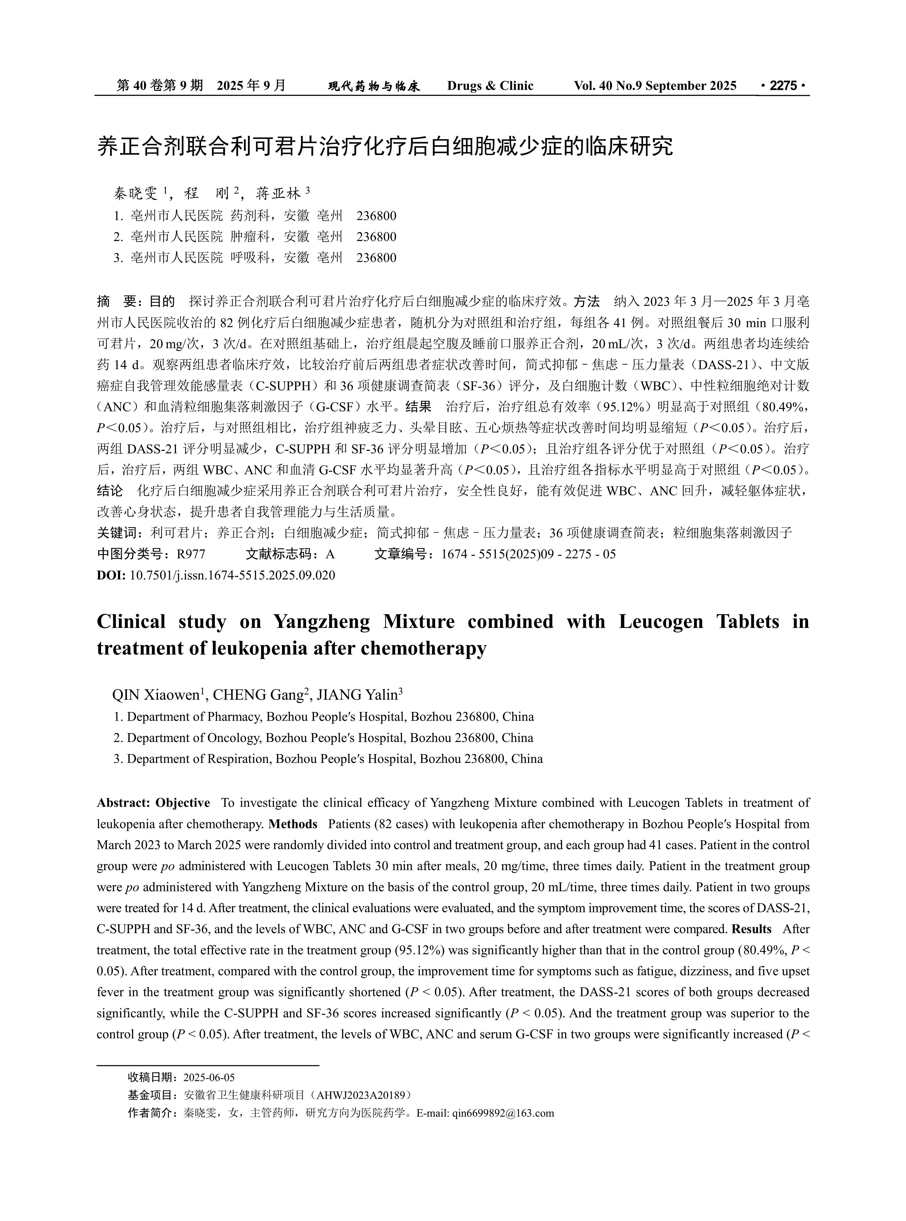养正合剂联合利可君片治疗化疗后白细胞减少症的临床研究