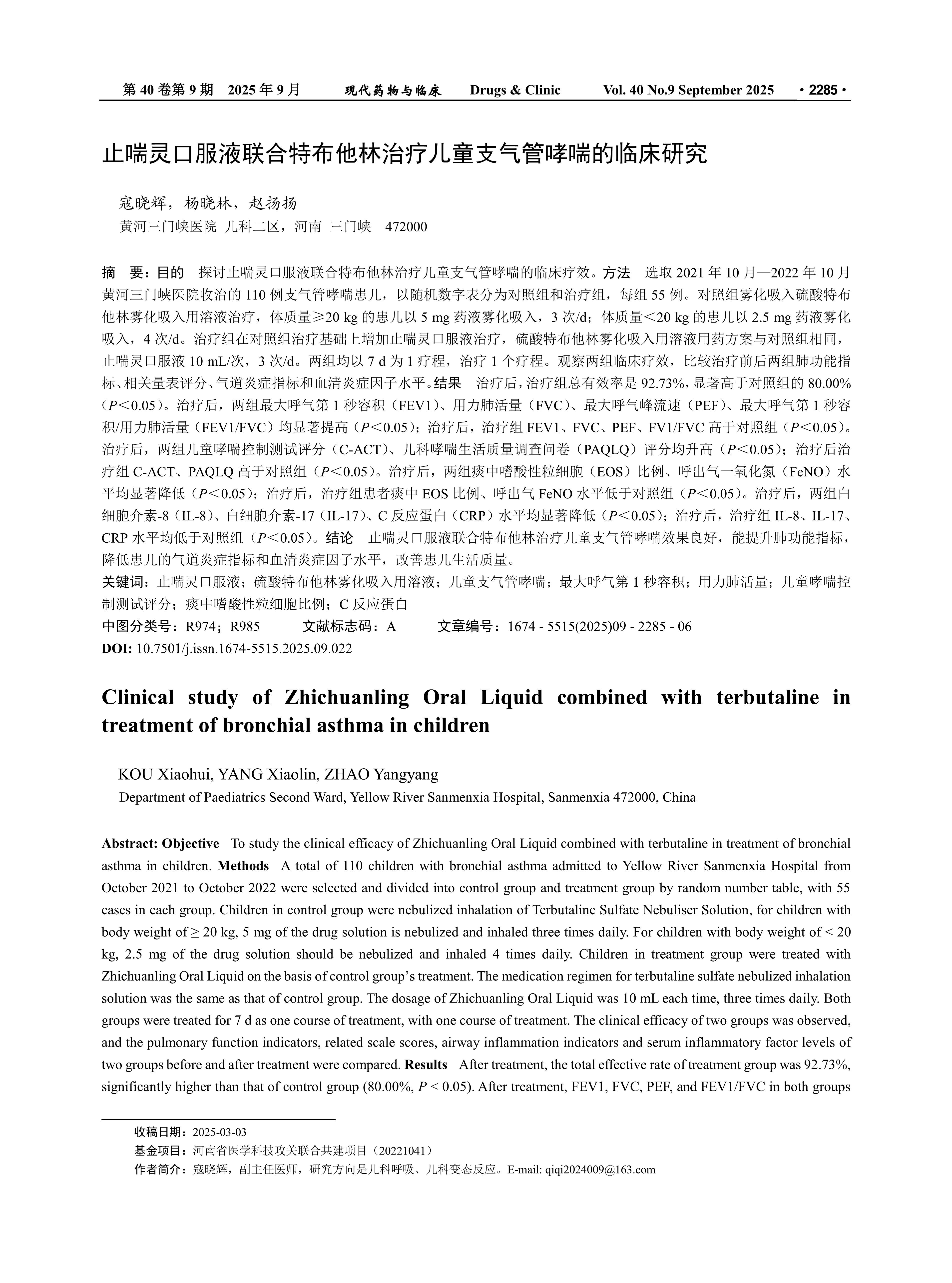 Objective To study the clinical efficacy of Zhichuanling Oral Liquid combined with terbutaline in treatment of bronchial asthma in children. Methods A total of 110 children with bronchial asthma admitted to Yellow River Sanmenxia Hospital from October 2021 to October 2022 were selected and divided into control group and treatment group by random number table, with 55 cases in each group. Children in control group were nebulized inhalation of Terbutaline Sulfate Nebuliser Solution, for children with body weight of ≥ 20 kg, 5 mg of the drug solution is nebulized and inhaled three times daily. For children with body weight of < 20 kg, 2.5 mg of the drug solution should be nebulized and inhaled 4 times daily. Children in treatment group were treated with Zhichuanling Oral Liquid on the basis of control group’s treatment. The medication regimen for terbutaline sulfate nebulized inhalation solution was the same as that of control group. The dosage of Zhichuanling Oral Liquid was 10 mL each time, three times daily. Both groups were treated for 7 d as one course of treatment, with one course of treatment. The clinical efficacy of two groups was observed, and the pulmonary function indicators, related scale scores, airway inflammation indicators and serum inflammatory factor levels of two groups before and after treatment were compared. Results After treatment, the total effective rate of treatment group was 92.73%, significantly higher than that of control group (80.00%, P < 0.05). After treatment, FEV1, FVC, PEF, and FEV1/FVC in both groups were significantly increased (P < 0.05). After treatment, the levels of FEV1, FVC, PEF, and FV1/FVC in treatment group were higher than those in control group (P < 0.05). After treatment, the scores of C-ACT and PAQLQ in both groups increased (P < 0.05). After treatment, the C-ACT and PAQLQ in treatment group were higher than those in control group (P < 0.05). After treatment, the proportion of EOS in sputum and the level of FeNO in both groups were significantly decreased (P < 0.05). After treatment, the proportion of EOS in sputum and the FeNO level in exhaled breath of patients in treatment group were lower than those in control group (P < 0.05). After treatment, the levels of IL-8, IL-17, and CRP in both groups were significantly decreased (P < 0.05). After treatment, the levels of IL-8, IL-17, and CRP in treatment group were all lower than those in control group (P < 0.05). Conclusion Zhichuanling Oral Liquid combined with terbutaline is clinically significant in treatment of bronchial asthma in children, can improve the lung function of children, reduce airway inflammation indicators and serum inflammatory factor levels, which can improve life quality of children.