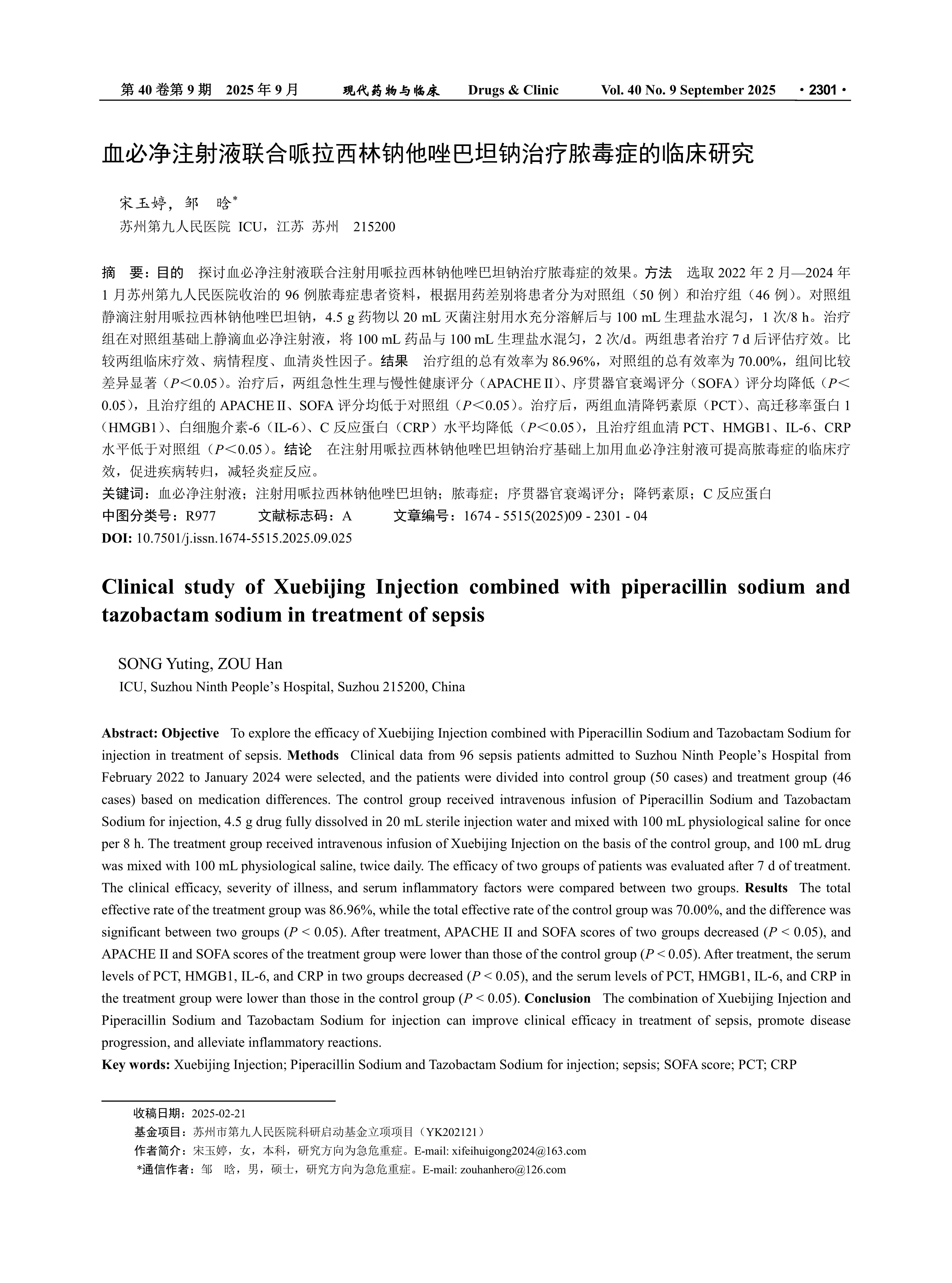 Objective To explore the efficacy of Xuebijing Injection combined with Piperacillin Sodium and Tazobactam Sodium for injection in treatment of sepsis. Methods Clinical data from 96 sepsis patients admitted to Suzhou Ninth People’s Hospital from February 2022 to January 2024 were selected, and the patients were divided into control group (50 cases) and treatment group (46 cases) based on medication differences. The control group received intravenous infusion of Piperacillin Sodium and Tazobactam Sodium for injection, 4.5 g drug fully dissolved in 20 mL sterile injection water and mixed with 100 mL physiological saline for once per 8 h. The treatment group received intravenous infusion of Xuebijing Injection on the basis of the control group, and 100 mL drug was mixed with 100 mL physiological saline, twice daily. The efficacy of two groups of patients was evaluated after 7 d of treatment. The clinical efficacy, severity of illness, and serum inflammatory factors were compared between two groups. Results The total effective rate of the treatment group was 86.96%, while the total effective rate of the control group was 70.00%, and the difference was significant between two groups (P < 0.05). After treatment, APACHE II and SOFA scores of two groups decreased (P < 0.05), and APACHE II and SOFA scores of the treatment group were lower than those of the control group (P < 0.05). After treatment, the serum levels of PCT, HMGB1, IL-6, and CRP in two groups decreased (P < 0.05), and the serum levels of PCT, HMGB1, IL-6, and CRP in the treatment group were lower than those in the control group (P < 0.05). Conclusion The combination of Xuebijing Injection and Piperacillin Sodium and Tazobactam Sodium for injection can improve clinical efficacy in treatment of sepsis, promote disease progression, and alleviate inflammatory reactions.