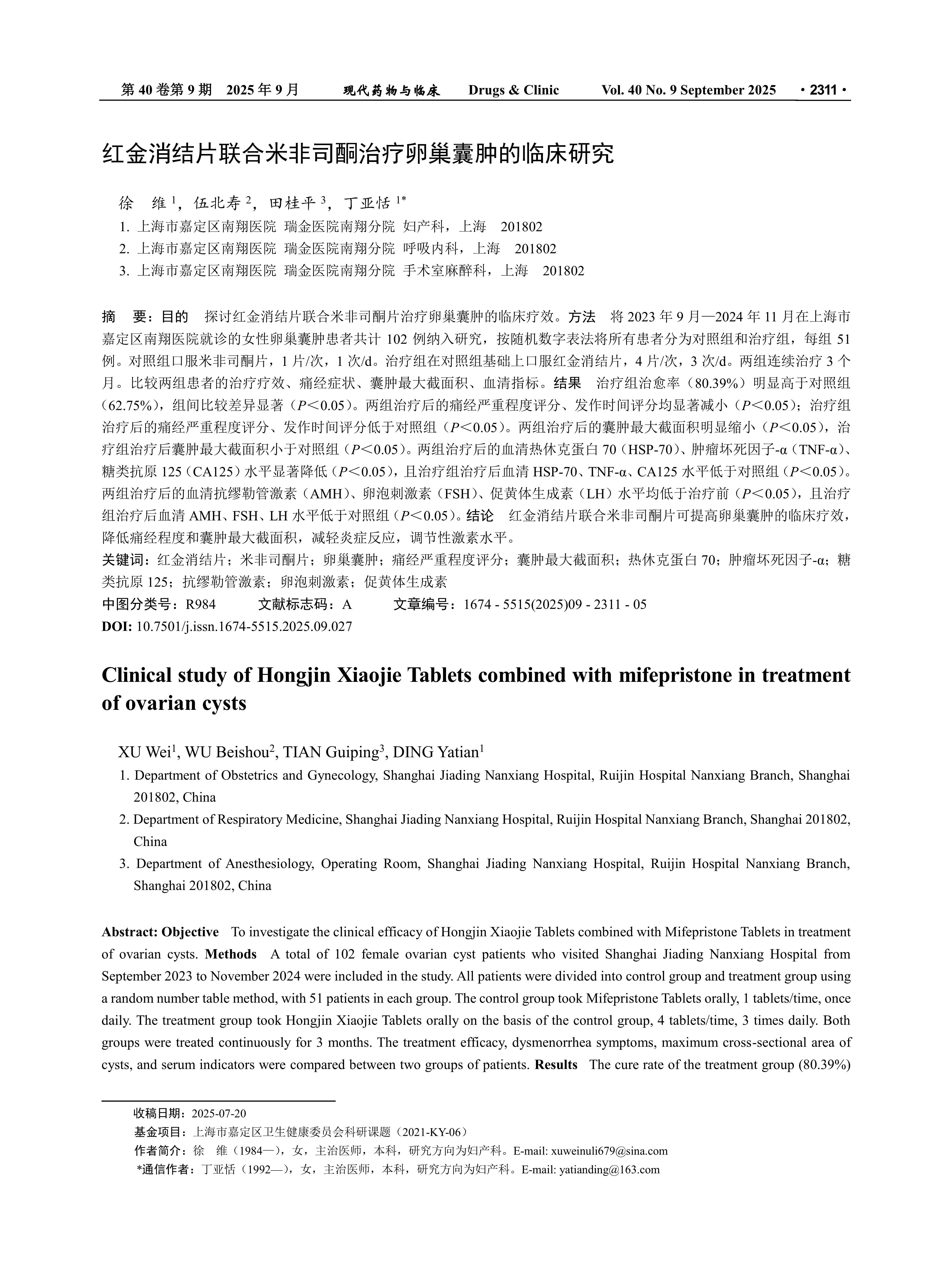 Objective To investigate the clinical efficacy of Hongjin Xiaojie Tablets combined with Mifepristone Tablets in treatment of ovarian cysts. Methods A total of 102 female ovarian cyst patients who visited Shanghai Jiading Nanxiang Hospital from September 2023 to November 2024 were included in the study. All patients were divided into control group and treatment group using a random number table method, with 51 patients in each group. The control group took Mifepristone Tablets orally, 1 tablets/time, once daily. The treatment group took Hongjin Xiaojie Tablets orally on the basis of the control group, 4 tablets/time, 3 times daily. Both groups were treated continuously for 3 months. The treatment efficacy, dysmenorrhea symptoms, maximum cross-sectional area of cysts, and serum indicators were compared between two groups of patients. Results The cure rate of the treatment group (80.39%) was significantly higher than that of the control group (62.75%), and the difference was significant between the groups (P < 0.05). The severity score and onset time score of dysmenorrhea significantly decreased in two groups after treatment (P < 0.05), the severity score and onset time score of dysmenorrhea in the treatment group were lower than those in the control group after treatment (P < 0.05). After treatment, the maximum cross-sectional area of the cysts in two groups significantly decreased (P < 0.05), and the maximum cross-sectional area of the cysts in the treatment group was smaller than that in the control group (P < 0.05). After treatment, the serum levels of HSP-70, TNF-α, and CA125 in two groups were significantly reduced (P < 0.05), and the serum levels of HSP-70, TNF-α, and CA125 in the treatment group were lower than those in the control group (P < 0.05). The serum levels of AMH, FSH, and LH in two groups were significantly reduced after treatment (P < 0.05), and the serum levels of AMH, FSH, and LH in the treatment group were lower than those in the control group after treatment (P < 0.05). Conclusion The combination of Hongjin Xiaojie Tablets and Mifepristone Tablets can improve the clinical efficacy of ovarian cysts, reduce the degree of dysmenorrhea and the maximum cross-sectional area of cysts, alleviate inflammatory reactions, and regulate hormone levels.