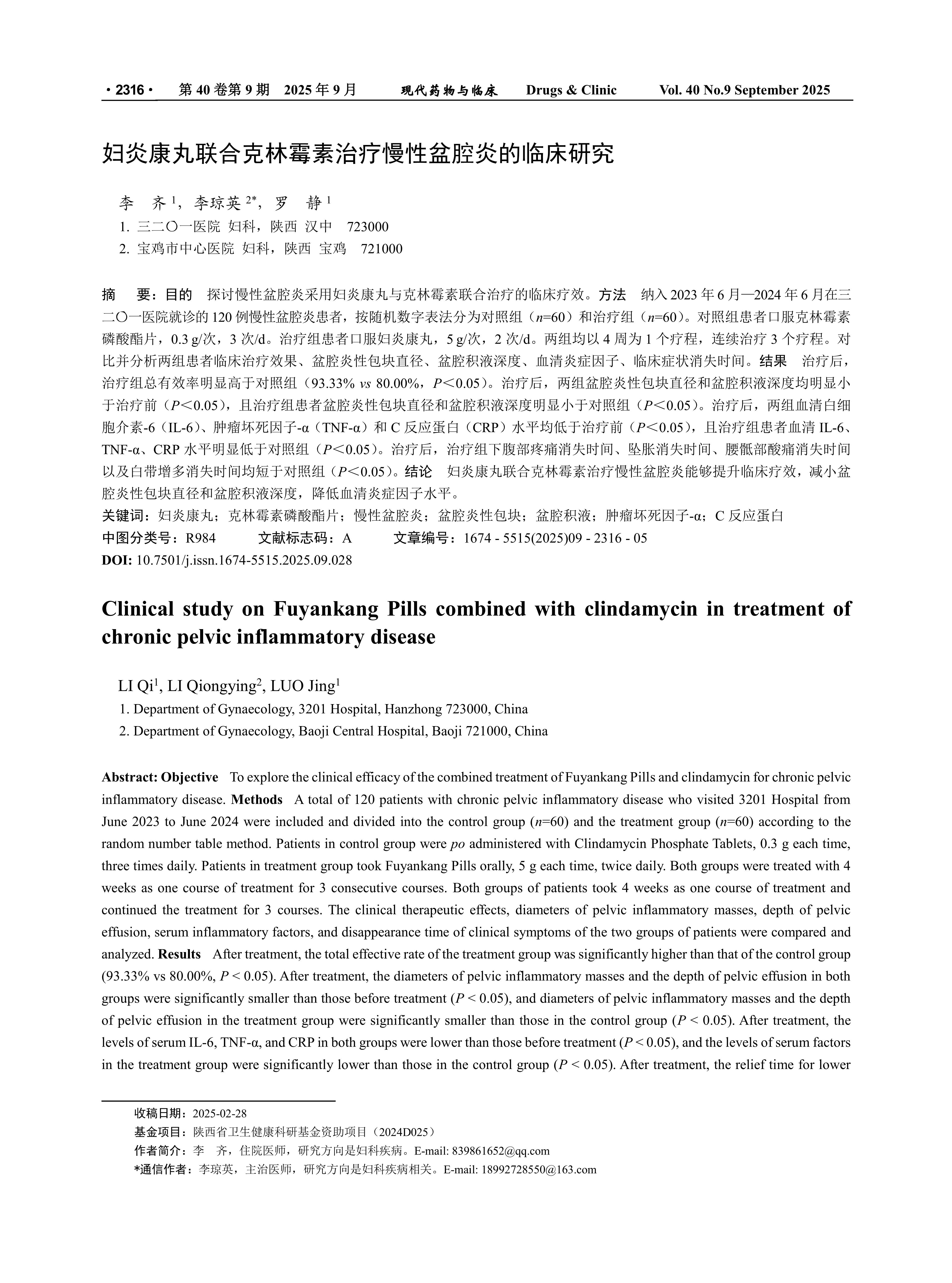 Objective To explore the clinical efficacy of the combined treatment of Fuyankang Pills and clindamycin for chronic pelvic inflammatory disease. Methods A total of 120 patients with chronic pelvic inflammatory disease who visited 3201 Hospital from June 2023 to June 2024 were included and divided into the control group (n=60) and the treatment group (n=60) according to the random number table method. Patients in control group were po administered with Clindamycin Phosphate Tablets, 0.3 g each time, three times daily. Patients in treatment group took Fuyankang Pills orally, 5 g each time, twice daily. Both groups were treated with 4 weeks as one course of treatment for 3 consecutive courses. Both groups of patients took 4 weeks as one course of treatment and continued the treatment for 3 courses. The clinical therapeutic effects, diameters of pelvic inflammatory masses, depth of pelvic effusion, serum inflammatory factors, and disappearance time of clinical symptoms of the two groups of patients were compared and analyzed. Results After treatment, the total effective rate of the treatment group was significantly higher than that of the control group (93.33% vs 80.00%, P < 0.05). After treatment, the diameters of pelvic inflammatory masses and the depth of pelvic effusion in both groups were significantly smaller than those before treatment (P < 0.05), and diameters of pelvic inflammatory masses and the depth of pelvic effusion in the treatment group were significantly smaller than those in the control group (P < 0.05). After treatment, the levels of serum IL-6, TNF-α, and CRP in both groups were lower than those before treatment (P < 0.05), and the levels of serum factors in the treatment group were significantly lower than those in the control group (P < 0.05). After treatment, the relief time for lower abdominal pain, distension, lumbosacral soreness and increased vaginal discharge in the treatment group was shorter than that in the control group (P < 0.05). Conclusion The combined treatment of Fuyankang Pills and clindamycin for chronic pelvic inflammatory disease can improve the curative effect, reduce the diameter of pelvic inflammatory masses and the depth of pelvic effusion, lower the levels of serum inflammatory factors.