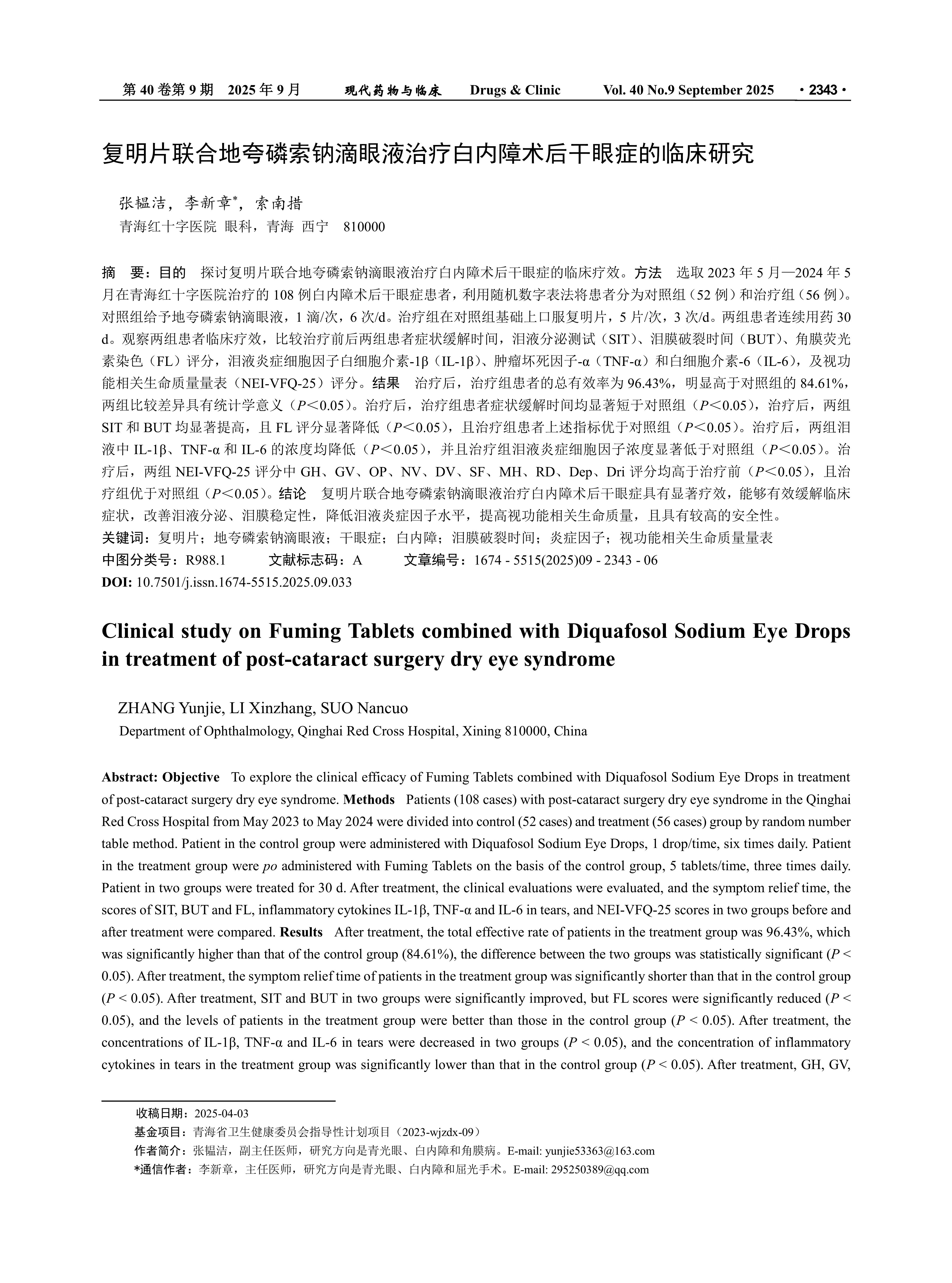 Objective To explore the clinical efficacy of Fuming Tablets combined with Diquafosol Sodium Eye Drops in treatment of post-cataract surgery dry eye syndrome. Methods Patients (108 cases) with post-cataract surgery dry eye syndrome in the Qinghai Red Cross Hospital from May 2023 to May 2024 were divided into control (52 cases) and treatment (56 cases) group by random number table method. Patient in the control group were administered with Diquafosol Sodium Eye Drops, 1 drop/time, six times daily. Patient in the treatment group were po administered with Fuming Tablets on the basis of the control group, 5 tablets/time, three times daily. Patient in two groups were treated for 30 d. After treatment, the clinical evaluations were evaluated, and the symptom relief time, the scores of SIT, BUT and FL, inflammatory cytokines IL-1β, TNF-α and IL-6 in tears, and NEI-VFQ-25 scores in two groups before and after treatment were compared. Results After treatment, the total effective rate of patients in the treatment group was 96.43%, which was significantly higher than that of the control group (84.61%), the difference between the two groups was statistically significant (P < 0.05). After treatment, the symptom relief time of patients in the treatment group was significantly shorter than that in the control group (P < 0.05). After treatment, SIT and BUT in two groups were significantly improved, but FL scores were significantly reduced (P < 0.05), and the levels of patients in the treatment group were better than those in the control group (P < 0.05). After treatment, the concentrations of IL-1β, TNF-α and IL-6 in tears were decreased in two groups (P < 0.05), and the concentration of inflammatory cytokines in tears in the treatment group was significantly lower than that in the control group (P < 0.05). After treatment, GH, GV, OP, NV, DV, SF, MH, RD, Dep, Dri of NEI-VFQ-25 scores in two groups were higher than before treatment (P < 0.05), and the treatment group was higher than the control group (P < 0.05). Conclusion Fuming Pian combined with Diquafosol Sodium Eye Drops is highly effective in treating post-cataract surgery dry eye syndrome, which can effectively relieve clinical symptoms, improve tear secretion, tear film stability, lower inflammatory cytokine levels, improve vision-related quality of life, and has high safety.