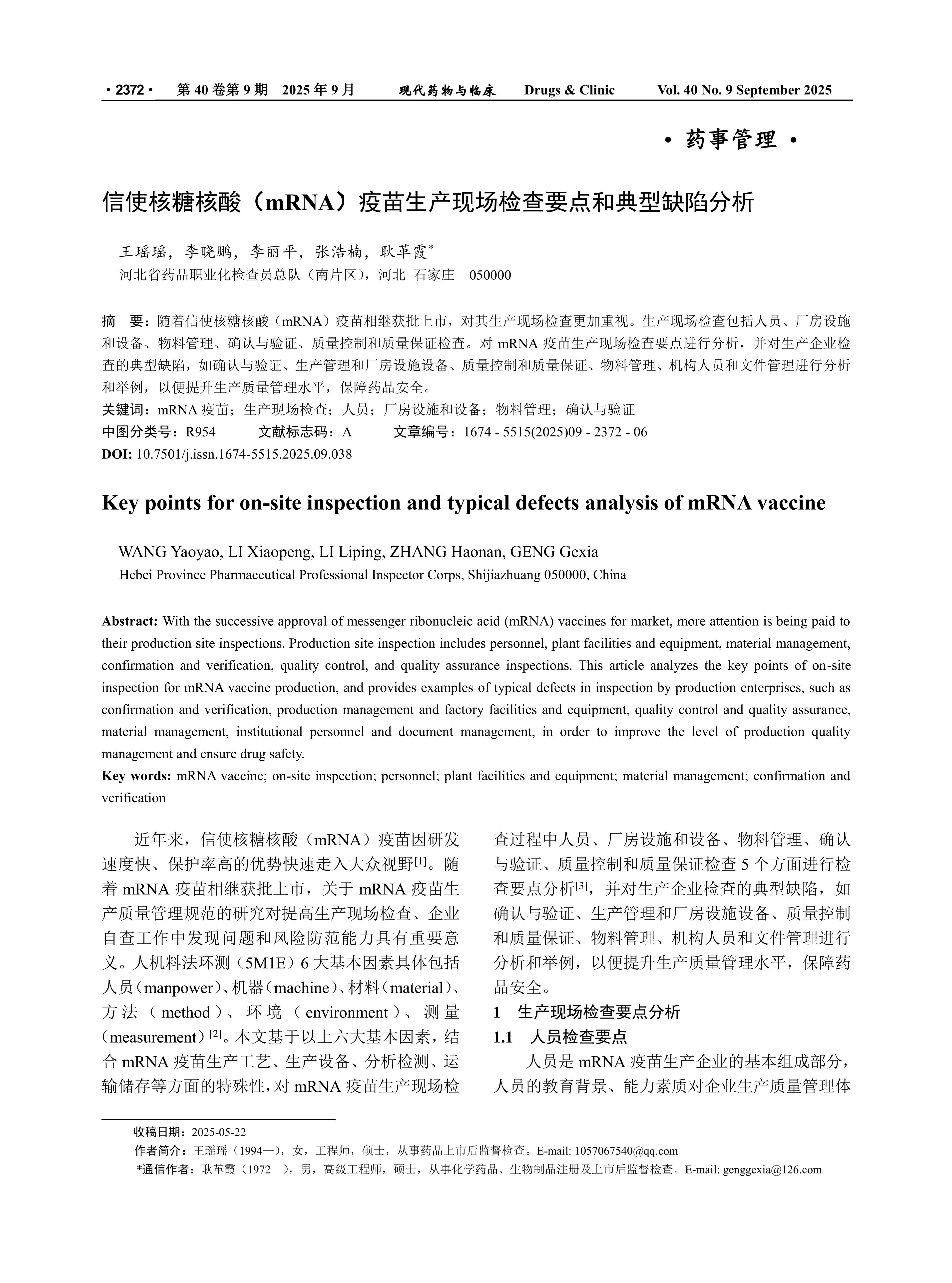 With the successive approval of messenger ribonucleic acid (mRNA) vaccines for market, more attention is being paid to their production site inspections. Production site inspection includes personnel, plant facilities and equipment, material management, confirmation and verification, quality control, and quality assurance inspections. This article analyzes the key points of on-site inspection for mRNA vaccine production, and provides examples of typical defects in inspection by production enterprises, such as confirmation and verification, production management and factory facilities and equipment, quality control and quality assurance, material management, institutional personnel and document management, in order to improve the level of production quality management and ensure drug safety.