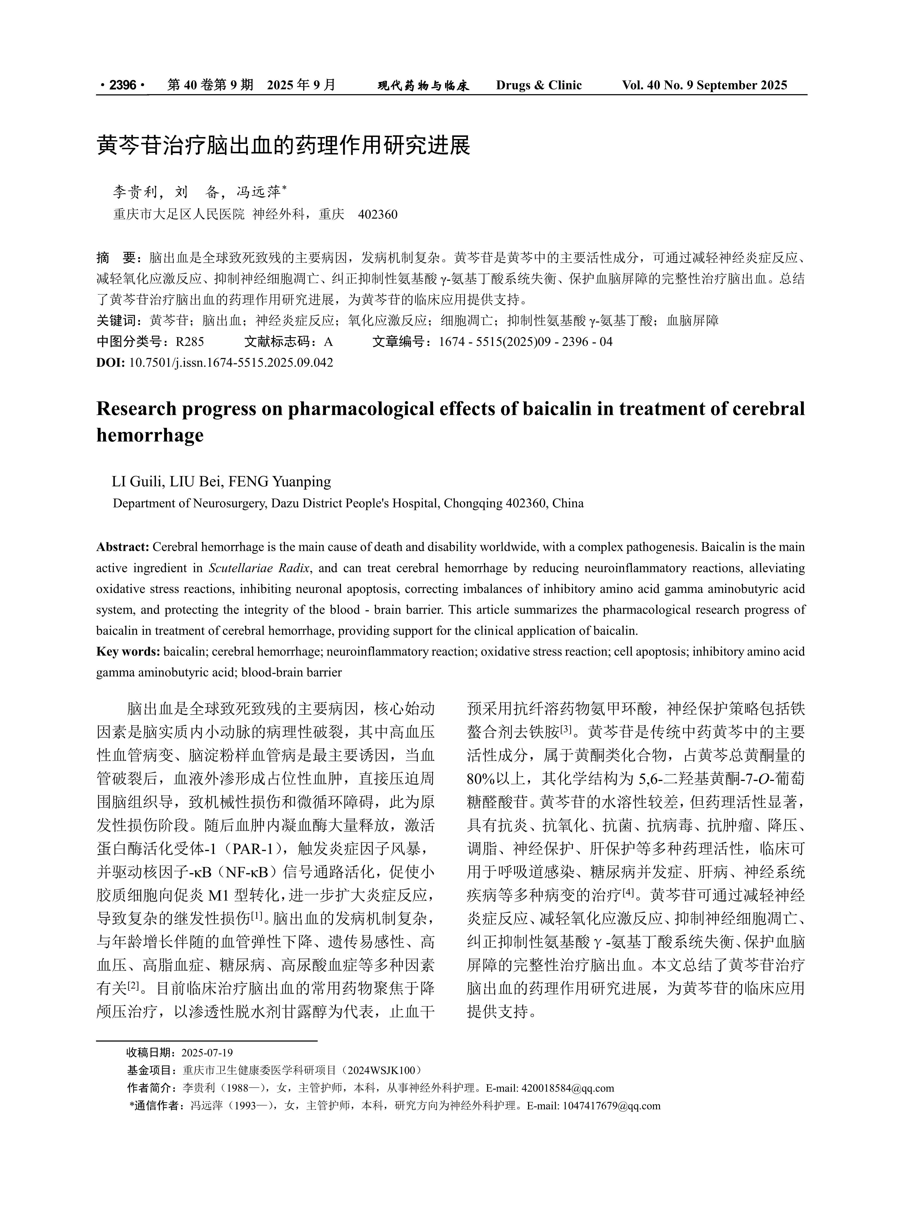 Research progress on pharmacological effects of baicalin in treatment of cerebral hemorrhage