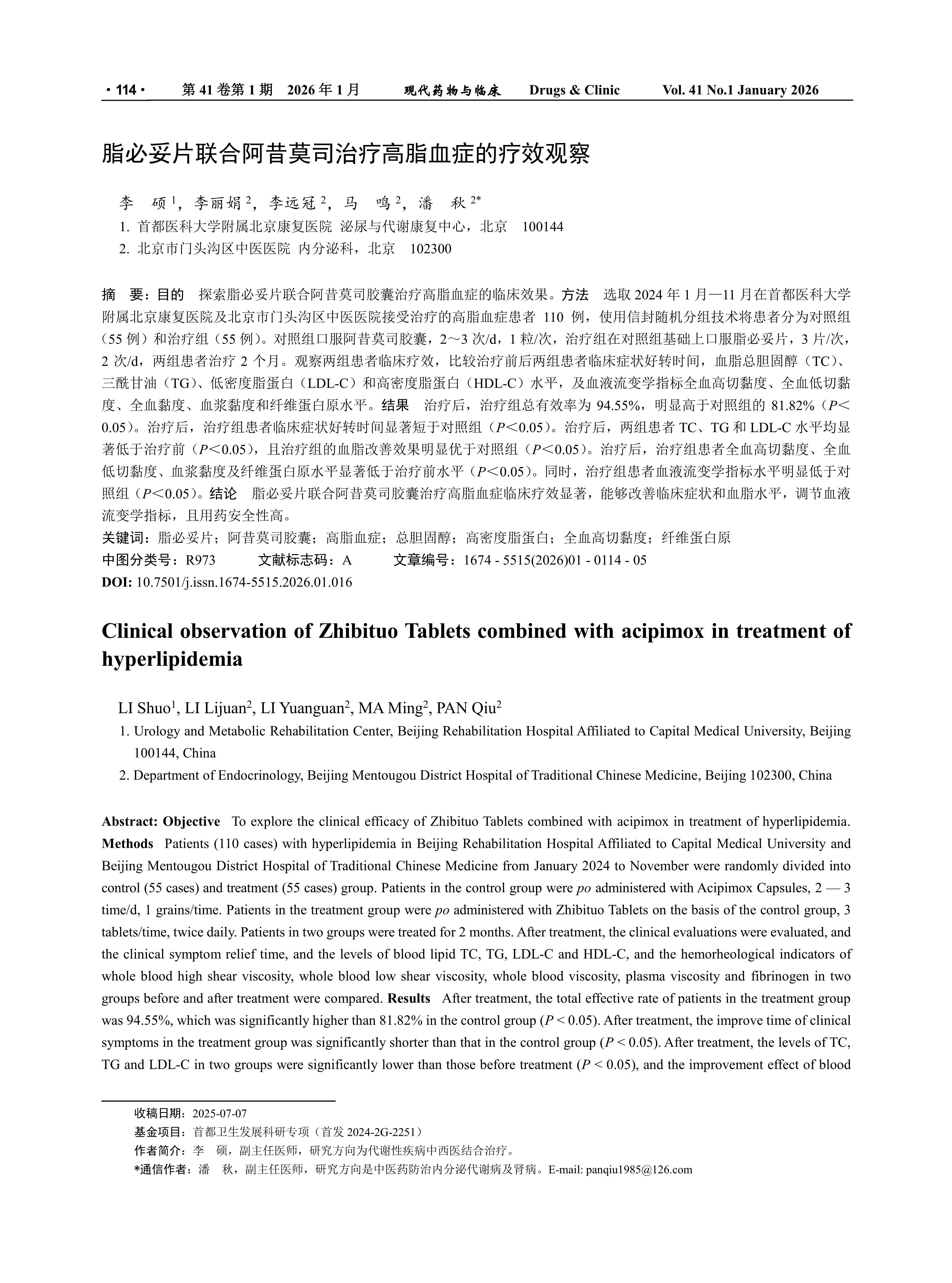 Objective To explore the clinical efficacy of Zhibituo Tablets combined with acipimox in treatment of hyperlipidemia. Methods Patients (110 cases) with hyperlipidemia in Beijing Rehabilitation Hospital Affiliated to Capital Medical University and Beijing Mentougou District Hospital of Traditional Chinese Medicine from January 2024 to November were randomly divided into control (55 cases) and treatment (55 cases) group. Patients in the control group were po administered with Acipimox Capsules, 2 — 3 time/d, 1 grains/time. Patients in the treatment group were po administered with Zhibituo Tablets on the basis of the control group, 3 tablets/time, twice daily. Patients in two groups were treated for 2 months. After treatment, the clinical evaluations were evaluated, and the clinical symptom relief time, and the levels of blood lipid TC, TG, LDL-C and HDL-C, and the hemorheological indicators of whole blood high shear viscosity, whole blood low shear viscosity, whole blood viscosity, plasma viscosity and fibrinogen in two groups before and after treatment were compared. Results After treatment, the total effective rate of patients in the treatment group was 94.55%, which was significantly higher than 81.82% in the control group (P < 0.05). After treatment, the improve time of clinical symptoms in the treatment group was significantly shorter than that in the control group (P < 0.05). After treatment, the levels of TC, TG and LDL-C in two groups were significantly lower than those before treatment (P < 0.05), and the improvement effect of blood lipids in the treatment group was significantly better than that in the control group (P < 0.05). After treatment, the whole blood high shear viscosity, whole blood low shear viscosity, plasma viscosity and fibrinogen levels in the treatment group were significantly lower than those before treatment (P < 0.05). At the same time, the levels of hemorheology indicators in the treatment group were significantly lower than that in the control group (P < 0.05). Conclusion The combination of Zhibituo Tablets and Axiolimus Capsules has significant clinical efficacy in treating hyperlipidemia, improving clinical symptoms and blood lipid levels, regulating hemorheological indicators, and high safety.