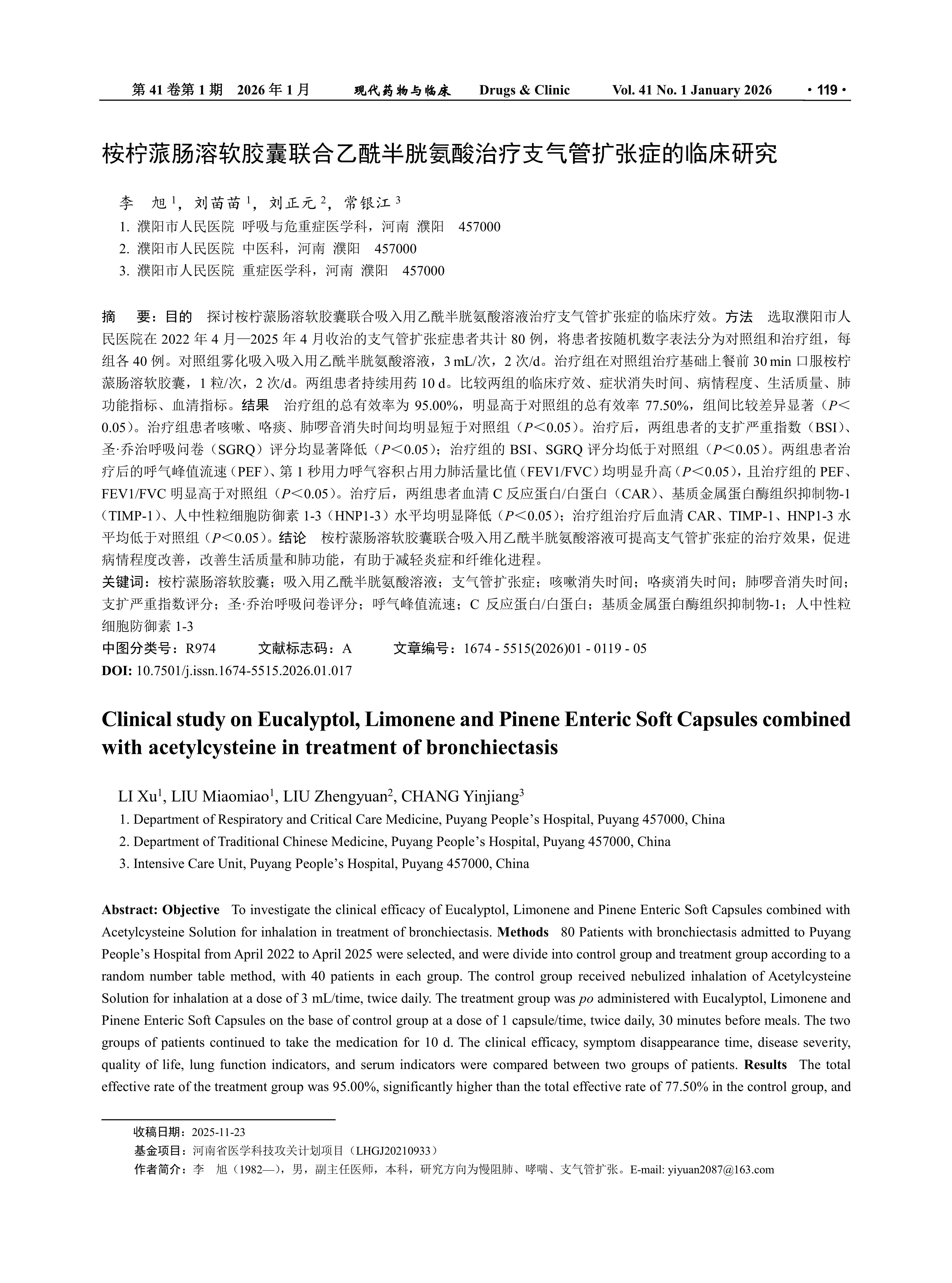 Objective To investigate the clinical efficacy of Eucalyptol, Limonene and Pinene Enteric Soft Capsules combined with Acetylcysteine Solution for inhalation in treatment of bronchiectasis. Methods 80 Patients with bronchiectasis admitted to Puyang People’s Hospital from April 2022 to April 2025 were selected, and were divide into control group and treatment group according to a random number table method, with 40 patients in each group. The control group received nebulized inhalation of Acetylcysteine Solution for inhalation at a dose of 3 mL/time, twice daily. The treatment group was po administered with Eucalyptol, Limonene and Pinene Enteric Soft Capsules on the base of control group at a dose of 1 capsule/time, twice daily, 30 minutes before meals. The two groups of patients continued to take the medication for 10 d. The clinical efficacy, symptom disappearance time, disease severity, quality of life, lung function indicators, and serum indicators were compared between two groups of patients. Results The total effective rate of the treatment group was 95.00%, significantly higher than the total effective rate of 77.50% in the control group, and the difference between two groups was significant (P < 0.05). The disappearance time of cough, sputum, and lung rales in the treatment group was significantly shorter than that in the control group (P < 0.05). After treatment, the severity index of bronchiectasis (BSI) and St. George’s Respiratory Questionnaire (SGRQ) scores of two groups of patients were significantly reduced (P < 0.05). The BSI and SGRQ scores of the treatment group were lower than those of the control group (P < 0.05). The peak expiratory flow rate (PEF) and the ratio of forced expiratory volume to forced vital capacity (FEV1/FVC) in two groups were significantly increased after treatment (P < 0.05), and the PEF and FEV1/FVC in the treatment group were significantly higher than those in the control group (P < 0.05). After treatment, the serum levels of C-reactive protein/albumin (CAR), tissue inhibitor of metalloproteinase-1 (TIMP-1), and human neutrophil defense protein 1-3 (HNP1-3) were significantly reduced in two groups of patients (P < 0.05). The serum levels of CAR, TIMP-1, and HNP1-3 in the treatment group were lower than those in the control group after treatment (P < 0.05). Conclusion The combination of Eucalyptol, Limonene and Pinene Enteric Soft Capsules and Acetylcysteine Solution for inhalation can improve the therapeutic effect of bronchiectasis, promote the improvement of disease severity, enhance quality of life and lung function, and help alleviate inflammation and fibrosis processes.
