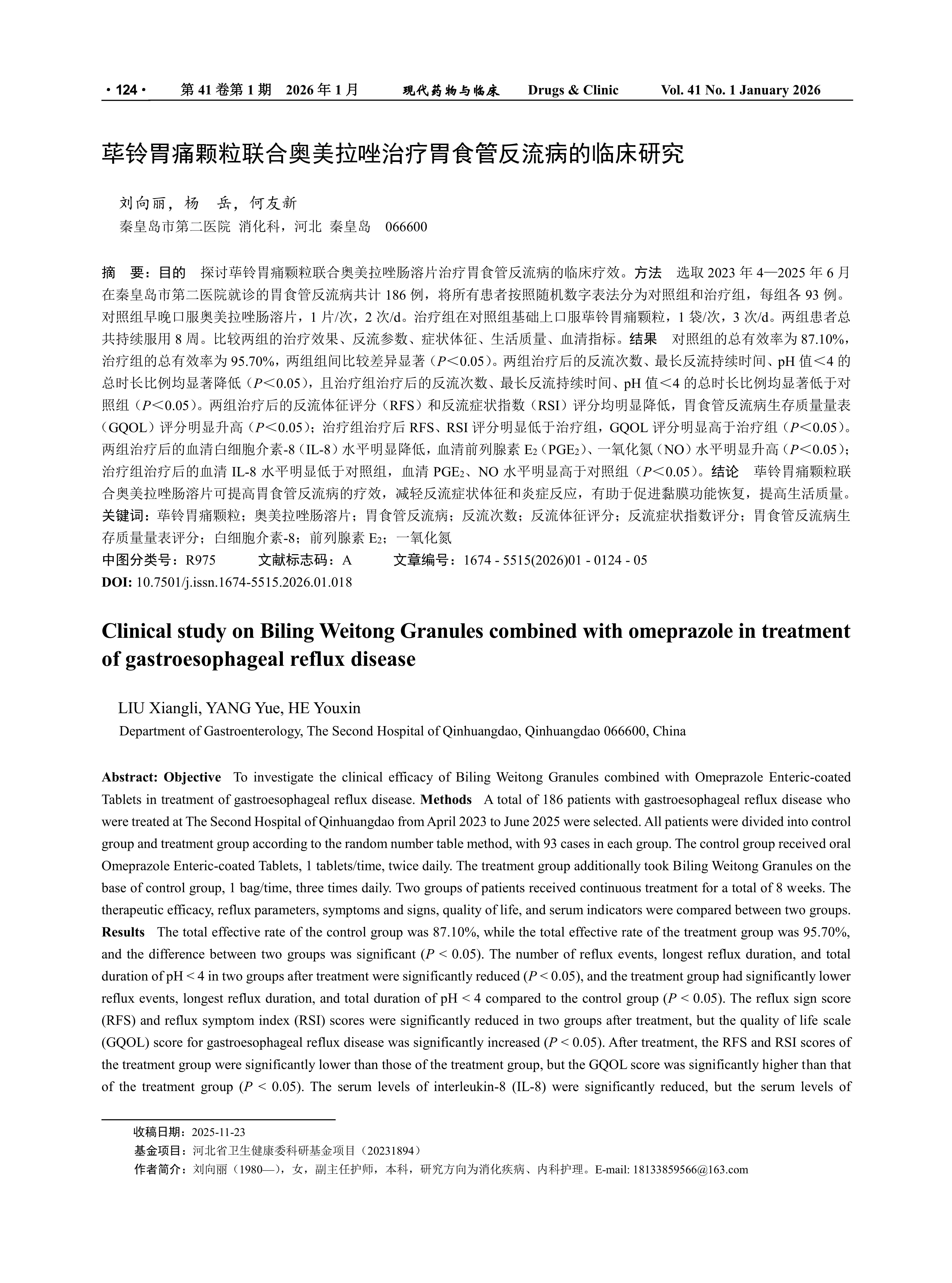 Objective To investigate the clinical efficacy of Biling Weitong Granules combined with Omeprazole Enteric-coated Tablets in treatment of gastroesophageal reflux disease. Methods A total of 186 patients with gastroesophageal reflux disease who were treated at The Second Hospital of Qinhuangdao from April 2023 to June 2025 were selected. All patients were divided into control group and treatment group according to the random number table method, with 93 cases in each group. The control group received oral Omeprazole Enteric-coated Tablets, 1 tablets/time, twice daily. The treatment group additionally took Biling Weitong Granules on the base of control group, 1 bag/time, three times daily. Two groups of patients received continuous treatment for a total of 8 weeks. The therapeutic efficacy, reflux parameters, symptoms and signs, quality of life, and serum indicators were compared between two groups. Results The total effective rate of the control group was 87.10%, while the total effective rate of the treatment group was 95.70%, and the difference between two groups was significant (P < 0.05). The number of reflux events, longest reflux duration, and total duration of pH < 4 in two groups after treatment were significantly reduced (P < 0.05), and the treatment group had significantly lower reflux events, longest reflux duration, and total duration of pH < 4 compared to the control group (P < 0.05). The reflux sign score (RFS) and reflux symptom index (RSI) scores were significantly reduced in two groups after treatment, but the quality of life scale (GQOL) score for gastroesophageal reflux disease was significantly increased (P < 0.05). After treatment, the RFS and RSI scores of the treatment group were significantly lower than those of the treatment group, but the GQOL score was significantly higher than that of the treatment group (P < 0.05). The serum levels of interleukin-8 (IL-8) were significantly reduced, but the serum levels of prostaglandin E2 (PGE2) and nitric oxide (NO) were significantly increased after treatment in two groups (P < 0.05). The serum levels of IL-8 in the treatment group were significantly lower than those in the control group after treatment, while the serum levels of PGE2 and NO were significantly higher than those in the control group (P < 0.05). Conclusion The combination of Biling Weitong Granules and Omeprazole Enteric-coated Tablets can improve the efficacy of gastroesophageal reflux disease, alleviate reflux symptoms, signs, and inflammatory reactions, help promote mucosal function recovery, and improve quality of life.