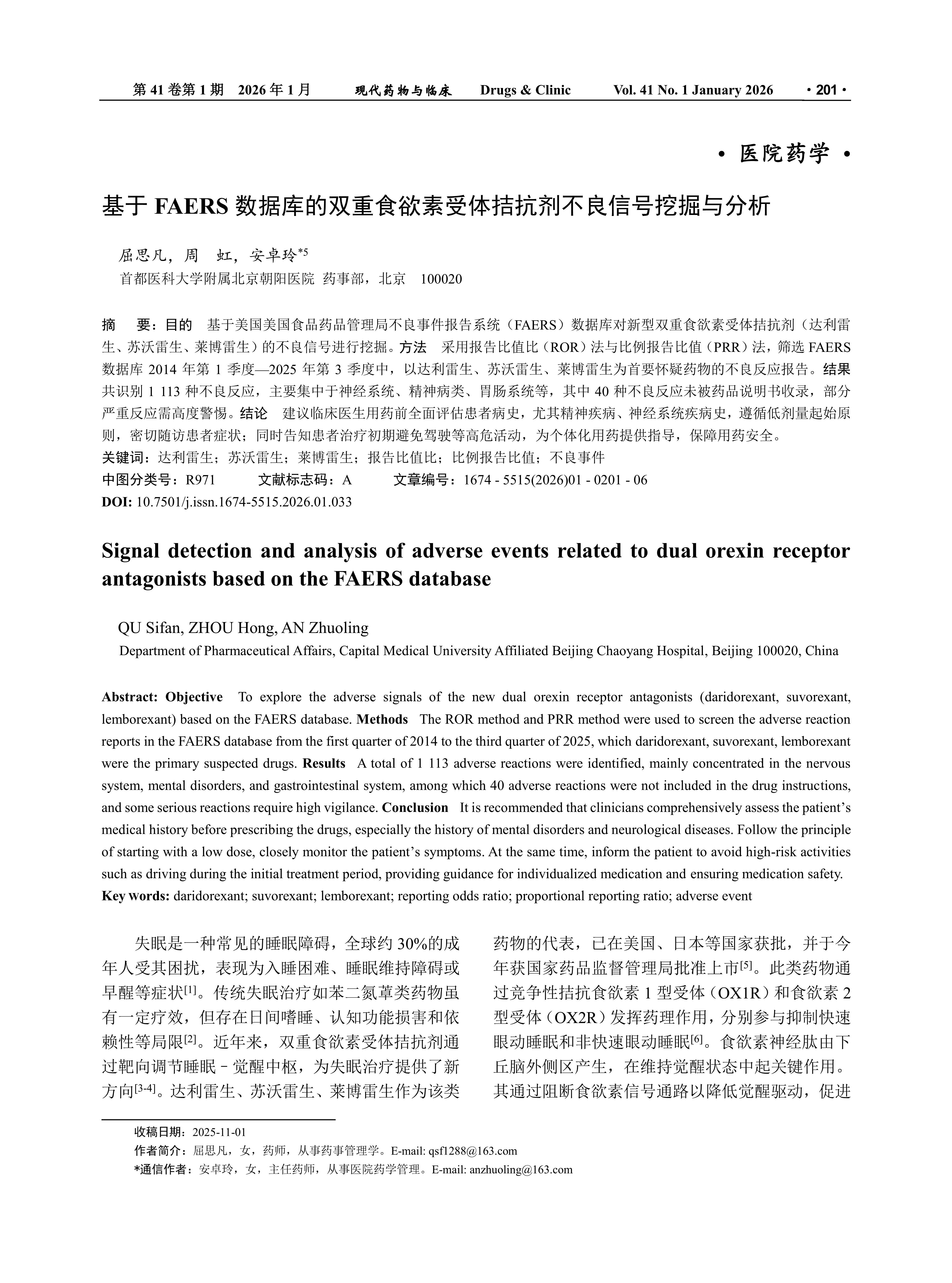 基于FAERS数据库的双重食欲素受体拮抗剂不良信号挖掘与分析