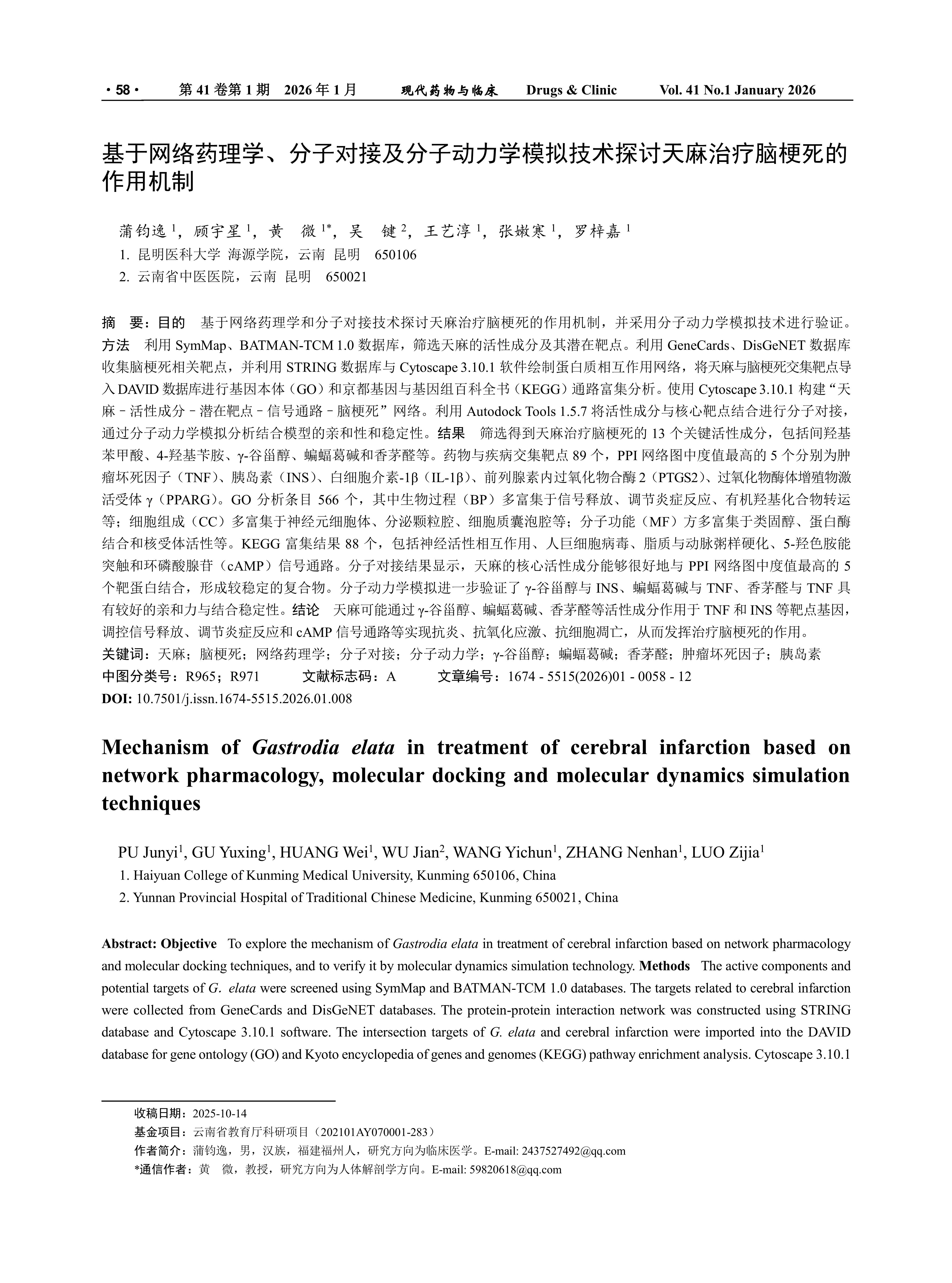 目的 基于网络药理学和分子对接技术探讨天麻治疗脑梗死的作用机制,并采用分子动力学模拟技术进行验证。方法 利用SymMap、BATMAN-TCM 1.0数据库,筛选天麻的活性成分及其潜在靶点。利用GeneCards、DisGeNET数据库收集脑梗死相关靶点,并利用STRING数据库与Cytoscape 3.10.1软件绘制蛋白质相互作用网络,将天麻与脑梗死交集靶点导入DAVID数据库进行基因本体(GO)和京都基因与基因组百科全书(KEGG)通路富集分析。使用Cytoscape 3.10.1构建“天麻–活性成分–潜在靶点–信号通路–脑梗死”网络。利用Autodock Tools 1.5.7将活性成分与核心靶点结合进行分子对接,通过分子动力学模拟分析结合模型的亲和性和稳定性。结果 筛选得到天麻治疗脑梗死的13个关键活性成分,包括间羟基苯甲酸、4-羟基苄胺、γ-谷甾醇、蝙蝠葛碱和香茅醛等。药物与疾病交集靶点89个,PPI网络图中度值最高的5个分别为肿瘤坏死因子(TNF)、胰岛素(INS)、白细胞介素-1β(IL-1β)、前列腺素内过氧化物合酶2(PTGS2)、过氧化物酶体增殖物激活受体γ(PPARG)。GO分析条目566个,其中生物过程(BP)多富集于信号释放、调节炎症反应、有机羟基化合物转运等;细胞组成(CC)多富集于神经元细胞体、分泌颗粒腔、细胞质囊泡腔等;分子功能(MF)方多富集于类固醇、蛋白酶结合和核受体活性等。KEGG富集结果88个,包括神经活性相互作用、人巨细胞病毒、脂质与动脉粥样硬化、5-羟色胺能突触和环磷酸腺苷(cAMP)信号通路。分子对接结果显示,天麻的核心活性成分能够很好地与PPI网络图中度值最高的5个靶蛋白结合,形成较稳定的复合物。分子动力学模拟进一步验证了γ-谷甾醇与INS、蝙蝠葛碱与TNF、香茅醛与TNF具有较好的亲和力与结合稳定性。结论 天麻可能通过γ-谷甾醇、蝙蝠葛碱、香茅醛等活性成分作用于TNF和INS等靶点基因,调控信号释放、调节炎症反应和cAMP信号通路等实现抗炎、抗氧化应激、抗细胞凋亡,从而发挥治疗脑梗死的作用。