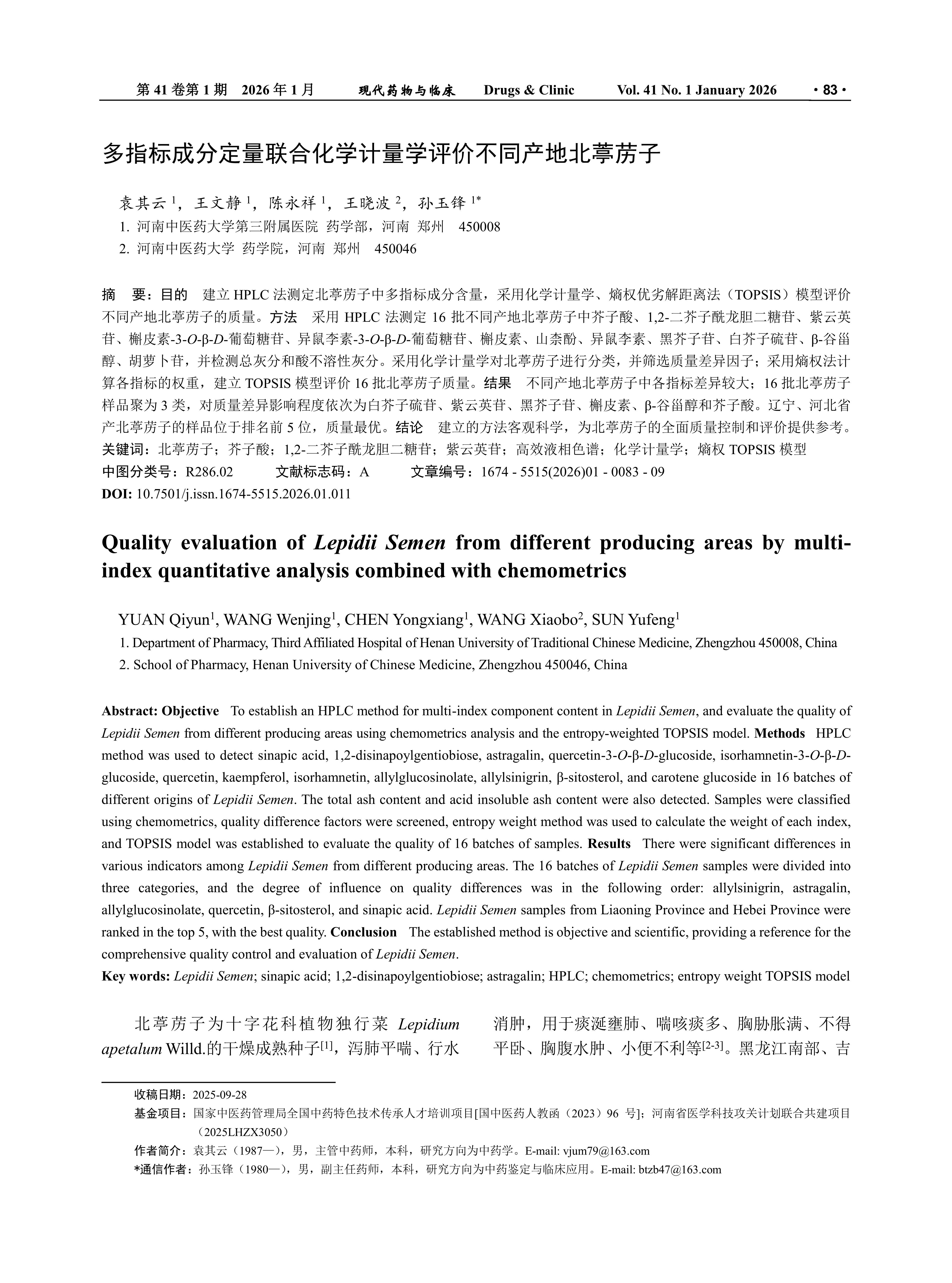 Objective To establish an HPLC method for multi-index component content in Lepidii Semen, and evaluate the quality of Lepidii Semen from different producing areas using chemometrics analysis and the entropy-weighted TOPSIS model. Methods HPLC method was used to detect sinapic acid, 1,2-disinapoylgentiobiose, astragalin, quercetin-3-O-β-D-glucoside, isorhamnetin-3-O-β-D-glucoside, quercetin, kaempferol, isorhamnetin, allylglucosinolate, allylsinigrin, β-sitosterol, and carotene glucoside in 16 batches of different origins of Lepidii Semen. The total ash content and acid insoluble ash content were also detected. Samples were classified using chemometrics, quality difference factors were screened, entropy weight method was used to calculate the weight of each index, and TOPSIS model was established to evaluate the quality of 16 batches of samples. Results There were significant differences in various indicators among Lepidii Semen from different producing areas. The 16 batches of Lepidii Semen samples were divided into three categories, and the degree of influence on quality differences was in the following order: allylsinigrin, astragalin, allylglucosinolate, quercetin, β-sitosterol, and sinapic acid. Lepidii Semen samples from Liaoning Province and Hebei Province were ranked in the top 5, with the best quality. Conclusion The established method is objective and scientific, providing a reference for the comprehensive quality control and evaluation of Lepidii Semen.