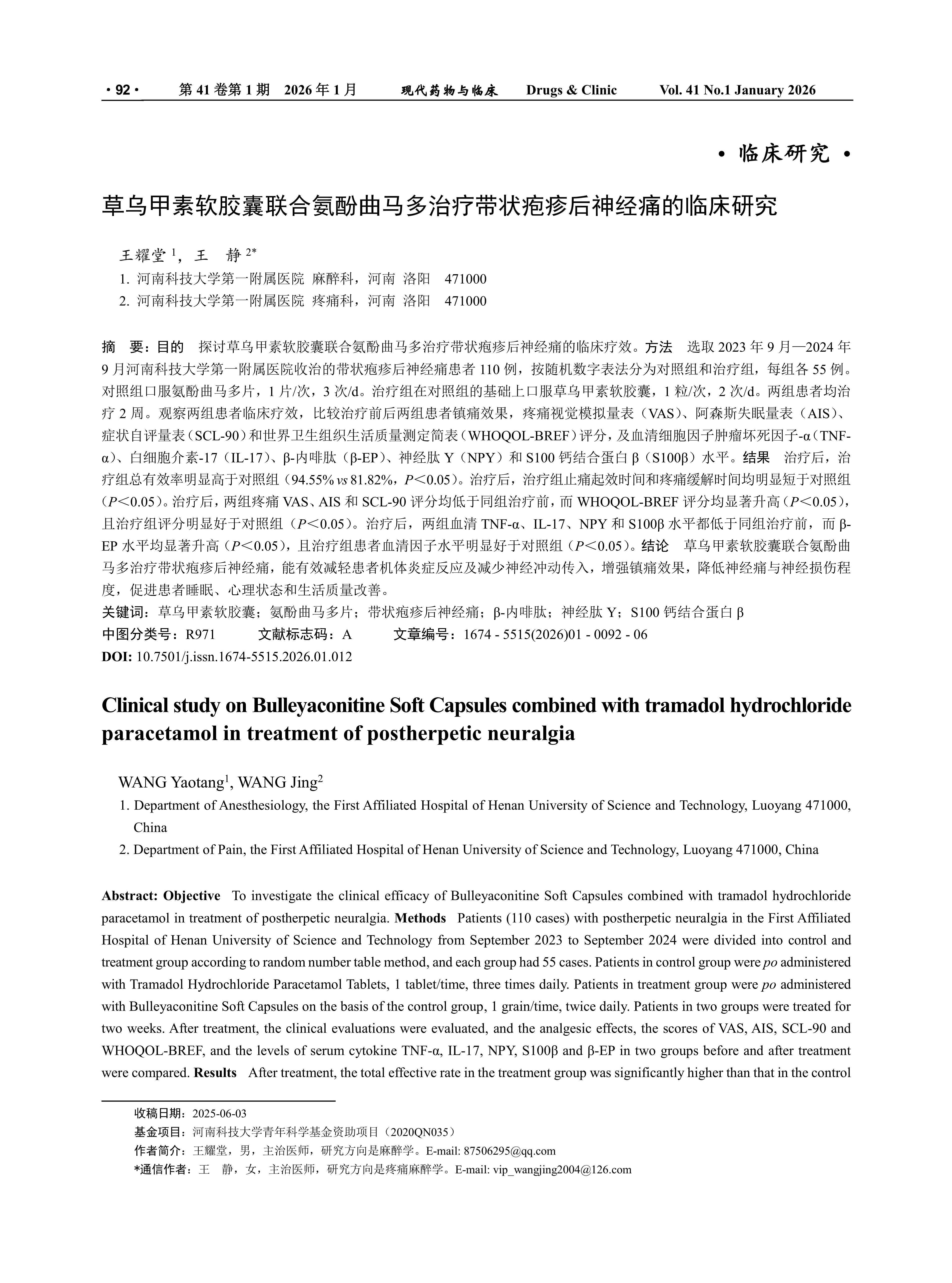 草乌甲素软胶囊联合氨酚曲马多治疗带状疱疹后神经痛的临床研究