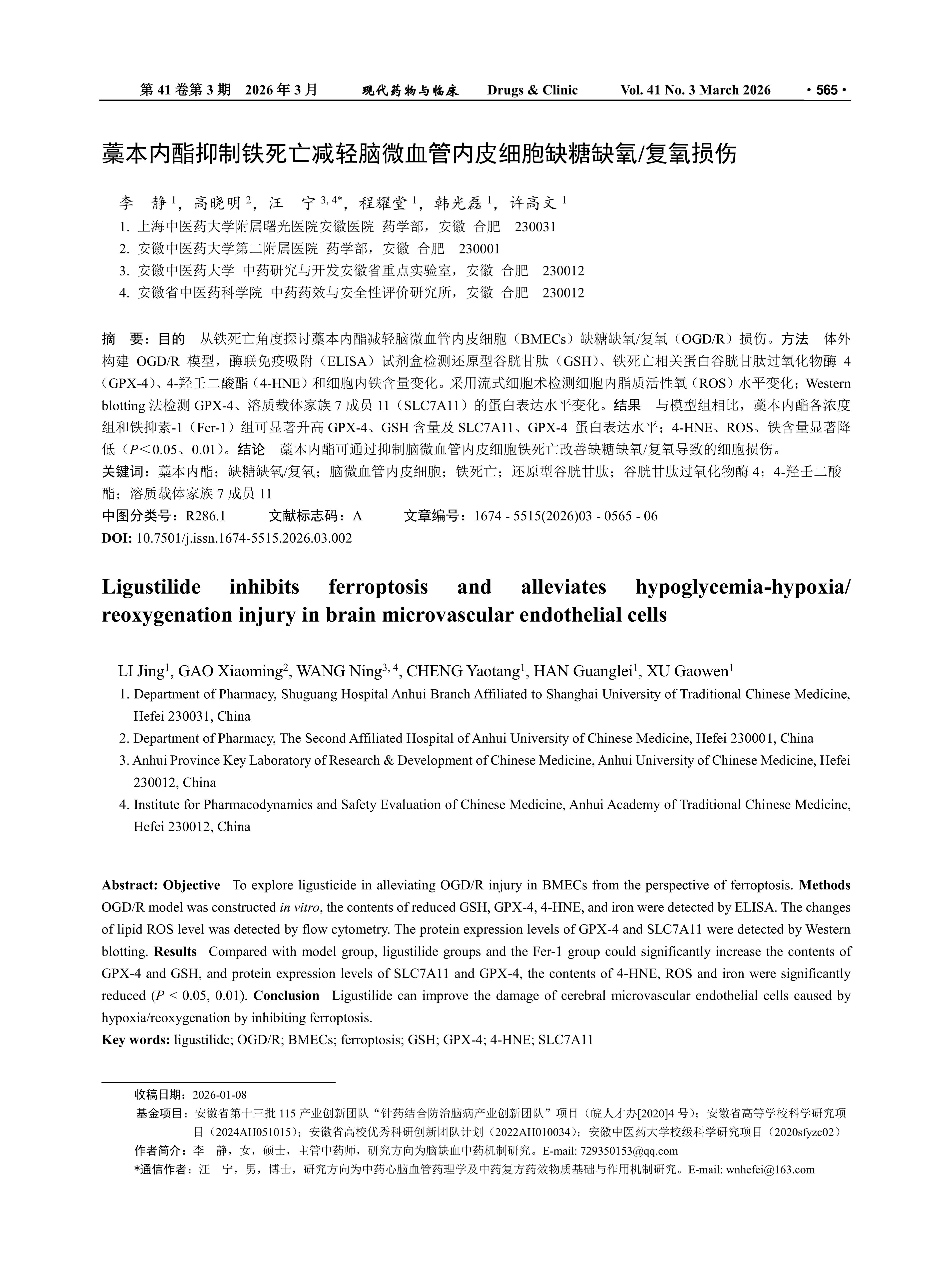 目的 从铁死亡角度探讨藁本内酯减轻脑微血管内皮细胞(BMECs)缺糖缺氧/复氧(OGD/R)损伤。方法 体外构建OGD/R模型,酶联免疫吸附(ELISA)试剂盒检测还原型谷胱甘肽(GSH)、铁死亡相关蛋白谷胱甘肽过氧化物酶4(GPX-4)、4-羟壬二酸酯(4-HNE)和细胞内铁含量变化。采用流式细胞术检测细胞内脂质活性氧(ROS)水平变化;Western blotting法检测GPX-4、溶质载体家族7成员11(SLC7A11)的蛋白表达水平变化。结果 与模型组相比,藁本内酯各浓度组和铁抑素-1(Fer-1)组可显著升高GPX-4、GSH含量及SLC7A11、GPX-4 蛋白表达水平;4-HNE、ROS、铁含量显著降低(P<0.05、0.01)。结论 藁本内酯可通过抑制脑微血管内皮细胞铁死亡改善缺糖缺氧/复氧导致的细胞损伤。