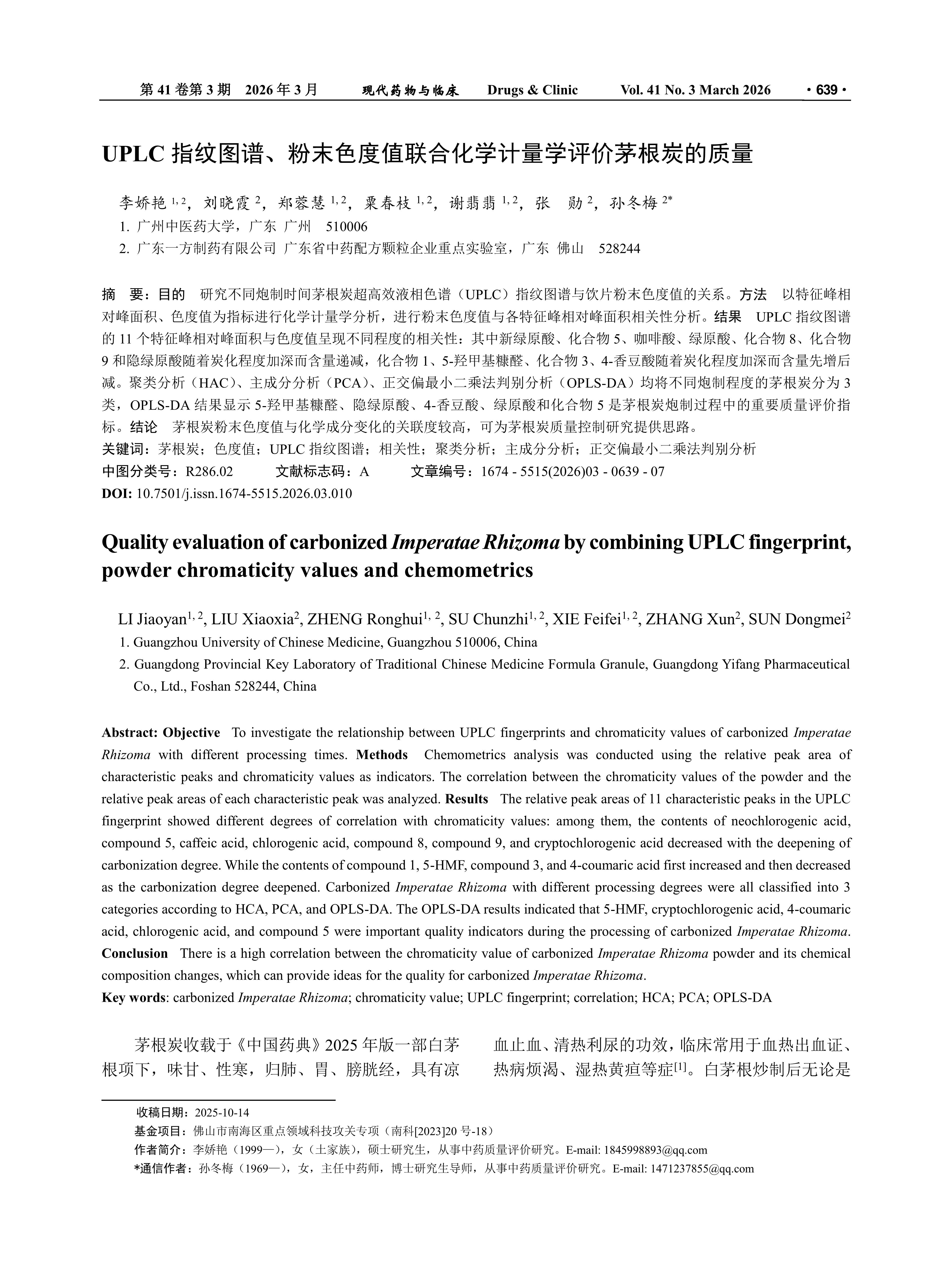 Objective To investigate the relationship between UPLC fingerprints and chromaticity values of carbonized Imperatae Rhizoma with different processing times. Methods Chemometrics analysis was conducted using the relative peak area of characteristic peaks and chromaticity values as indicators. The correlation between the chromaticity values of the powder and the relative peak areas of each characteristic peak was analyzed. Results The relative peak areas of 11 characteristic peaks in the UPLC fingerprint showed different degrees of correlation with chromaticity values: among them, the contents of neochlorogenic acid, compound 5, caffeic acid, chlorogenic acid, compound 8, compound 9, and cryptochlorogenic acid decreased with the deepening of carbonization degree. While the contents of compound 1, 5-HMF, compound 3, and 4-coumaric acid first increased and then decreased as the carbonization degree deepened. Carbonized Imperatae Rhizoma with different processing degrees were all classified into 3 categories according to HCA, PCA, and OPLS-DA. The OPLS-DA results indicated that 5-HMF, cryptochlorogenic acid, 4-coumaric acid, chlorogenic acid, and compound 5 were important quality indicators during the processing of carbonized Imperatae Rhizoma. Conclusion There is a high correlation between the chromaticity value of carbonized Imperatae Rhizoma powder and its chemical composition changes, which can provide ideas for the quality for carbonized Imperatae Rhizoma.