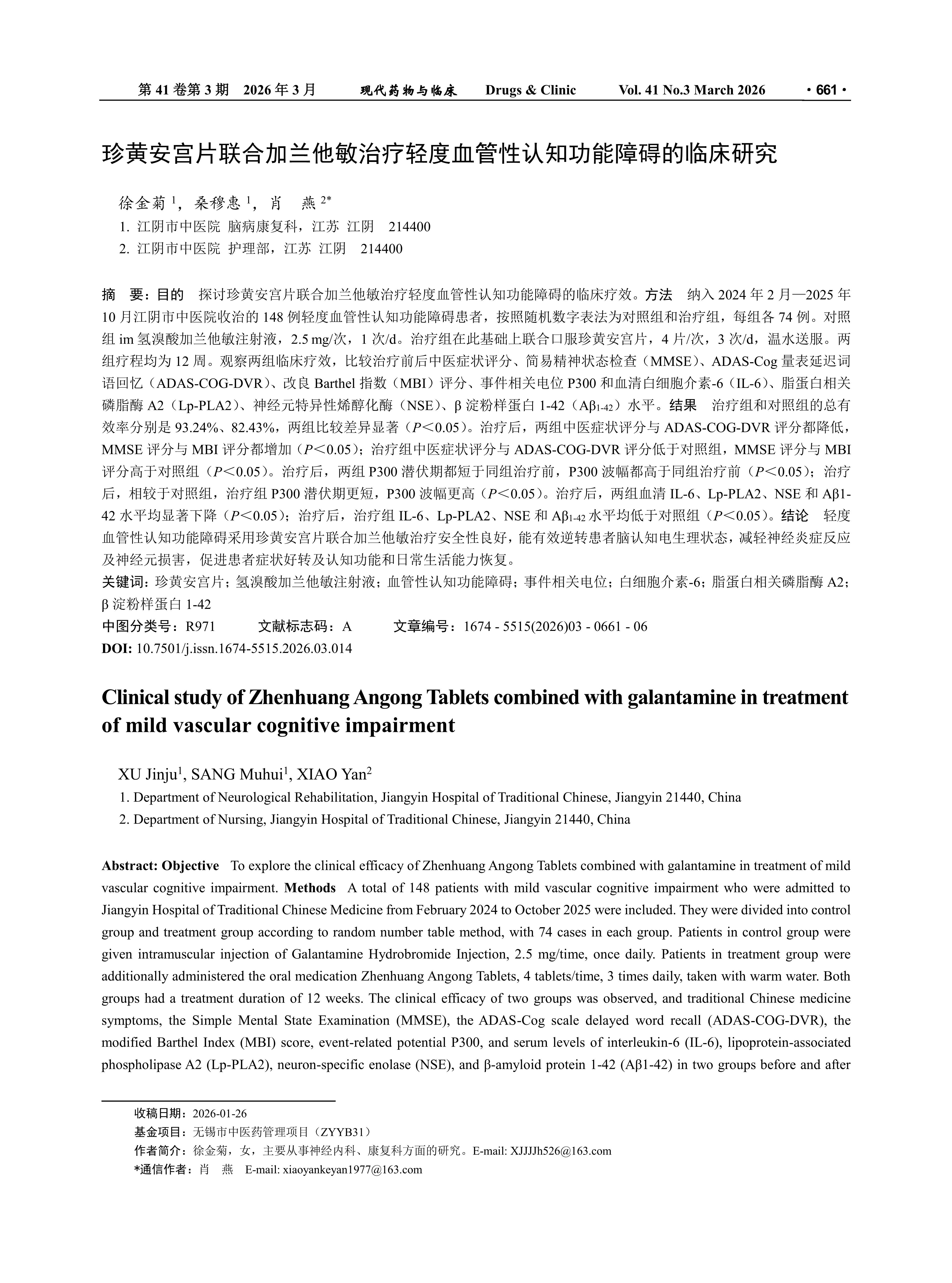 Objective To explore the clinical efficacy of Zhenhuang Angong Tablets combined with galantamine in treatment of mild vascular cognitive impairment. Methods A total of 148 patients with mild vascular cognitive impairment who were admitted to Jiangyin Hospital of Traditional Chinese Medicine from February 2024 to October 2025 were included. They were divided into control group and treatment group according to random number table method, with 74 cases in each group. Patients in control group were given intramuscular injection of Galantamine Hydrobromide Injection, 2.5 mg/time, once daily. Patients in treatment group were additionally administered the oral medication Zhenhuang Angong Tablets, 4 tablets/time, 3 times daily, taken with warm water. Both groups had a treatment duration of 12 weeks. The clinical efficacy of two groups was observed, and traditional Chinese medicine symptoms, the Simple Mental State Examination (MMSE), the ADAS-Cog scale delayed word recall (ADAS-COG-DVR), the modified Barthel Index (MBI) score, event-related potential P300, and serum levels of interleukin-6 (IL-6), lipoprotein-associated phospholipase A2 (Lp-PLA2), neuron-specific enolase (NSE), and β-amyloid protein 1-42 (Aβ1-42) in two groups before and after treatment were compared. Results After treatment, the total effective rates of treatment group and control group were 93.24% and 82.43%, respectively, there was a significant difference between two groups (P < 0.05). After treatment, the scores of traditional Chinese medicine symptoms and ADAS-COG-DVR in both groups decreased, but the MMSE score and MBI score increased (P < 0.05), the scores of traditional Chinese medicine symptoms and ADAS-COG-DVR in treatment group were lower than those in control group, and the MMSE score and MBI score were higher than those in control group (P < 0.05). After treatment, the P300 latency in both groups was shorter than that before treatment in the same group, and the P300 amplitude was higher than that before treatment in the same group (P < 0.05). After treatment, compared with control group, the P300 latency in treatment group was shorter and the P300 amplitude was higher (P < 0.05). After treatment, the levels of serum IL-6, Lp-PLA2, NSE, and Aβ1-42 in both groups significantly decreased (P < 0.05). After treatment, the levels of IL-6, Lp-PLA2, NSE, and Aβ1-42 in treatment group were lower than those in control group (P < 0.05). Conclusion The treatment of mild vascular cognitive impairment with Zhenhuang Angong Tablets combined with galantamine has good safety, and can effectively reverse the brain cognitive electrophysiological state of patients, alleviate neuroinflammatory responses and neuronal damage, and promote the improvement of patients’ symptoms and the recovery of cognitive function and daily living ability.