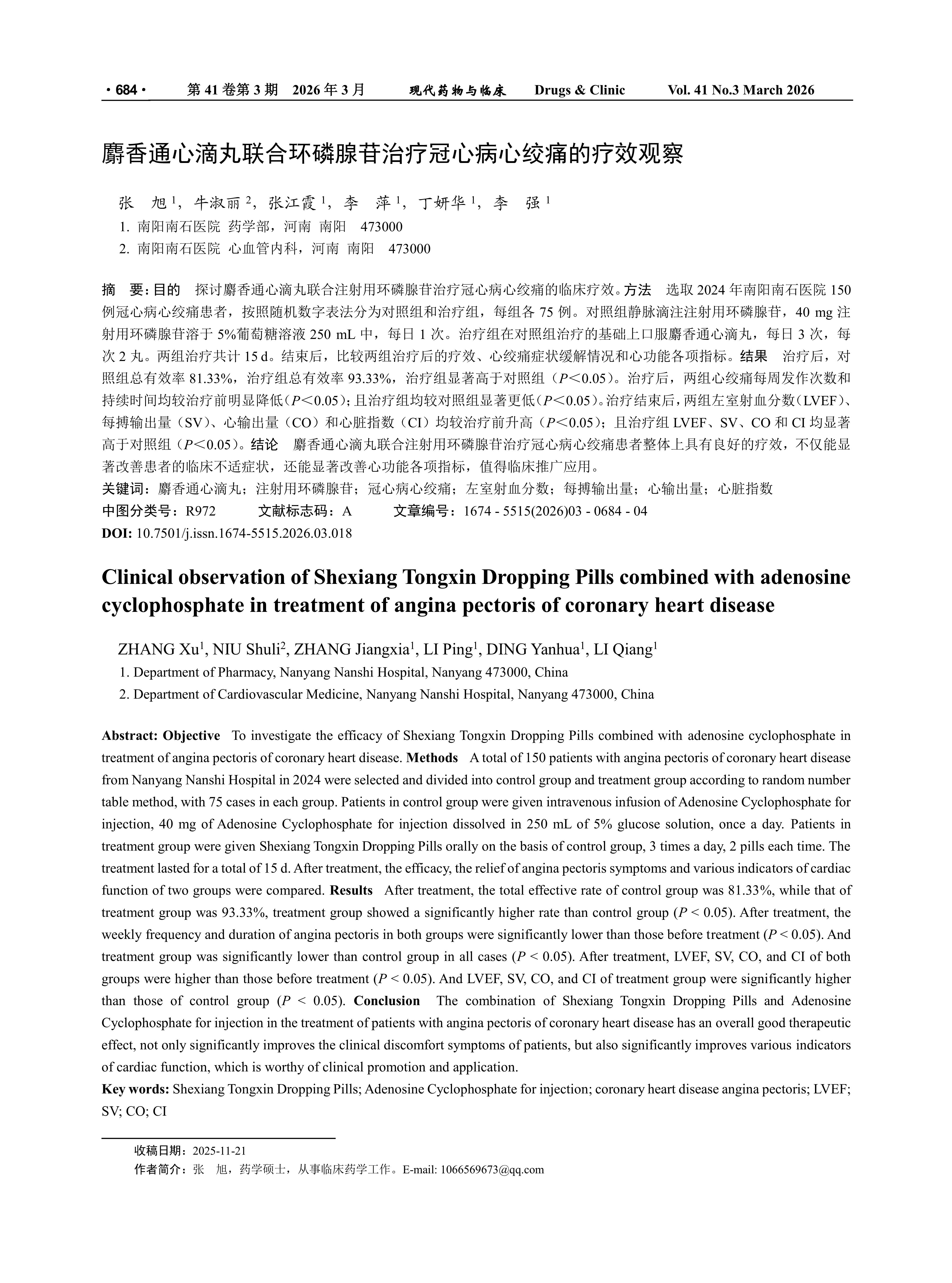 Clinical observation of Shexiang Tongxin Dropping Pills combined with adenosine cyclophosphate in treatment of angina pectoris of coronary heart disease