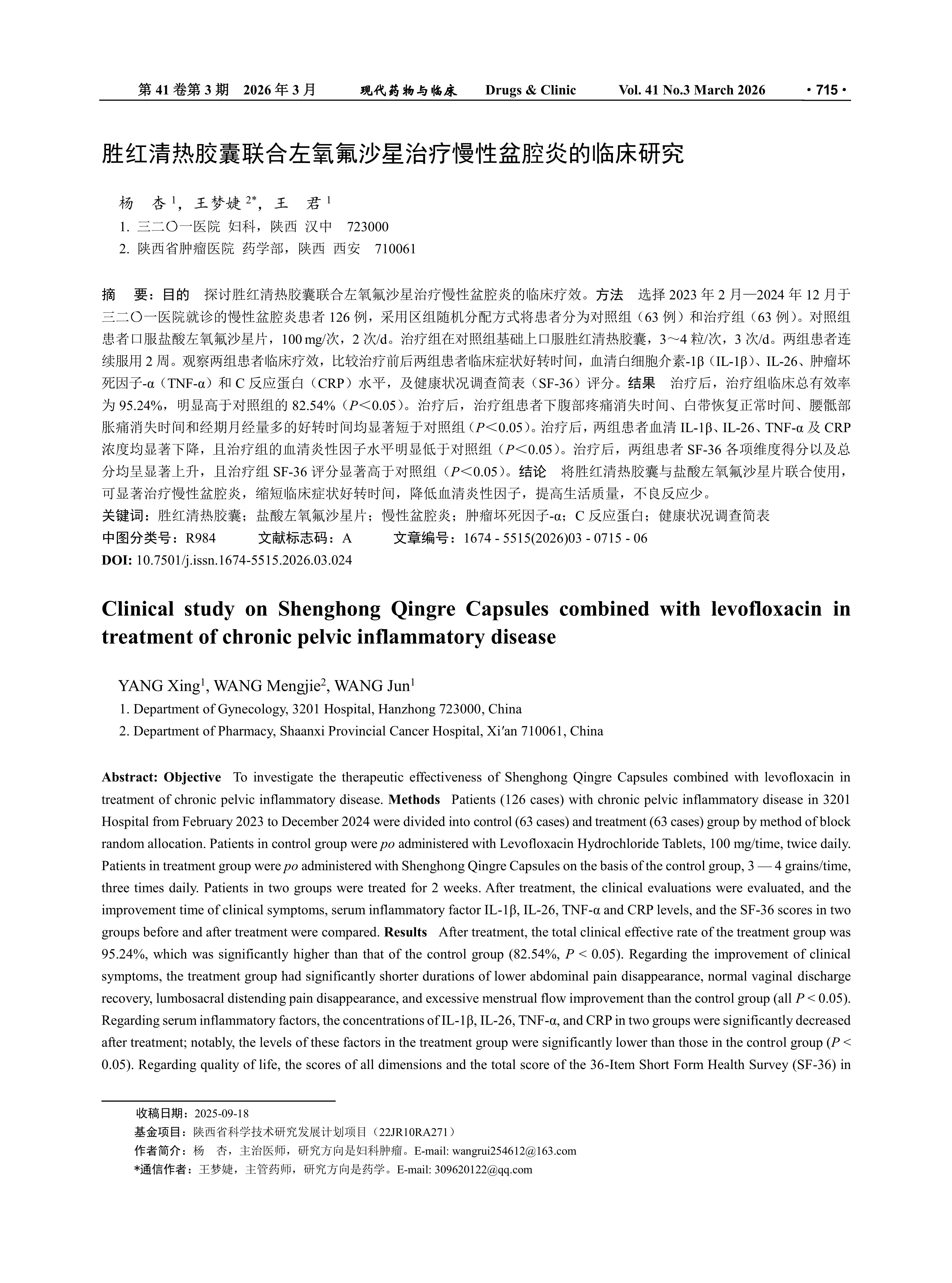 Objective To investigate the therapeutic effectiveness of Shenghong Qingre Capsules combined with levofloxacin in treatment of chronic pelvic inflammatory disease. Methods Patients (126 cases) with chronic pelvic inflammatory disease in 3201 Hospital from February 2023 to December 2024 were divided into control (63 cases) and treatment (63 cases) group by method of block random allocation. Patients in control group were po administered with Levofloxacin Hydrochloride Tablets, 100 mg/time, twice daily. Patients in treatment group were po administered with Shenghong Qingre Capsules on the basis of the control group, 3 — 4 grains/time, three times daily. Patients in two groups were treated for 2 weeks. After treatment, the clinical evaluations were evaluated, and the improvement time of clinical symptoms, serum inflammatory factor IL-1β, IL-26, TNF-α and CRP levels, and the SF-36 scores in two groups before and after treatment were compared. Results After treatment, the total clinical effective rate of the treatment group was 95.24%, which was significantly higher than that of the control group (82.54%, P < 0.05). Regarding the improvement of clinical symptoms, the treatment group had significantly shorter durations of lower abdominal pain disappearance, normal vaginal discharge recovery, lumbosacral distending pain disappearance, and excessive menstrual flow improvement than the control group (all P < 0.05). Regarding serum inflammatory factors, the concentrations of IL-1β, IL-26, TNF-α, and CRP in two groups were significantly decreased after treatment; notably, the levels of these factors in the treatment group were significantly lower than those in the control group (P < 0.05). Regarding quality of life, the scores of all dimensions and the total score of the 36-Item Short Form Health Survey (SF-36) in two groups was significantly increased after treatment, and those in the treatment group were significantly higher than those in the control group (P < 0.05). Conclusion The combination of Shenghong Qingre Capsules and Levofloxacin Hydrochloride Tablets can effectively treat chronic pelvic inflammatory disease, shorten the time for clinical symptom improvement, reduce serum inflammatory factors, improve quality of life, and have fewer adverse reactions.