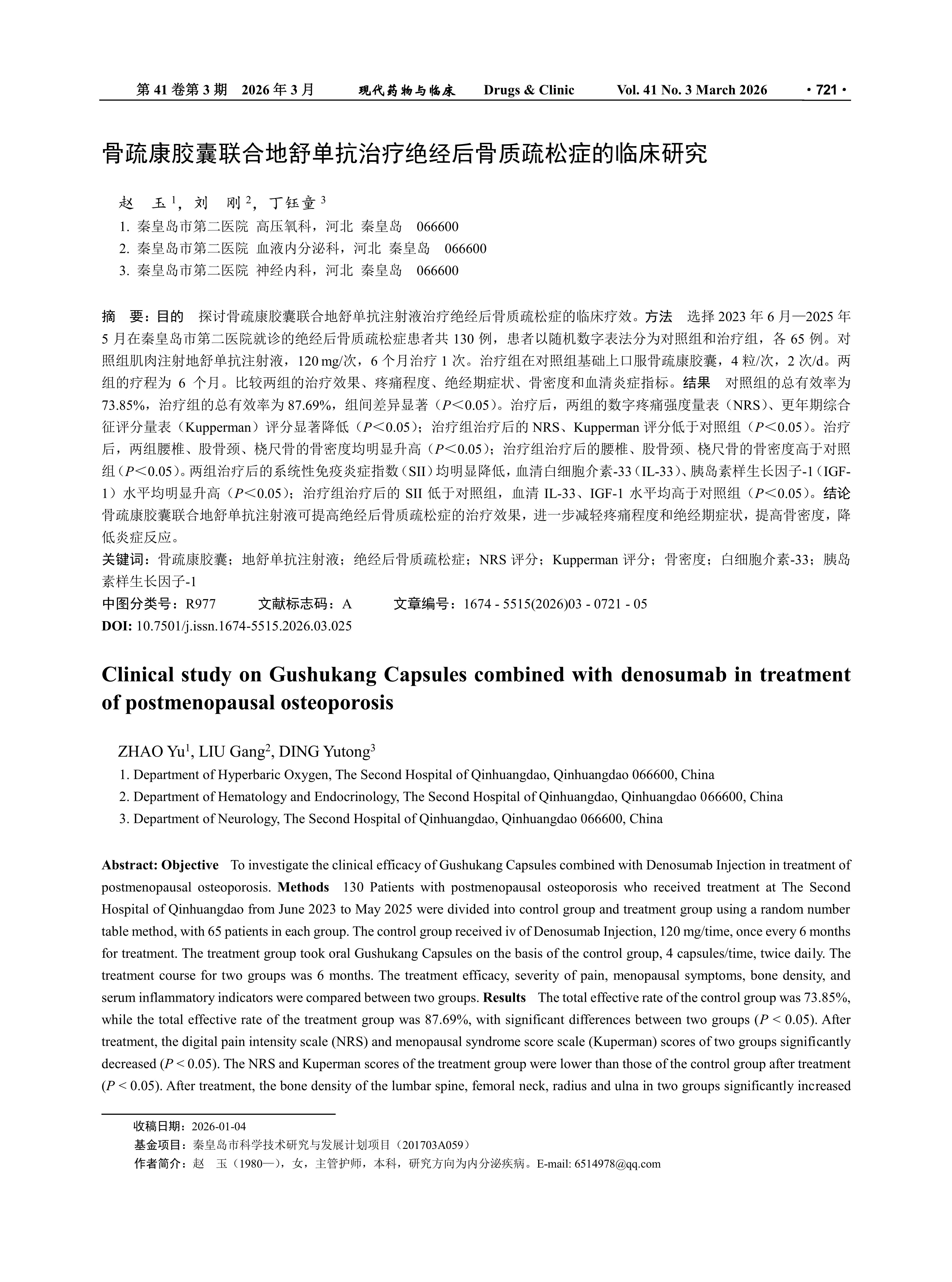 Objective To investigate the clinical efficacy of Gushukang Capsules combined with Denosumab Injection in treatment of postmenopausal osteoporosis. Methods 130 Patients with postmenopausal osteoporosis who received treatment at The Second Hospital of Qinhuangdao from June 2023 to May 2025 were divided into control group and treatment group using a random number table method, with 65 patients in each group. The control group received iv of Denosumab Injection, 120 mg/time, once every 6 months for treatment. The treatment group took oral Gushukang Capsules on the basis of the control group, 4 capsules/time, twice daily. The treatment course for two groups was 6 months. The treatment efficacy, severity of pain, menopausal symptoms, bone density, and serum inflammatory indicators were compared between two groups. Results The total effective rate of the control group was 73.85%, while the total effective rate of the treatment group was 87.69%, with significant differences between two groups (P < 0.05). After treatment, the digital pain intensity scale (NRS) and menopausal syndrome score scale (Kuperman) scores of two groups significantly decreased (P < 0.05). The NRS and Kuperman scores of the treatment group were lower than those of the control group after treatment (P < 0.05). After treatment, the bone density of the lumbar spine, femoral neck, radius and ulna in two groups significantly increased (P < 0.05), and the bone density of the lumbar spine, femoral neck, radius and ulna in the treatment group was higher than that in the control group (P < 0.05). The systemic immune inflammatory index (SII) was significantly reduced in two groups after treatment, but the serum levels of interleukin-33 (IL-33) and insulin-like growth factor-1 (IGF-1) were significantly increased (P < 0.05). The SII level in the treatment group was lower than that in the control group after treatment, but the serum levels of IL-33 and IGF-1 were higher than those in the control group (P < 0.05). Conclusion Gushukang Capsules combined with Denosumab Injection can provide therapeutic effects for postmenopausal osteoporosis, further reducing pain intensity and menopausal symptoms, improving bone density, reducing inflammatory responses.