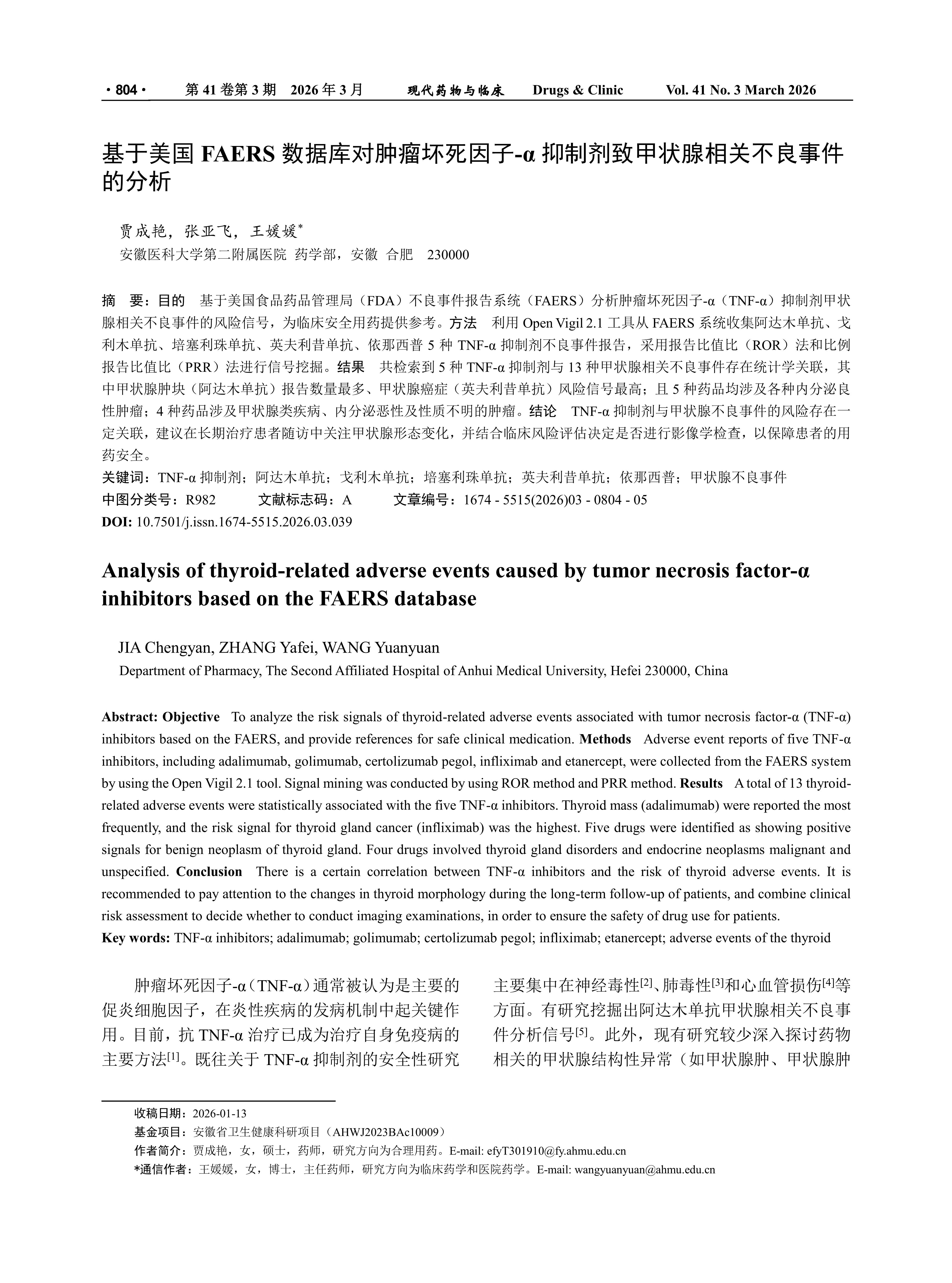 Objective To analyze the risk signals of thyroid-related adverse events associated with tumor necrosis factor-α (TNF-α) inhibitors based on the FAERS, and provide references for safe clinical medication. Methods Adverse event reports of five TNF-α inhibitors, including adalimumab, golimumab, certolizumab pegol, infliximab and etanercept, were collected from the FAERS system by using the Open Vigil 2.1 tool. Signal mining was conducted by using ROR method and PRR method. Results A total of 13 thyroid-related adverse events were statistically associated with the five TNF-α inhibitors. Thyroid mass (adalimumab) were reported the most frequently, and the risk signal for thyroid gland cancer (infliximab) was the highest. Five drugs were identified as showing positive signals for benign neoplasm of thyroid gland. Four drugs involved thyroid gland disorders and endocrine neoplasms malignant and unspecified. Conclusion There is a certain correlation between TNF-α inhibitors and the risk of thyroid adverse events. It is recommended to pay attention to the changes in thyroid morphology during the long-term follow-up of patients, and combine clinical risk assessment to decide whether to conduct imaging examinations, in order to ensure the safety of drug use for patients.