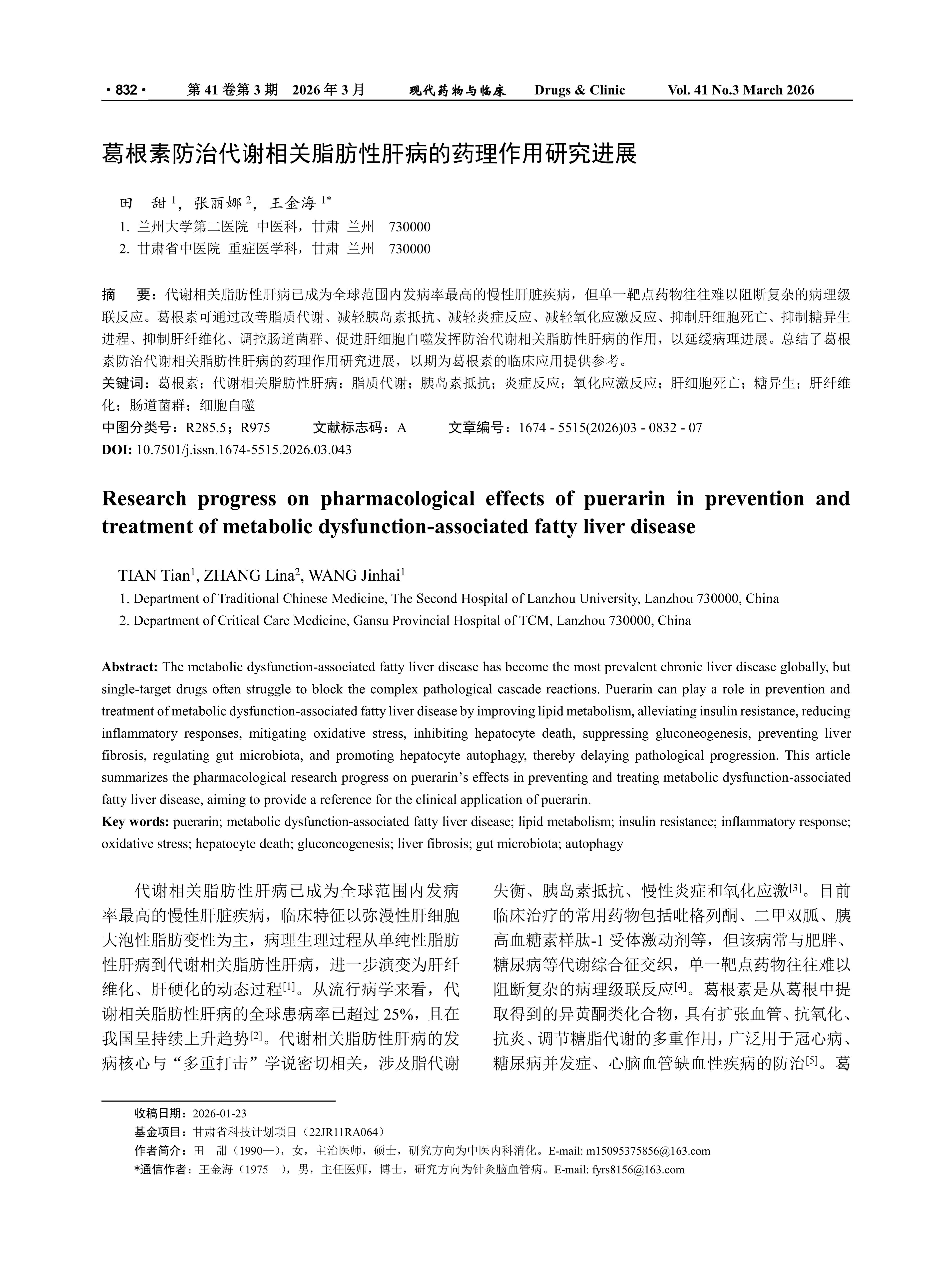 The metabolic dysfunction-associated fatty liver disease has become the most prevalent chronic liver disease globally, but single-target drugs often struggle to block the complex pathological cascade reactions. Puerarin can play a role in prevention and treatment of metabolic dysfunction-associated fatty liver disease by improving lipid metabolism, alleviating insulin resistance, reducing inflammatory responses, mitigating oxidative stress, inhibiting hepatocyte death, suppressing gluconeogenesis, preventing liver fibrosis, regulating gut microbiota, and promoting hepatocyte autophagy, thereby delaying pathological progression. This article summarizes the pharmacological research progress on puerarin’s effects in preventing and treating metabolic dysfunction-associated fatty liver disease, aiming to provide a reference for the clinical application of puerarin.