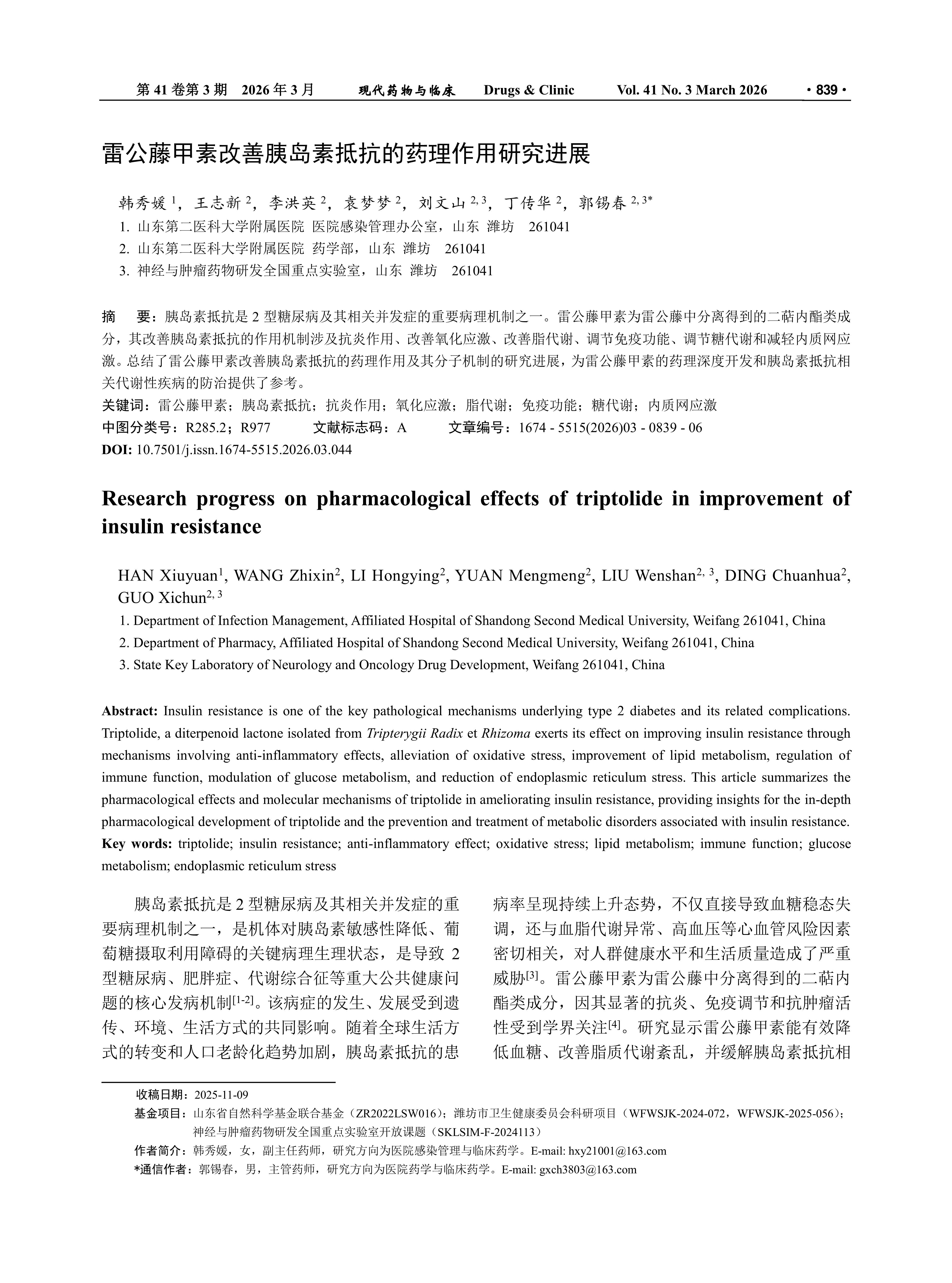 Insulin resistance is one of the key pathological mechanisms underlying type 2 diabetes and its related complications. Triptolide, a diterpenoid lactone isolated from Tripterygii Radix et Rhizoma exerts its effect on improving insulin resistance through mechanisms involving anti-inflammatory effects, alleviation of oxidative stress, improvement of lipid metabolism, regulation of immune function, modulation of glucose metabolism, and reduction of endoplasmic reticulum stress. This article summarizes the pharmacological effects and molecular mechanisms of triptolide in ameliorating insulin resistance, providing insights for the in-depth pharmacological development of triptolide and the prevention and treatment of metabolic disorders associated with insulin resistance.