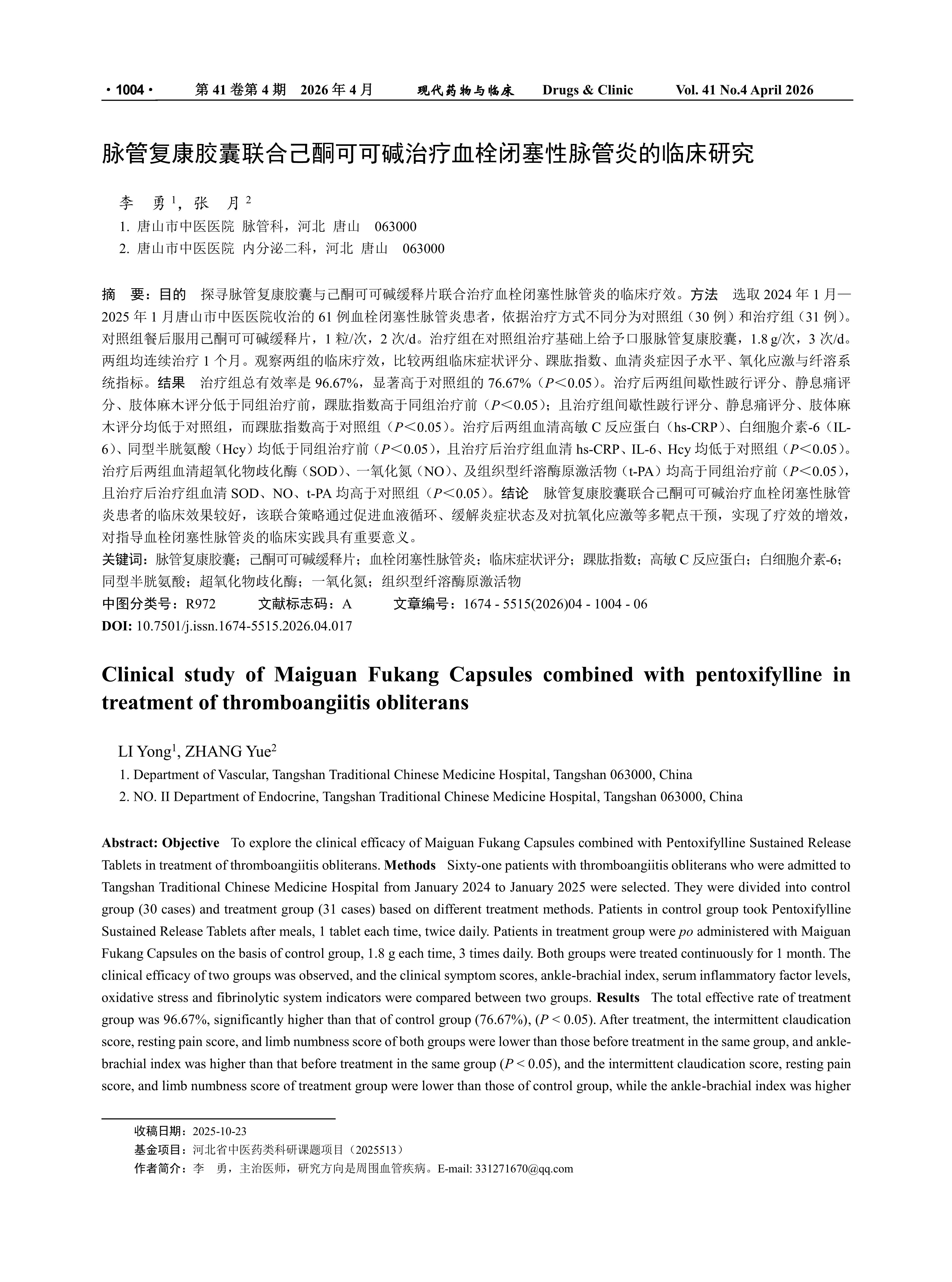Objective To explore the clinical efficacy of Maiguan Fukang Capsules combined with Pentoxifylline Sustained Release Tablets in treatment of thromboangiitis obliterans. Methods Sixty-one patients with thromboangiitis obliterans who were admitted to Tangshan Traditional Chinese Medicine Hospital from January 2024 to January 2025 were selected. They were divided into control group (30 cases) and treatment group (31 cases) based on different treatment methods. Patients in control group took Pentoxifylline Sustained Release Tablets after meals, 1 tablet each time, twice daily. Patients in treatment group were po administered with Maiguan Fukang Capsules on the basis of control group, 1.8 g each time, 3 times daily. Both groups were treated continuously for 1 month. The clinical efficacy of two groups was observed, and the clinical symptom scores, ankle-brachial index, serum inflammatory factor levels, oxidative stress and fibrinolytic system indicators were compared between two groups. Results The total effective rate of treatment group was 96.67%, significantly higher than that of control group (76.67%), (P < 0.05). After treatment, the intermittent claudication score, resting pain score, and limb numbness score of both groups were lower than those before treatment in the same group, and ankle-brachial index was higher than that before treatment in the same group (P < 0.05), and the intermittent claudication score, resting pain score, and limb numbness score of treatment group were lower than those of control group, while the ankle-brachial index was higher than that of the control group (P < 0.05). After treatment, hs-CRP, IL-6, and Hcy of both groups were lower than those before treatment in the same group (P< 0.05), and the serum hs-CRP, IL-6, and Hcy of treatment group were lower than those of the control group after treatment (P < 0.05). After treatment, the serum SOD, NO, and t-PA of both groups were higher than those before treatment in the same group (P < 0.05), and the serum SOD, NO, and t-PA of treatment group were higher than those of control group after treatment (P < 0.05). Conclusion The clinical effect of Maiguan Fukang Capsules combined with pentoxifylline in treatment of thromboangiitis obliterans is quite good. This combined strategy achieves enhanced efficacy through multiple-target interventions such as promoting blood circulation, alleviating inflammatory conditions, and combating oxidative stress, which is of great significance for guiding clinical practice in thromboangiitis obliterans.