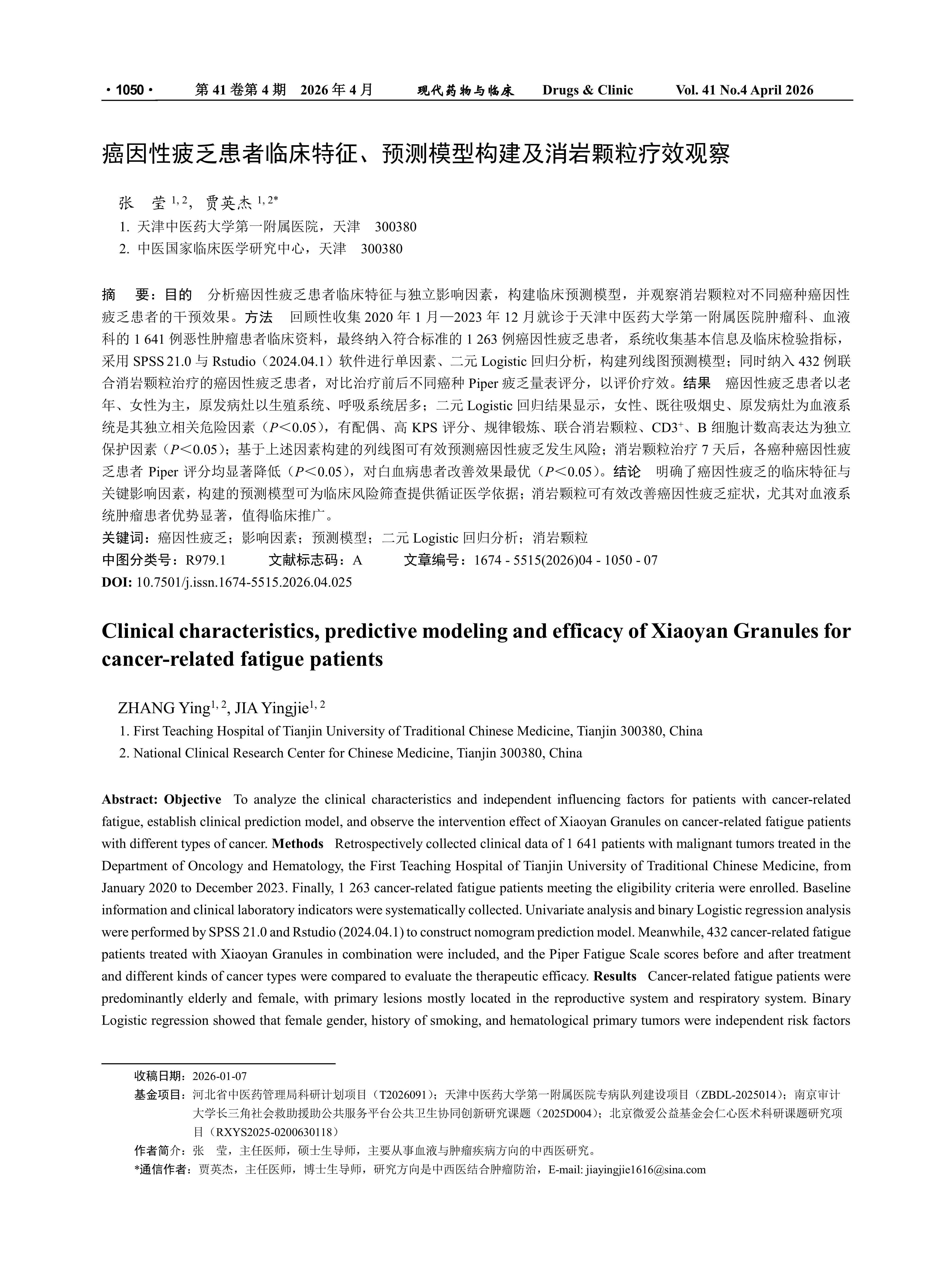 Objective To analyze the clinical characteristics and independent influencing factors for patients with cancer-related fatigue, establish clinical prediction model, and observe the intervention effect of Xiaoyan Granules on cancer-related fatigue patients with different types of cancer. Methods Retrospectively collected clinical data of 1 641 patients with malignant tumors treated in the Department of Oncology and Hematology, the First Teaching Hospital of Tianjin University of Traditional Chinese Medicine, from January 2020 to December 2023. Finally, 1 263 cancer-related fatigue patients meeting the eligibility criteria were enrolled. Baseline information and clinical laboratory indicators were systematically collected. Univariate analysis and binary Logistic regression analysis were performed by SPSS 21.0 and Rstudio (2024.04.1) to construct nomogram prediction model. Meanwhile, 432 cancer-related fatigue patients treated with Xiaoyan Granules in combination were included, and the Piper Fatigue Scale scores before and after treatment and different kinds of cancer types were compared to evaluate the therapeutic efficacy. Results Cancer-related fatigue patients were predominantly elderly and female, with primary lesions mostly located in the reproductive system and respiratory system. Binary Logistic regression showed that female gender, history of smoking, and hematological primary tumors were independent risk factors (P < 0.05), whereas having a spouse, high Karnofsky Performance Status (KPS) score, regular physical exercise, combined use of Xiaoyan Granules, and high expression of CD3+ and B-cell counts were independent protective factors (P < 0.05). The nomogram constructed based on the above factors could effectively predict the risk of cancer-related fatigue. After 7 days of Xiaoyan Granules treatment, Piper scores were significantly decreased for cancer-related fatigue patients with all types of cancer (P < 0.05), with the most prominent improvement observed in leukemia patients (P < 0.05). Conclusion The study identifies the clinical characteristics and key influencing factors of cancer-related fatigue, and prediction model can provide evidence-based medical evidence for clinical risk screening. Xiaoyan Granules can effectively alleviate cancer-related fatigue symptoms, especially in patients with hematological malignancies, and worthy of clinical promotion.