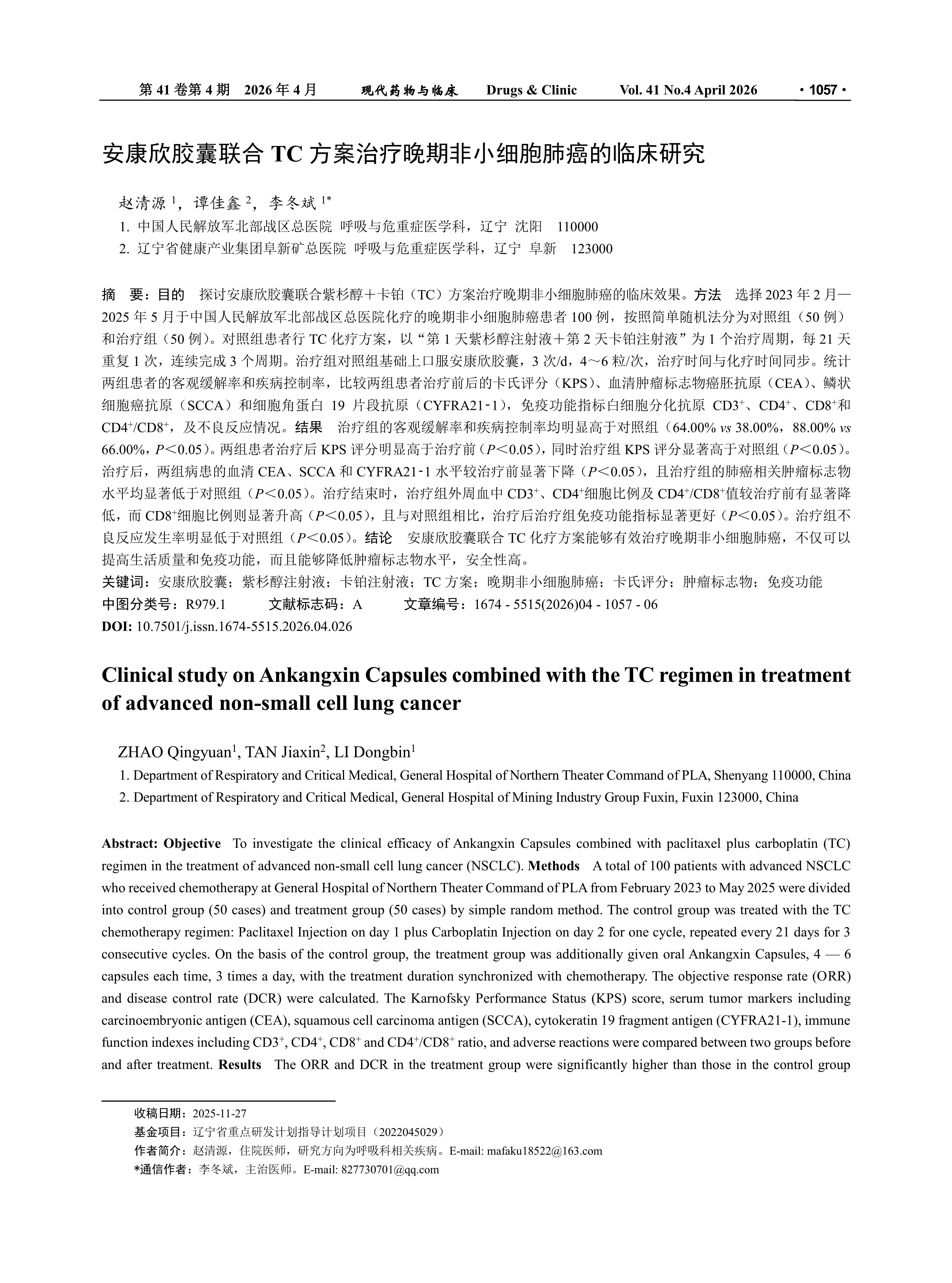Objective To investigate the clinical efficacy of Ankangxin Capsules combined with paclitaxel plus carboplatin (TC) regimen in the treatment of advanced non‑small cell lung cancer (NSCLC). Methods A total of 100 patients with advanced NSCLC who received chemotherapy at General Hospital of Northern Theater Command of PLA from February 2023 to May 2025 were divided into control group (50 cases) and treatment group (50 cases) by simple random method. The control group was treated with the TC chemotherapy regimen: Paclitaxel Injection on day 1 plus Carboplatin Injection on day 2 for one cycle, repeated every 21 days for 3 consecutive cycles. On the basis of the control group, the treatment group was additionally given oral Ankangxin Capsules, 4 — 6 capsules each time, 3 times a day, with the treatment duration synchronized with chemotherapy. The objective response rate (ORR) and disease control rate (DCR) were calculated. The Karnofsky Performance Status (KPS) score, serum tumor markers including carcinoembryonic antigen (CEA), squamous cell carcinoma antigen (SCCA), cytokeratin 19 fragment antigen (CYFRA21‑1), immune function indexes including CD3+, CD4+, CD8+ and CD4+/CD8+ ratio, and adverse reactions were compared between two groups before and after treatment. Results The ORR and DCR in the treatment group were significantly higher than those in the control group (64.00% vs 38.00%, 88.00% vs 66.00%, both P < 0.05). After treatment, the KPS scores in two groups were significantly higher than those before treatment (P < 0.05), and the KPS score in the treatment group was markedly higher than that in the control group (P < 0.05). After treatment, the serum levels of CEA, SCCA and CYFRA21‑1 in both groups were significantly lower than those before treatment (P < 0.05), and the levels of lung cancer‑related tumor markers in the treatment group were notably lower than those in the control group (P < 0.05). At the end of treatment, the percentages of CD3+ and CD4+ cells and the CD4+/CD8+ ratio in peripheral blood in the treatment group were significantly increased, while the percentage of CD8+ cells was significantly decreased (P < 0.05); compared with the control group, the immune function indexes in the treatment group were significantly better (P < 0.05). The incidence of adverse reactions in the treatment group was significantly lower than that in the control group (P < 0.05). Conclusion Ankangxin Capsules combined with TC chemotherapy regimen is effective in the treatment of advanced NSCLC, which can not only improve quality of life and immune function, but also reduce the levels of tumor markers, with high safety.