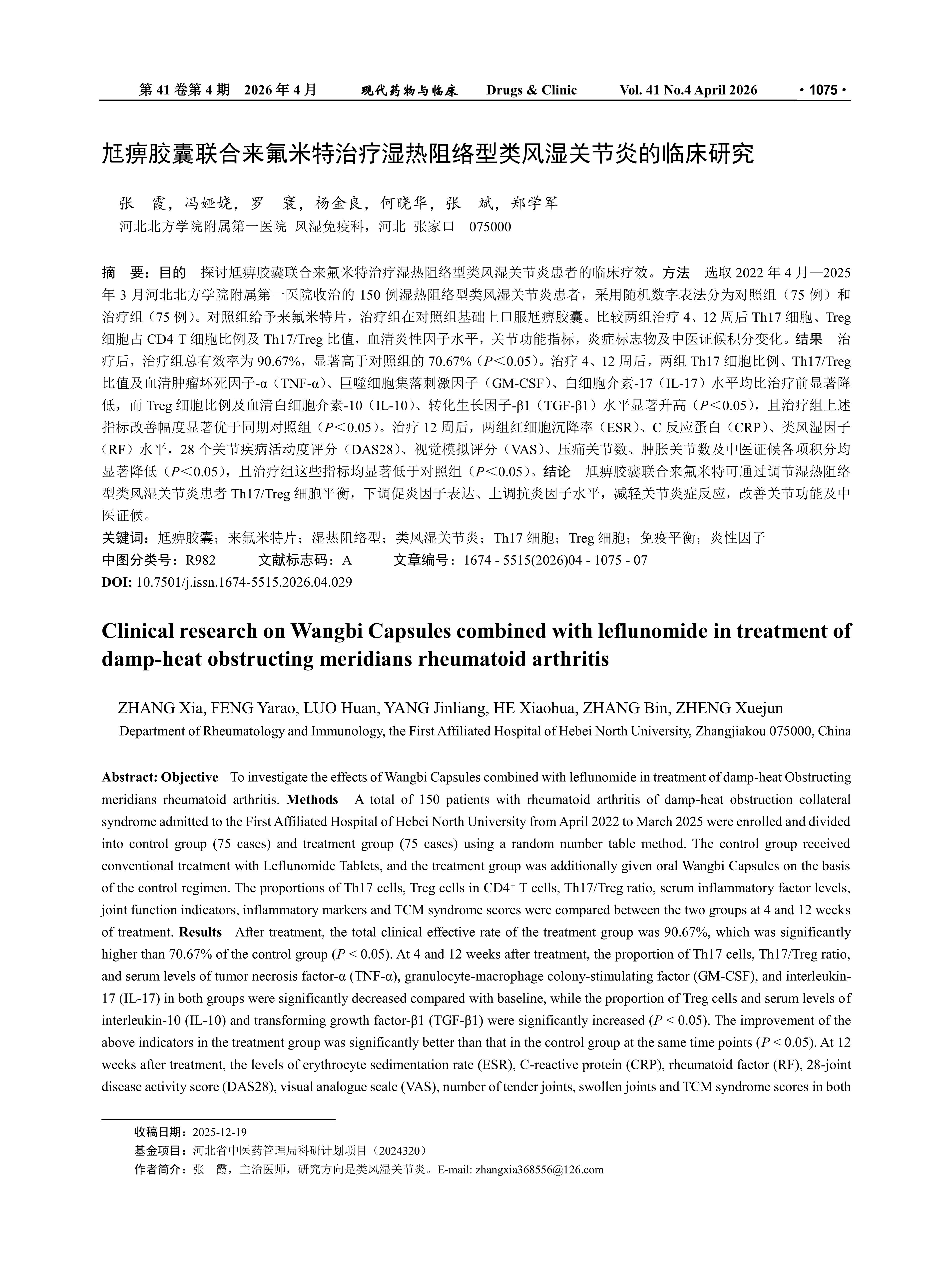 Objective To investigate the effects of Wangbi Capsules combined with leflunomide in treatment of damp-heat Obstructing meridians rheumatoid arthritis. Methods A total of 150 patients with rheumatoid arthritis of damp-heat obstruction collateral syndrome admitted to the First Affiliated Hospital of Hebei North University from April 2022 to March 2025 were enrolled and divided into control group (75 cases) and treatment group (75 cases) using a random number table method. The control group received conventional treatment with Leflunomide Tablets, and the treatment group was additionally given oral Wangbi Capsules on the basis of the control regimen. The proportions of Th17 cells, Treg cells in CD4⁺ T cells, Th17/Treg ratio, serum inflammatory factor levels, joint function indicators, inflammatory markers and TCM syndrome scores were compared between the two groups at 4 and 12 weeks of treatment. Results After treatment, the total clinical effective rate of the treatment group was 90.67%, which was significantly higher than 70.67% of the control group (P < 0.05). At 4 and 12 weeks after treatment, the proportion of Th17 cells, Th17/Treg ratio, and serum levels of tumor necrosis factor-α (TNF-α), granulocyte-macrophage colony-stimulating factor (GM-CSF), and interleukin-17 (IL-17) in both groups were significantly decreased compared with baseline, while the proportion of Treg cells and serum levels of interleukin-10 (IL-10) and transforming growth factor-β1 (TGF-β1) were significantly increased (P < 0.05). The improvement of the above indicators in the treatment group was significantly better than that in the control group at the same time points (P < 0.05). At 12 weeks after treatment, the levels of erythrocyte sedimentation rate (ESR), C-reactive protein (CRP), rheumatoid factor (RF), 28-joint disease activity score (DAS28), visual analogue scale (VAS), number of tender joints, swollen joints and TCM syndrome scores in both groups were significantly decreased (P < 0.05), and all these indicators in the treatment group were significantly lower than those in the control group (P < 0.05). Conclusion Wangbi Capsules combined with leflunomide can regulate Th17/Treg cell balance in patients with rheumatoid arthritis of damp-heat obstruction collateral syndrome, down-regulate pro-inflammatory factors and up-regulate anti-inflammatory factors, alleviate joint inflammation, improve joint function and TCM syndromes, with favorable safety.