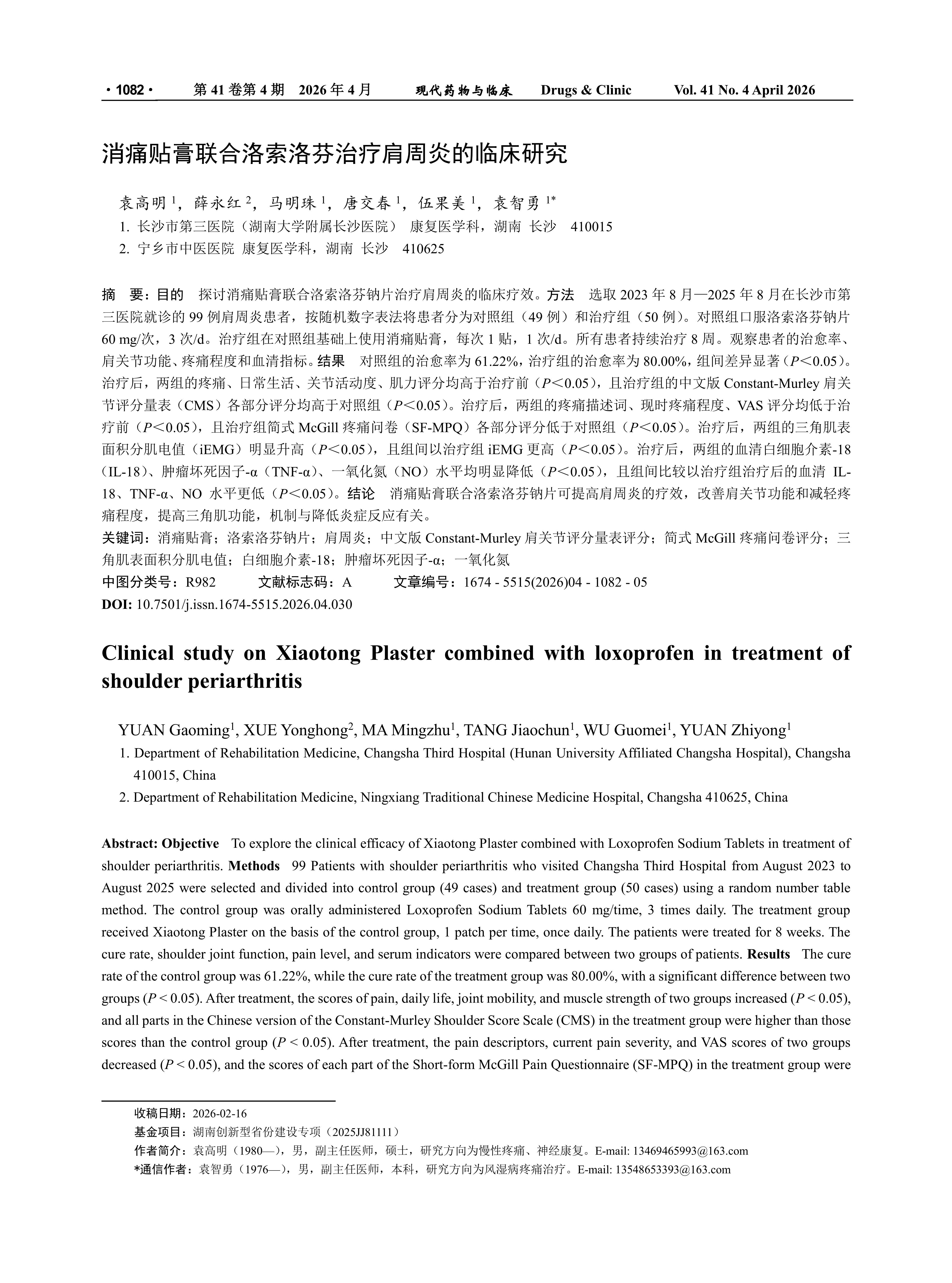 Objective To explore the clinical efficacy of Xiaotong Plaster combined with Loxoprofen Sodium Tablets in treatment of shoulder periarthritis. Methods 99 Patients with shoulder periarthritis who visited Changsha Third Hospital from August 2023 to August 2025 were selected and divided into control group (49 cases) and treatment group (50 cases) using a random number table method. The control group was orally administered Loxoprofen Sodium Tablets 60 mg/time, 3 times daily. The treatment group received Xiaotong Plaster on the basis of the control group, 1 patch per time, once daily. The patients were treated for 8 weeks. The cure rate, shoulder joint function, pain level, and serum indicators were compared between two groups of patients. Results The cure rate of the control group was 61.22%, while the cure rate of the treatment group was 80.00%, with a significant difference between two groups (P< 0.05). After treatment, the scores of pain, daily life, joint mobility, and muscle strength of two groups increased (P < 0.05), and all parts in the Chinese version of the Constant-Murley Shoulder Score Scale (CMS) in the treatment group were higher than those scores than the control group (P< 0.05). After treatment, the pain descriptors, current pain severity, and VAS scores of two groups decreased (P < 0.05), and the scores of each part of the Short-form McGill Pain Questionnaire (SF-MPQ) in the treatment group were lower than those in the control group (P < 0.05). After treatment, the surface area electromyography (iEMG) of the deltoid muscle in two groups significantly increased (P < 0.05), and the iEMG of the treatment group was higher than that of the control group (P < 0.05). After treatment, the serum levels of interleukin-18 (IL-18), tumor necrosis factor-α (TNF-α), and nitric oxide (NO) in two groups were significantly reduced (P < 0.05), and the serum levels of IL-18, TNF-α, and NO in the treatment group were lower than those in the control group (P < 0.05). Conclusion The combination of Xiaotong Plaster and Loxoprofen Sodium Tablets can enhance the efficacy in treatment of shoulder periarthritis, improve shoulder joint function, reduce pain levels, and enhance deltoid function, with the mechanism related to the reduction of inflammatory responses.