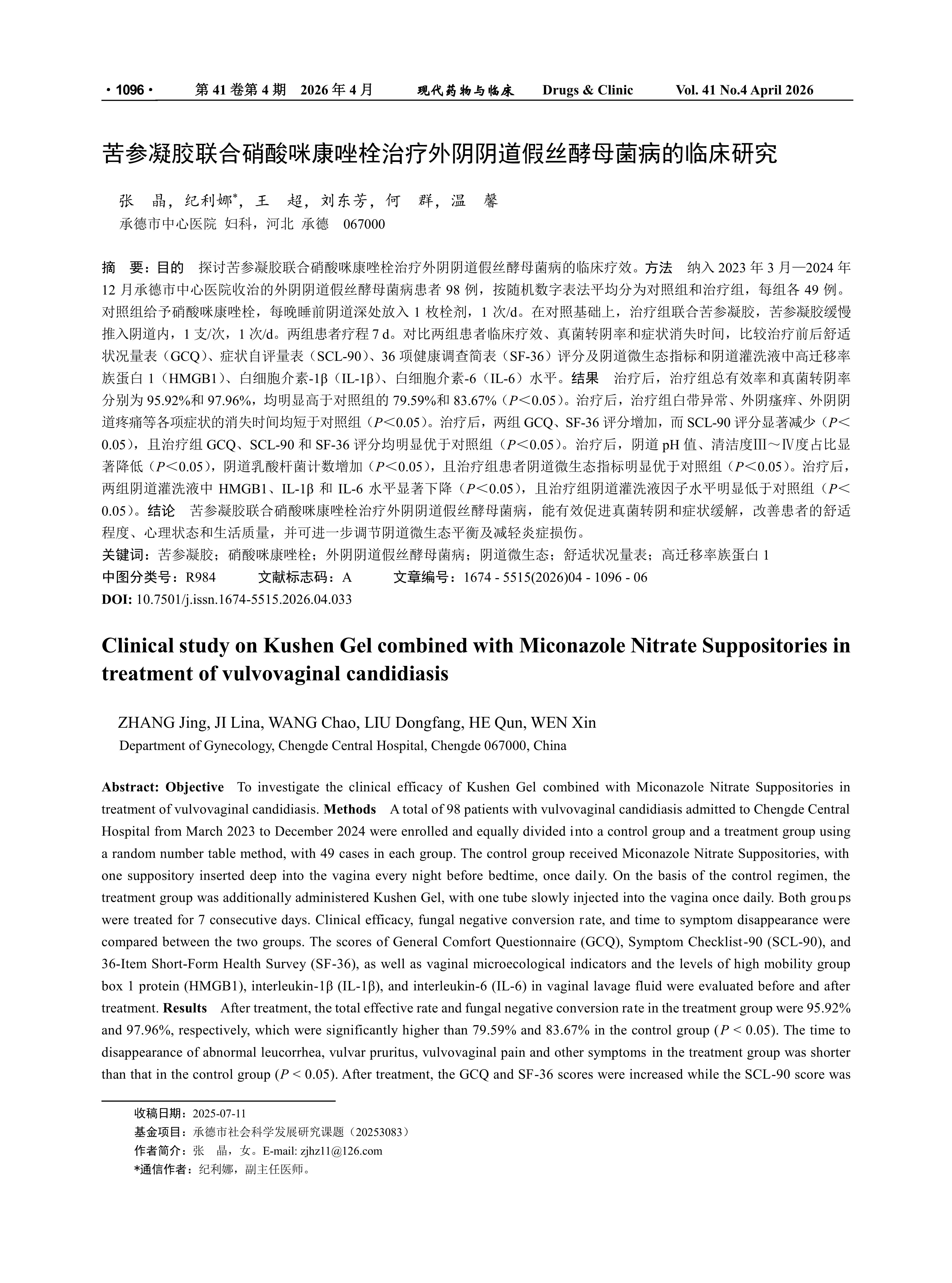 Objective To investigate the clinical efficacy of Kushen Gel combined with Miconazole Nitrate Suppositories in treatment of vulvovaginal candidiasis. Methods A total of 98 patients with vulvovaginal candidiasis admitted to Chengde Central Hospital from March 2023 to December 2024 were enrolled and equally divided into a control group and a treatment group using a random number table method, with 49 cases in each group. The control group received Miconazole Nitrate Suppositories, with one suppository inserted deep into the vagina every night before bedtime, once daily. On the basis of the control regimen, the treatment group was additionally administered Kushen Gel, with one tube slowly injected into the vagina once daily. Both groups were treated for 7 consecutive days. Clinical efficacy, fungal negative conversion rate, and time to symptom disappearance were compared between the two groups. The scores of General Comfort Questionnaire (GCQ), Symptom Checklist-90 (SCL-90), and 36-Item Short-Form Health Survey (SF-36), as well as vaginal microecological indicators and the levels of high mobility group box 1 protein (HMGB1), interleukin-1β (IL-1β), and interleukin-6 (IL-6) in vaginal lavage fluid were evaluated before and after treatment. Results After treatment, the total effective rate and fungal negative conversion rate in the treatment group were 95.92% and 97.96%, respectively, which were significantly higher than 79.59% and 83.67% in the control group (P < 0.05). The time to disappearance of abnormal leucorrhea, vulvar pruritus, vulvovaginal pain and other symptoms in the treatment group was shorter than that in the control group (P < 0.05). After treatment, the GCQ and SF-36 scores were increased while the SCL-90 score was significantly decreased in two groups (P < 0.05), and the scores in the treatment group were significantly better than those in the control group (P < 0.05). After treatment, vaginal pH value and the proportion of cleanliness grade Ⅲ-Ⅳ were significantly decreased (P < 0.05), and the count of vaginal Lactobacillus was increased (P < 0.05), the vaginal microecological indicators in the treatment group were significantly better than those in the control group (P < 0.05). After treatment, the levels of HMGB1, IL-1β and IL-6 in vaginal lavage fluid were significantly decreased in both groups (P < 0.05), and which in the treatment group were significantly lower than in the control group (P < 0.05). Conclusion Kushen Gel combined with Miconazole Nitrate Suppositories is effective in the treatment of vulvovaginal candidiasis. It can effectively promote fungal negative conversion and symptom relief, improve patient comfort, psychological status and quality of life, further regulate vaginal microecological balance, and alleviate inflammatory injury.