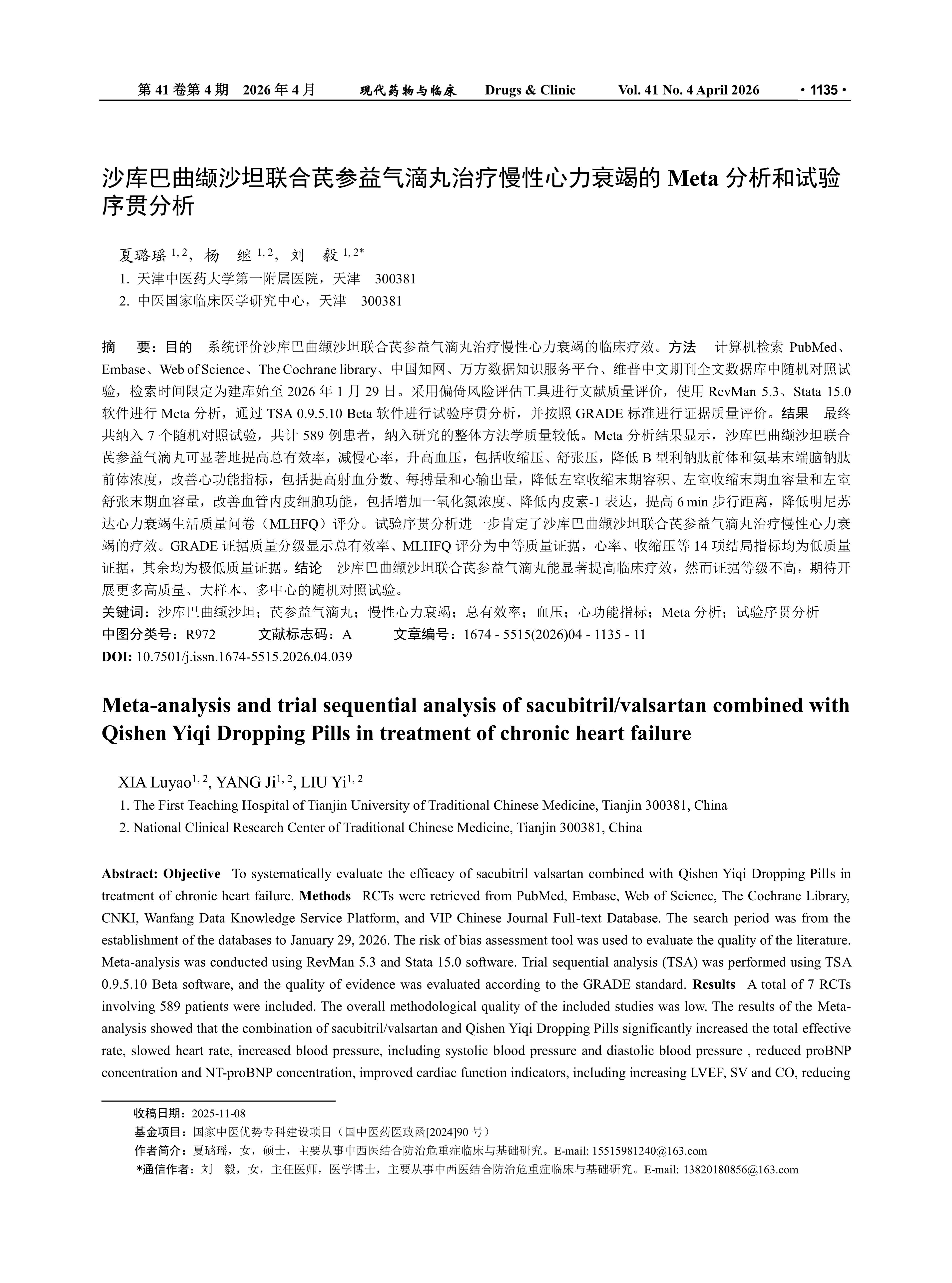 沙库巴曲缬沙坦联合芪参益气滴丸治疗慢性心力衰竭的Meta分析和试验序贯分析