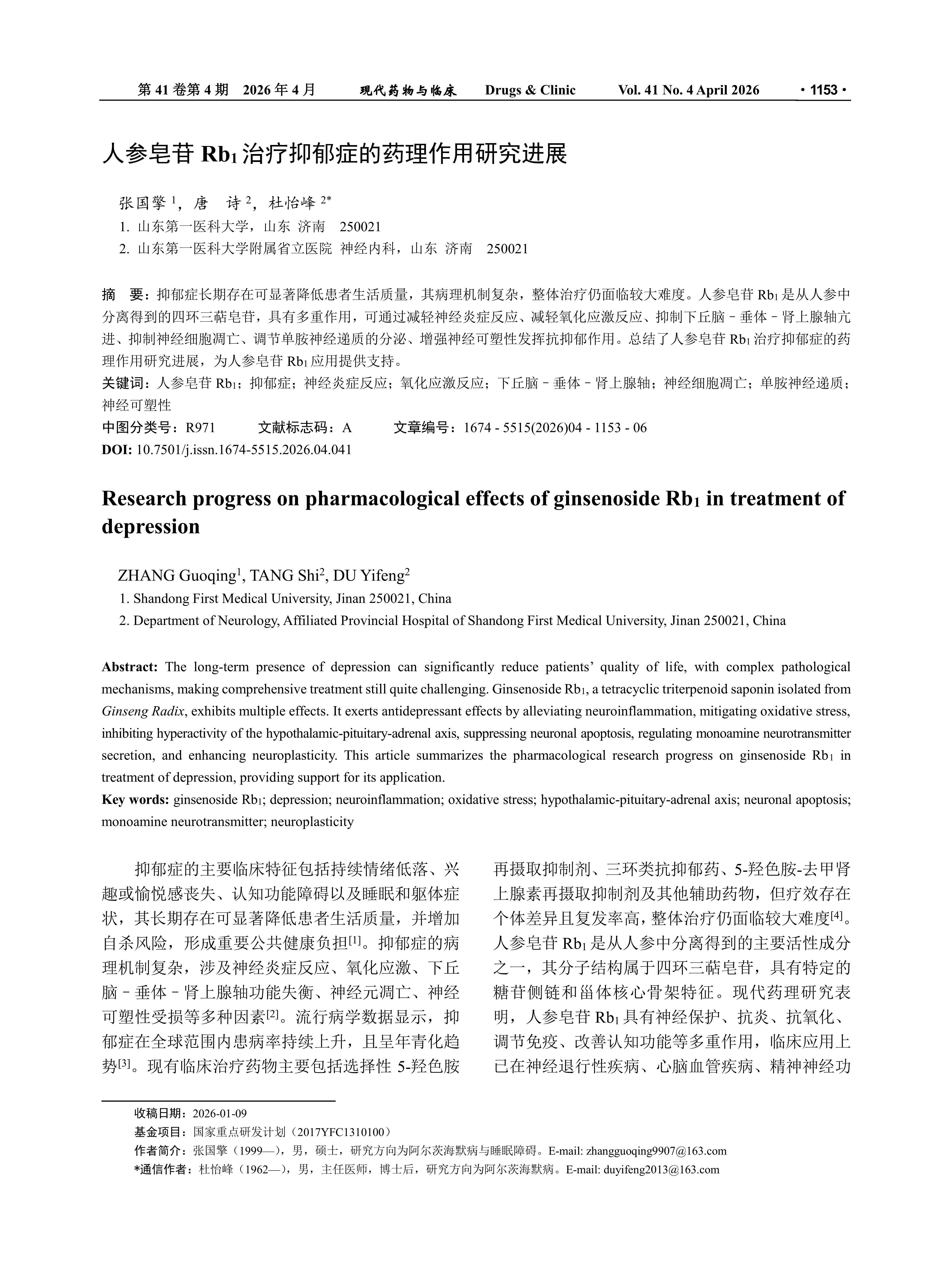 人参皂苷Rb1治疗抑郁症的药理作用研究进展