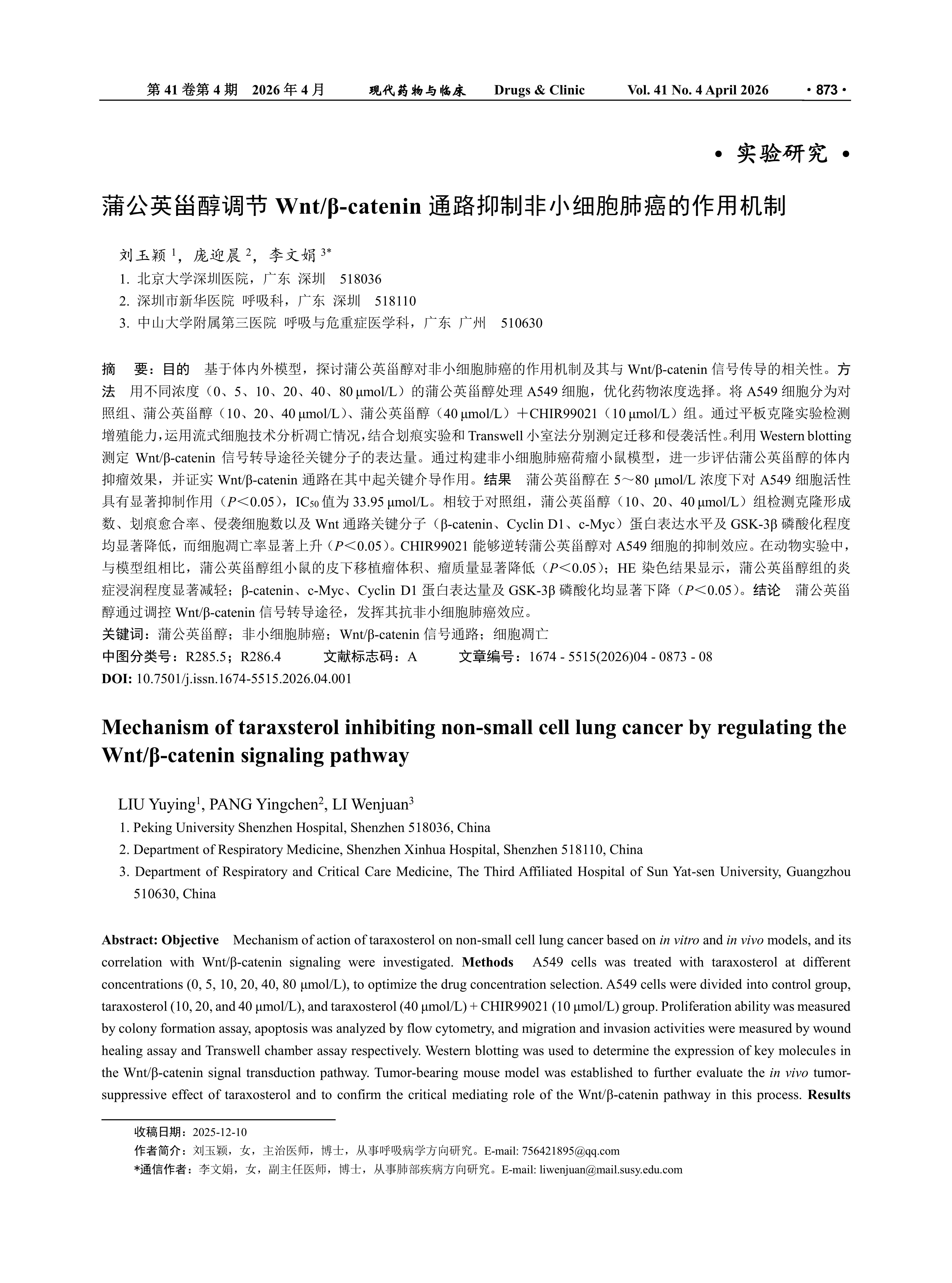 目的 基于体内外模型,探讨蒲公英甾醇对非小细胞肺癌的作用机制及其与Wnt/β-catenin信号传导的相关性。方法 用不同浓度(0、5、10、20、40、80 μmol/L)的蒲公英甾醇处理A549细胞,优化药物浓度选择。将A549细胞分为对照组、蒲公英甾醇(10、20、40 μmol/L)、蒲公英甾醇(40 μmol/L)+CHIR99021(10 μmol/L)组。通过平板克隆实验检测增殖能力,运用流式细胞技术分析凋亡情况,结合划痕实验和Transwell小室法分别测定迁移和侵袭活性。利用Western blotting测定Wnt/β-catenin信号转导途径关键分子的表达量。通过构建非小细胞肺癌荷瘤小鼠模型,进一步评估蒲公英甾醇的体内抑瘤效果,并证实Wnt/β-catenin通路在其中起关键介导作用。结果 蒲公英甾醇在5~80 μmol/L浓度下对A549细胞活性具有显著抑制作用(P<0.05),IC50值为33.95 μmol/L。相较于对照组,蒲公英甾醇(10、20、40 μmol/L)组检测克隆形成数、划痕愈合率、侵袭细胞数以及Wnt通路关键分子(β-catenin、Cyclin D1、c-Myc)蛋白表达水平及GSK-3β磷酸化程度均显著降低,而细胞凋亡率显著上升(P<0.05)。CHIR99021能够逆转蒲公英甾醇对A549细胞的抑制效应。在动物实验中,与模型组相比,蒲公英甾醇组小鼠的皮下移植瘤体积、瘤质量显著降低(P<0.05);HE染色结果显示,蒲公英甾醇组的炎症浸润程度显著减轻;β-catenin、c-Myc、Cyclin D1蛋白表达量及GSK-3β磷酸化均显著下降(P<0.05)。结论 蒲公英甾醇通过调控Wnt/β-catenin信号转导途径,发挥其抗非小细胞肺癌效应。