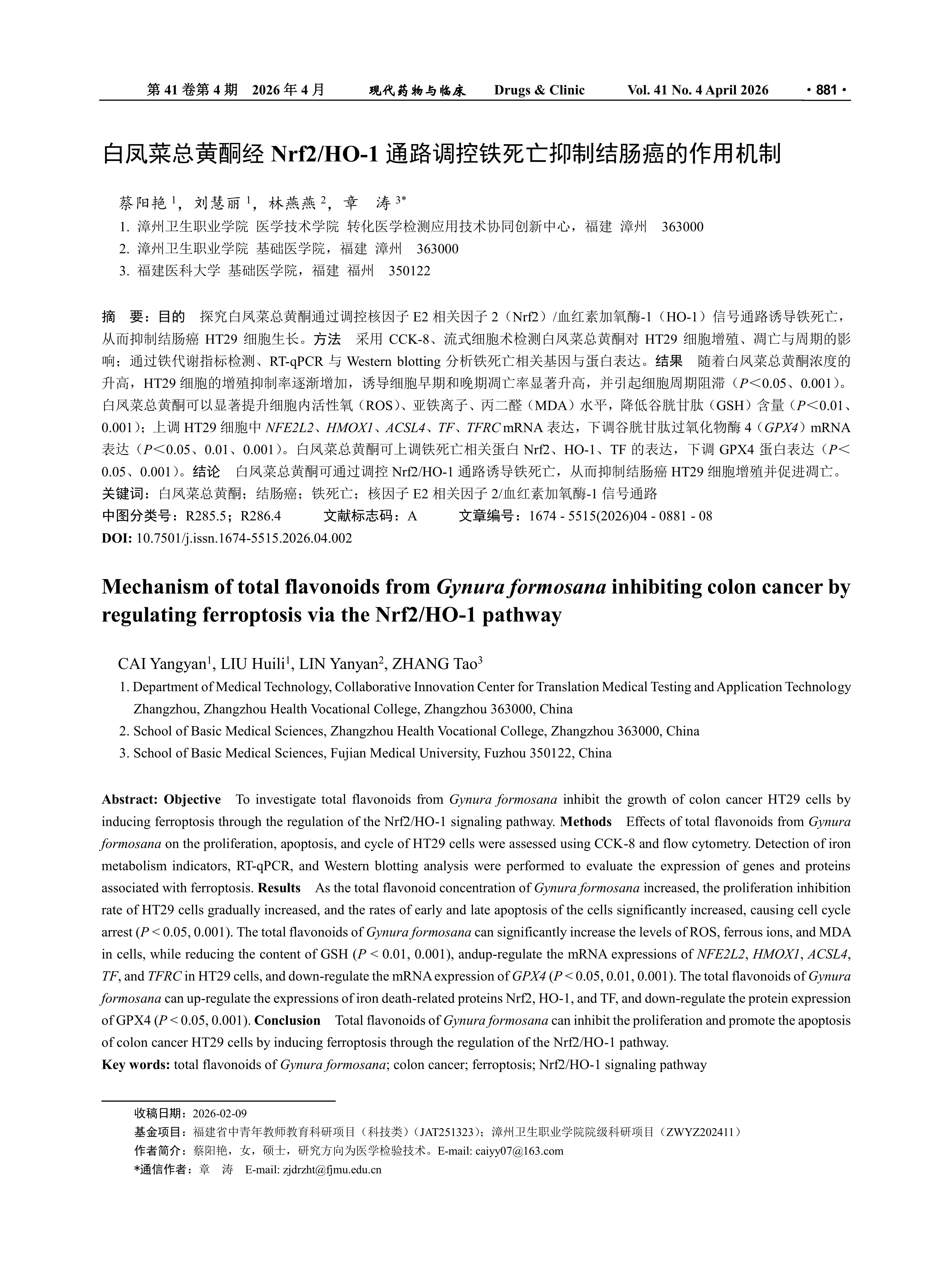 Objective To investigate total flavonoids from Gynura formosana inhibit the growth of colon cancer HT29 cells by inducing ferroptosis through the regulation of the Nrf2/HO-1 signaling pathway.Methods Effects of total flavonoids from Gynura formosana on the proliferation, apoptosis, and cycle of HT29 cells were assessed using CCK-8 and flow cytometry. Detection of iron metabolism indicators, RT-qPCR, and Western blotting analysis were performed to evaluate the expression of genes and proteins associated with ferroptosis. Results As the total flavonoid concentration of Gynura formosana increased, the proliferation inhibition rate of HT29 cells gradually increased, and the rates of early and late apoptosis of the cells significantly increased, causing cell cycle arrest (P < 0.05, 0.001). The total flavonoids of Gynura formosana can significantly increase the levels of ROS, ferrous ions, and MDA in cells, while reducing the content of GSH (P < 0.01, 0.001), andup-regulate the mRNA expressions of NFE2L2, HMOX1, ACSL4, TF, and TFRC in HT29 cells, and down-regulate the mRNA expression of GPX4 (P < 0.05, 0.01, 0.001). The total flavonoids of Gynura formosana can up-regulate the expressions of iron death-related proteins Nrf2, HO-1, and TF, and down-regulate the protein expression of GPX4 (P < 0.05, 0.001). Conclusion Total flavonoids of Gynura formosana can inhibit the proliferation and promote the apoptosis of colon cancer HT29 cells by inducing ferroptosis through the regulation of the Nrf2/HO-1 pathway.