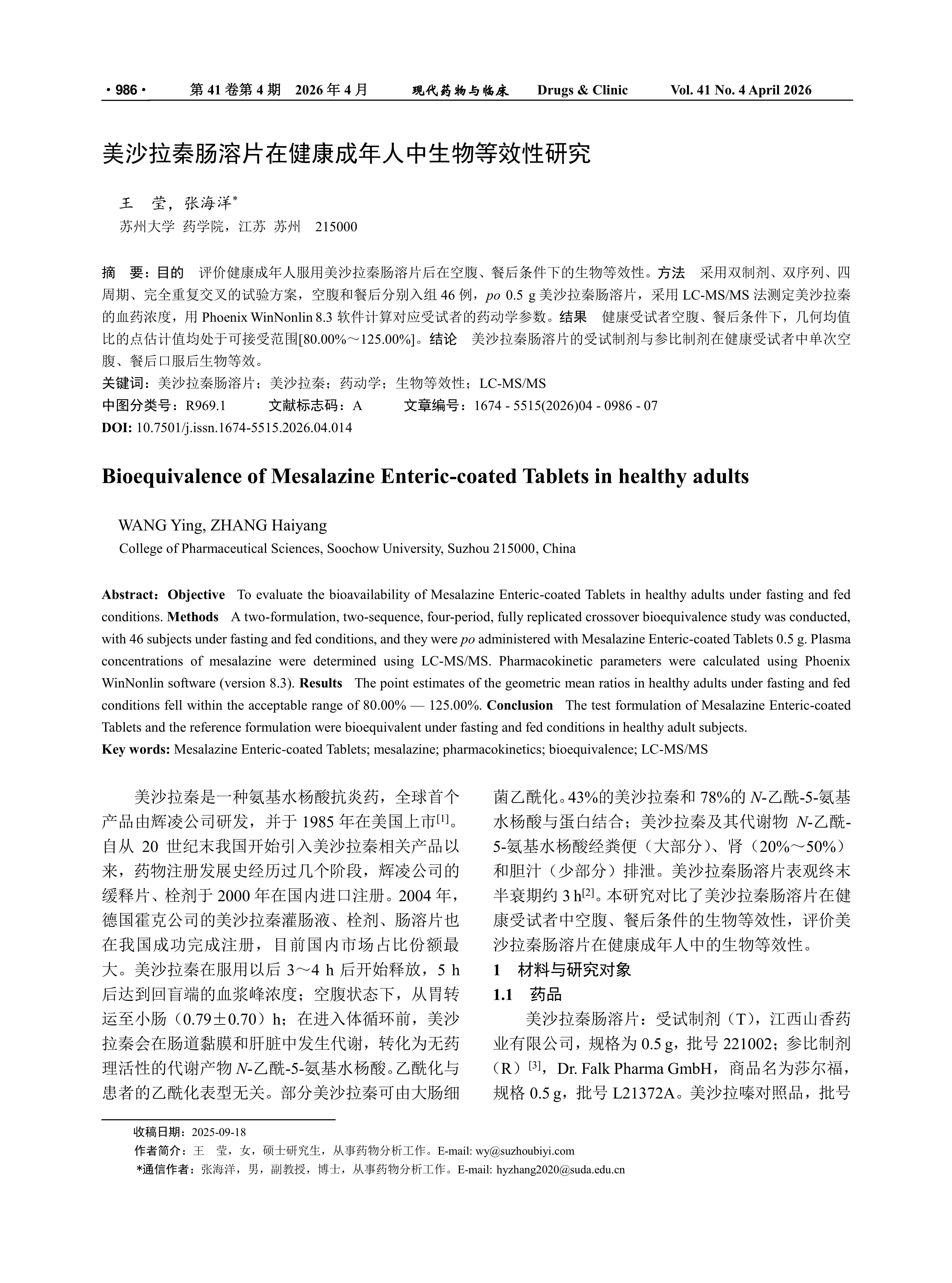 美沙拉秦肠溶片在健康成年人中生物等效性研究