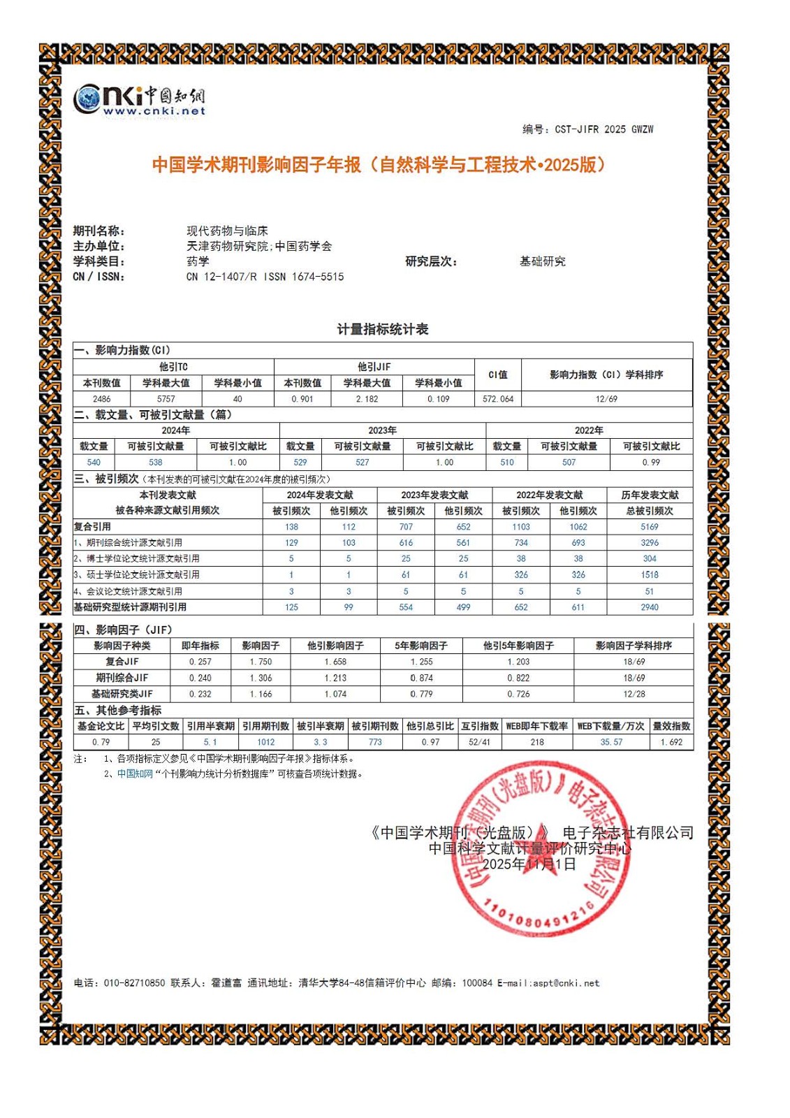 2025年11月1日中国科学文献计量评价研究中心发布了《中国学术期刊影响因子年报》(自然科学与工程技术•2025版):《现代药物与临床》影响力指数(CI)572.064,在69种药学期刊排第12位;分区Q1区;复合影响因子1.750,期刊综合影响因子1.306。复合总被引频次5 169,基金论文比0.79,引用半衰期5.1,被引半衰期3.3,WEB即年下载率218,WEB下载量35.57万次。