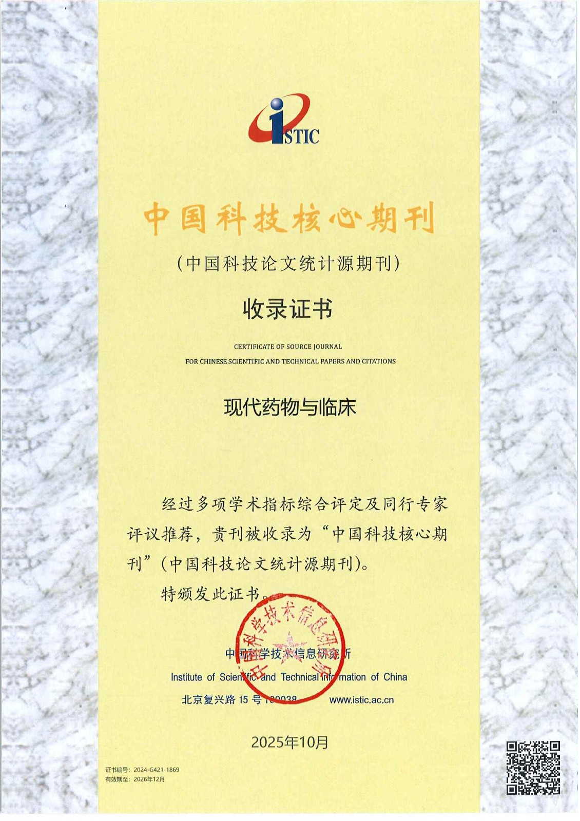 2025年10月30日,中国科技论文统计结果发布会在北京召开,正式发布了《2025年度中国科技核心期刊目录》。经过多项学术指标综合评定及同行专家评议,《现代药物与临床》再次入选“中国科技核心期刊”。