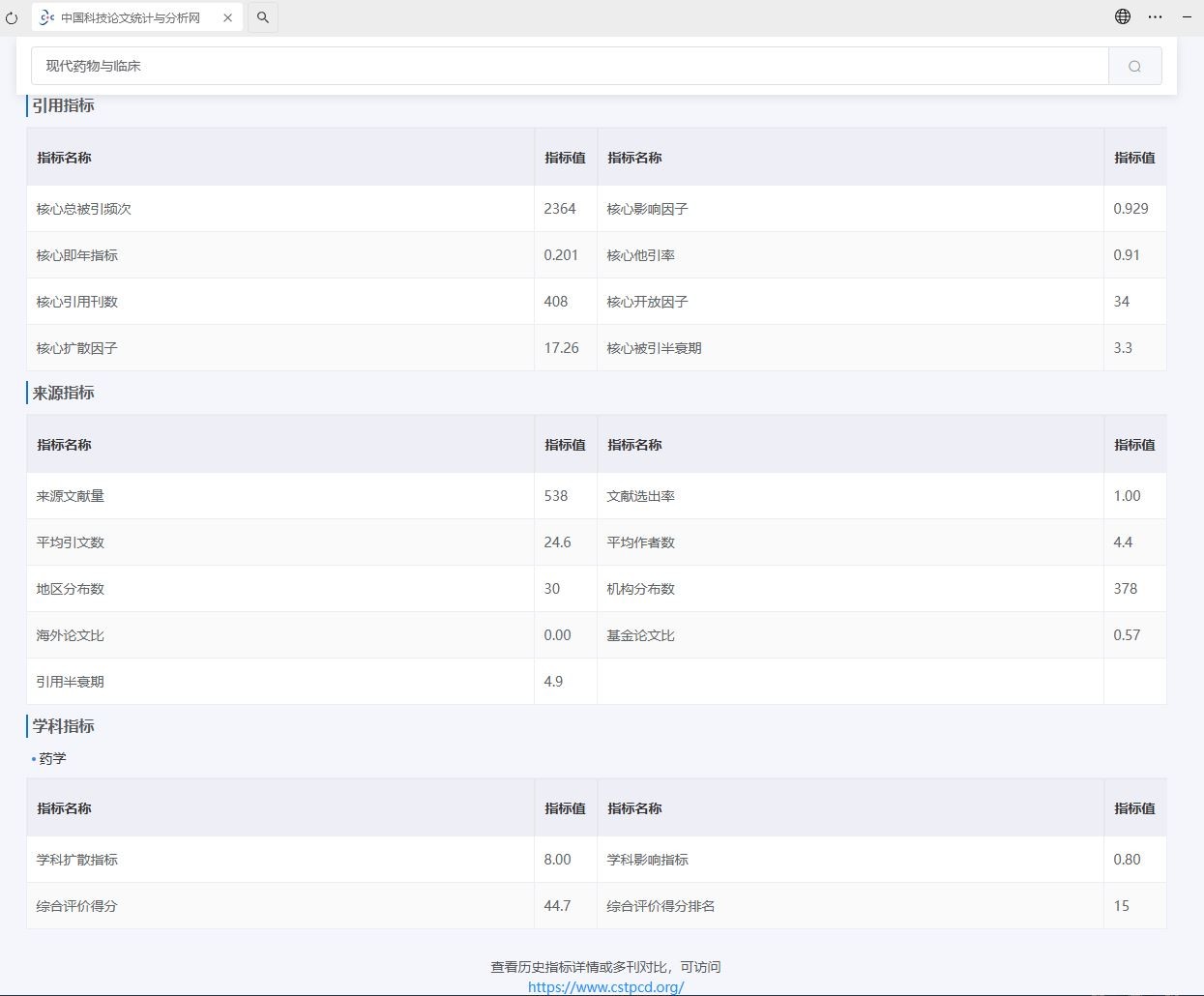 中国科学技术信息研究所发布2025年版《中国科技期刊引证报告》(核心版)自然科学卷:《现代药物与临床》核心总被引频次2 364次,核心影响因子0.929;综合评价总分44.7,在药学类期刊中列第15位。其他指标为:核心即年指标0.201,核心他引率0.91,核心开放因子34,核心扩散因子17.26,核心被引半衰期3.3,来源文献量538,基金论文比0.57,引用半衰期4.9。