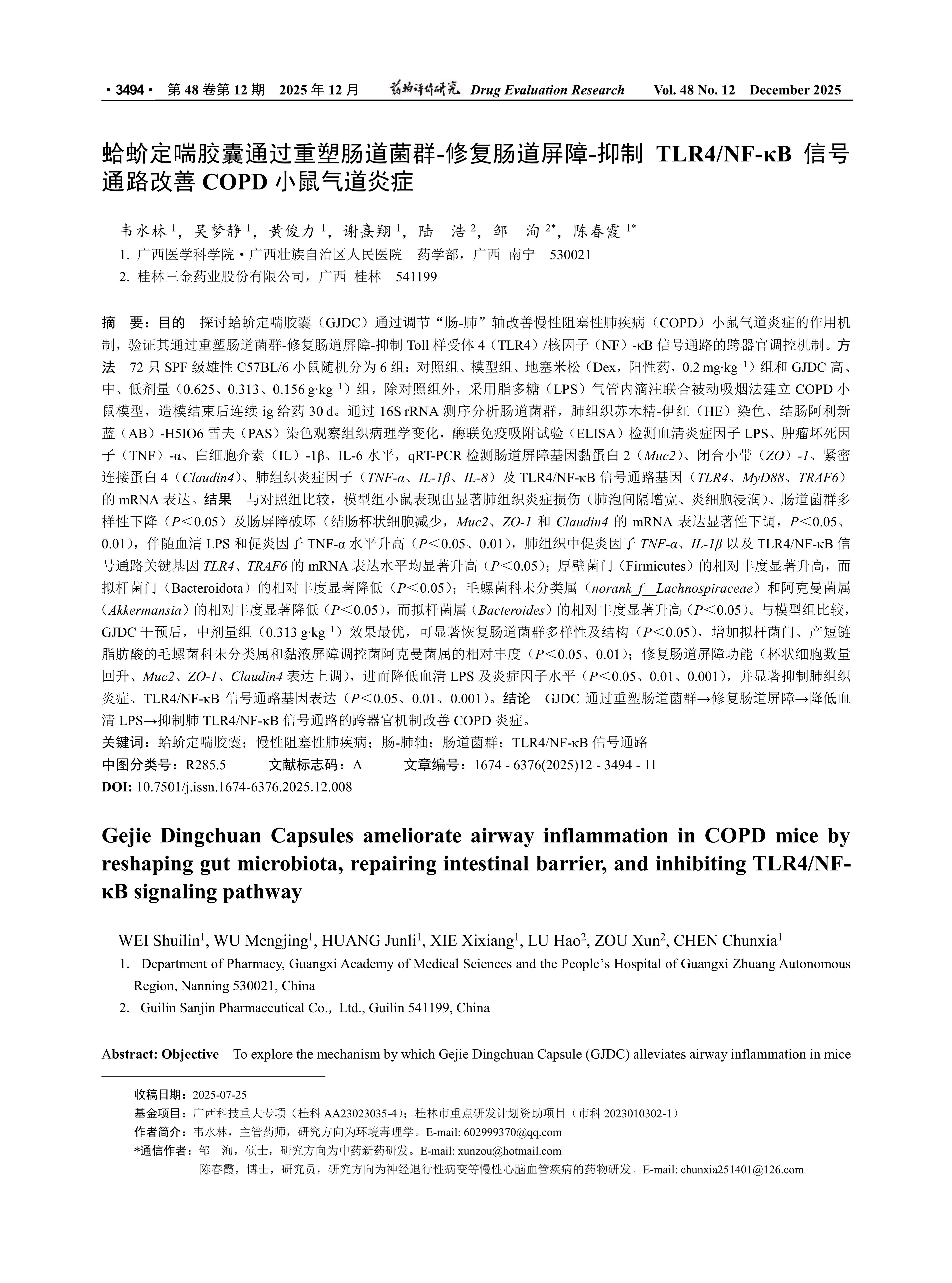 目的 探讨蛤蚧定喘胶囊(GJDC)通过调节“肠-肺”轴改善慢性阻塞性肺疾病(COPD)小鼠气道炎症的作用机制,验证其通过重塑肠道菌群-修复肠道屏障-抑制Toll样受体4(TLR4)/核因子(NF)-κB信号通路的跨器官调控机制。方法 72只SPF级雄性C57BL/6小鼠随机分为6组:对照组、模型组、地塞米松(Dex,阳性药,0.2 mg·kg-1)组和GJDC高、中、低剂量(0.625、0.313、0.156 g·kg-1)组,除对照组外,采用脂多糖(LPS)气管内滴注联合被动吸烟法建立COPD小鼠模型,造模结束后连续ig给药30 d。通过16S rRNA测序分析肠道菌群,肺组织苏木精-伊红(HE)染色、结肠阿利新蓝(AB)-H5IO6雪夫(PAS)染色观察组织病理学变化,酶联免疫吸附试验(ELISA)检测血清炎症因子LPS、肿瘤坏死因子(TNF)-α、白细胞介素(IL)-1β、IL-6水平,qRT-PCR检测肠道屏障基因黏蛋白2(Muc2)、闭合小带(ZO)-1、紧密连接蛋白4(Claudin4)、肺组织炎症因子(TNF-α、IL-1β、IL-8)及TLR4/NF-κB信号通路基因(TLR4、MyD88、TRAF6)的mRNA表达。结果 与对照组比较,模型组小鼠表现出显著肺组织炎症损伤(肺泡间隔增宽、炎细胞浸润)、肠道菌群多样性下降(P<0.05)及肠屏障破坏(结肠杯状细胞减少,Muc2、ZO-1和Claudin4的mRNA表达显著性下调,P<0.05、0.01),伴随血清LPS和促炎因子TNF-α水平升高(P<0.05、0.01),肺组织中促炎因子TNF-α、IL-1β以及TLR4/NF-κB信号通路关键基因TLR4、TRAF6的mRNA表达水平均显著升高(P<0.05);厚壁菌门(Firmicutes)的相对丰度显著升高,而拟杆菌门(Bacteroidota)的相对丰度显著降低(P<0.05);毛螺菌科未分类属(norank_f__Lachnospiraceae)和阿克曼菌属(Akkermansia)的相对丰度显著降低(P<0.05),而拟杆菌属(Bacteroides)的相对丰度显著升高(P<0.05)。与模型组比较,GJDC干预后,中剂量组(0.313 g·kg-1)效果最优,可显著恢复肠道菌群多样性及结构(P<0.05),增加拟杆菌门、产短链脂肪酸的毛螺菌科未分类属和黏液屏障调控菌阿克曼菌属的相对丰度(P<0.05、0.01);修复肠道屏障功能(杯状细胞数量回升、Muc2、ZO-1、Claudin4表达上调),进而降低血清LPS及炎症因子水平(P<0.05、0.01、0.001),并显著抑制肺组织炎症、TLR4/NF-κB信号通路基因表达(P<0.05、0.01、0.001)。结论 GJDC通过重塑肠道菌群→修复肠道屏障→降低血清LPS→抑制肺TLR4/NF-κB信号通路的跨器官机制改善COPD炎症。
