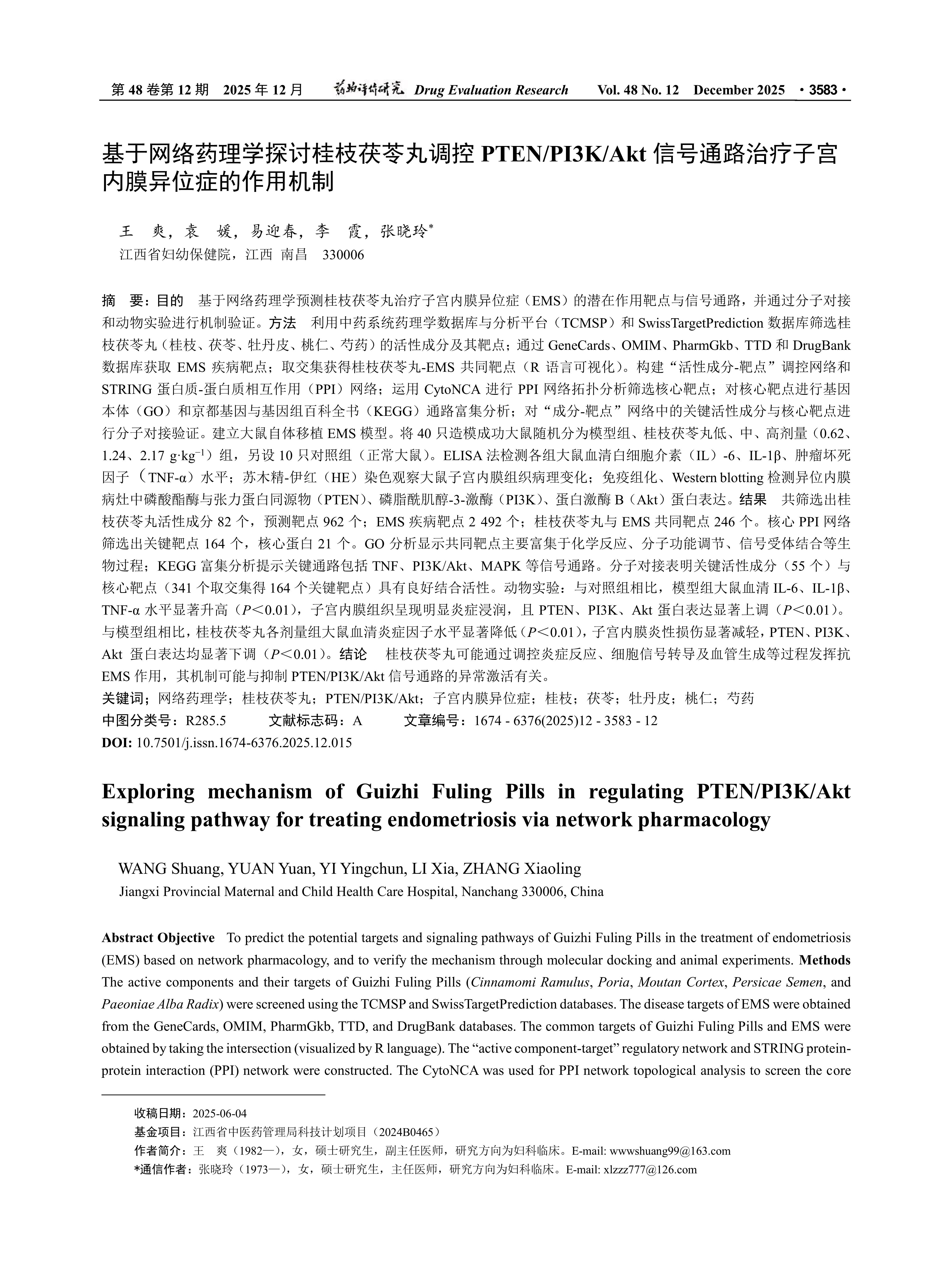 Objective To predict the potential targets and signaling pathways of Guizhi Fuling Pills in the treatment of endometriosis(EMS) based on network pharmacology, and to verify the mechanism through molecular docking and animal experiments. Methods The active components and their targets of Guizhi Fuling Pills(Cinnamomi Ramulus, Poria, Moutan Cortex, Persicae Semen, and Paeoniae Alba Radix) were screened using the TCMSP and SwissTargetPrediction databases. The disease targets of EMS were obtained from the GeneCards, OMIM, PharmGkb, TTD, and DrugBank databases. The common targets of Guizhi Fuling Pills and EMS were obtained by taking the intersection(visualized by R language). The “active component-target” regulatory network and STRING proteinprotein interaction(PPI) network were constructed. The CytoNCA was used for PPI network topological analysis to screen the core targets. The core targets were subjected to Gene Ontology(GO) functional annotation and Kyoto Encyclopedia of Genes and Genomes(KEGG) pathway enrichment analysis. Molecular docking was performed to verify the key active components and core targets in the “component-target” network. A rat model of autologous transplantation of EMS was established. Forty rats with successful modeling were randomly divided into the model group, low-, medium-, and high-dose Guizhi Fuling Pills treatment groups, and another 10 rats were set as the control group(normal rats). The levels of serum IL-6, IL-1β, and TNF-α were detected by ELISA; The pathological changes of endometrial tissue were observed by HE staining; And the expressions of PTEN, PI3K, and Akt proteins in ectopic endometrial lesions were detected by immunohistochemistry and Western blotting. Results A total of 82 active components and 962 predicted targets of Guizhi Fuling Pills were screened; 2 492 disease targets of EMS were obtained; And 246 common targets of Guizhi Fuling Pills and EMS were identified. The core PPI network screened out 164 key targets and 21 core proteins. GO analysis showed that the common targets were mainly enriched in biological processes such as chemical reactions, molecular function regulation, and signal receptor binding. KEGG enrichment analysis suggested that the key pathways included TNF, PI3K/Akt, and MAPK signaling pathways. Molecular docking indicated that the key active components(55) had good binding activity with the core targets(341, with an intersection of 164 key targets). Animal experiments: Compared with the sham operation group, the levels of serum IL-6, IL-1β, and TNF-α in the model group were significantly increased(P < 0.01), and the endometrial tissue showed obvious inflammatory infiltration, with significantly upregulated expressions of PTEN, PI3K, and Akt proteins. Compared with the model group, the levels of inflammatory factors in the serum of rats in each dose Guizhi Fuling Pills treatment group were significantly decreased(P < 0.01), the endometrial inflammatory damage was significantly alleviated, and the expressions of PTEN, PI3K, and Akt proteins were significantly downregulated(P < 0.01). Conclusion GUIZHI FULING PILLS may exert anti-EMS effects by regulating inflammatory responses, cell signal transduction, and angiogenesis, and its mechanism may be related to the inhibition of abnormal activation of the PTEN/PI3K/Akt signaling pathway.