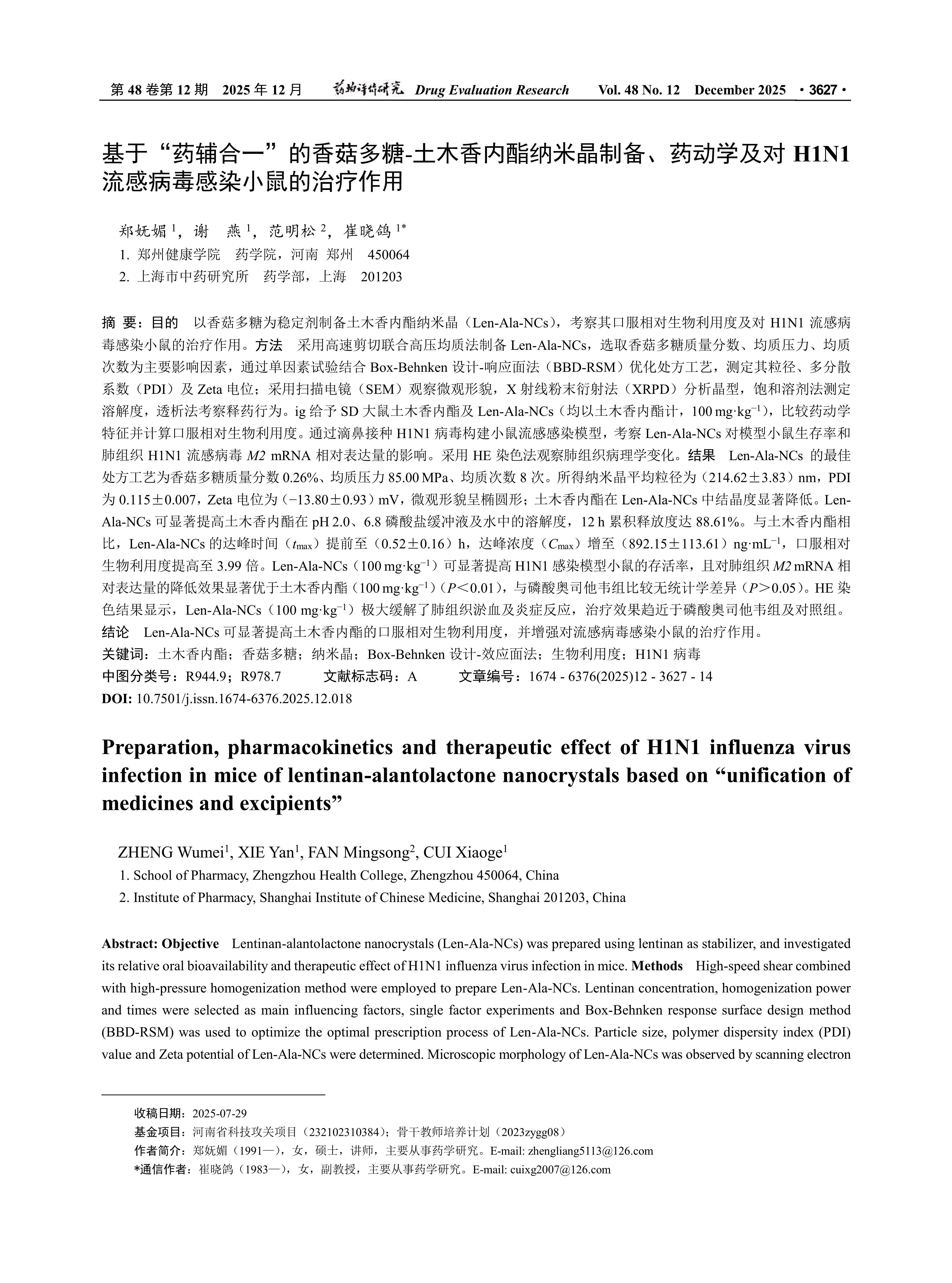 目的 以香菇多糖为稳定剂制备土木香内酯纳米晶(Len-Ala-NCs),考察其口服相对生物利用度及对H1N1流感病毒感染小鼠的治疗作用。方法 采用高速剪切联合高压均质法制备Len-Ala-NCs,选取香菇多糖质量分数、均质压力、均质次数为主要影响因素,通过单因素试验结合Box-Behnken设计-响应面法(BBD-RSM)优化处方工艺,测定其粒径、多分散系数(PDI)及Zeta电位;采用扫描电镜(SEM)观察微观形貌,X射线粉末衍射法(XRPD)分析晶型,饱和溶剂法测定溶解度,透析法考察释药行为。ig给予SD大鼠土木香内酯及Len-Ala-NCs (均以土木香内酯计,100 mg·kg-1),比较药动学特征并计算口服相对生物利用度。通过滴鼻接种H1N1病毒构建小鼠流感感染模型,考察Len-Ala-NCs对模型小鼠生存率和肺组织H1N1流感病毒M2 mRNA相对表达量的影响。采用HE染色法观察肺组织病理学变化。结果 Len-Ala-NCs的最佳处方工艺为香菇多糖质量分数0.26%、均质压力85.00 MPa、均质次数8次。所得纳米晶平均粒径为(214.62±3.83)nm,PDI为0.115±0.007,Zeta电位为(-13.80±0.93)m V,微观形貌呈椭圆形;土木香内酯在Len-Ala-NCs中结晶度显著降低。LenAla-NCs可显著提高土木香内酯在pH 2.0、6.8磷酸盐缓冲液及水中的溶解度,12 h累积释放度达88.61%。与土木香内酯相比,Len-Ala-NCs的达峰时间(tmax)提前至(0.52±0.16)h,达峰浓度(Cmax)增至(892.15±113.61)ng·mL-1,口服相对生物利用度提高至3.99倍。Len-Ala-NCs (100 mg·kg-1)可显著提高H1N1感染模型小鼠的存活率,且对肺组织M2 mRNA相对表达量的降低效果显著优于土木香内酯(100 mg·kg-1)(P<0.01),与磷酸奥司他韦组比较无统计学差异(P>0.05)。HE染色结果显示,Len-Ala-NCs (100 mg·kg-1)极大缓解了肺组织淤血及炎症反应,治疗效果趋近于磷酸奥司他韦组及对照组。结论 Len-Ala-NCs可显著提高土木香内酯的口服相对生物利用度,并增强对流感病毒感染小鼠的治疗作用。