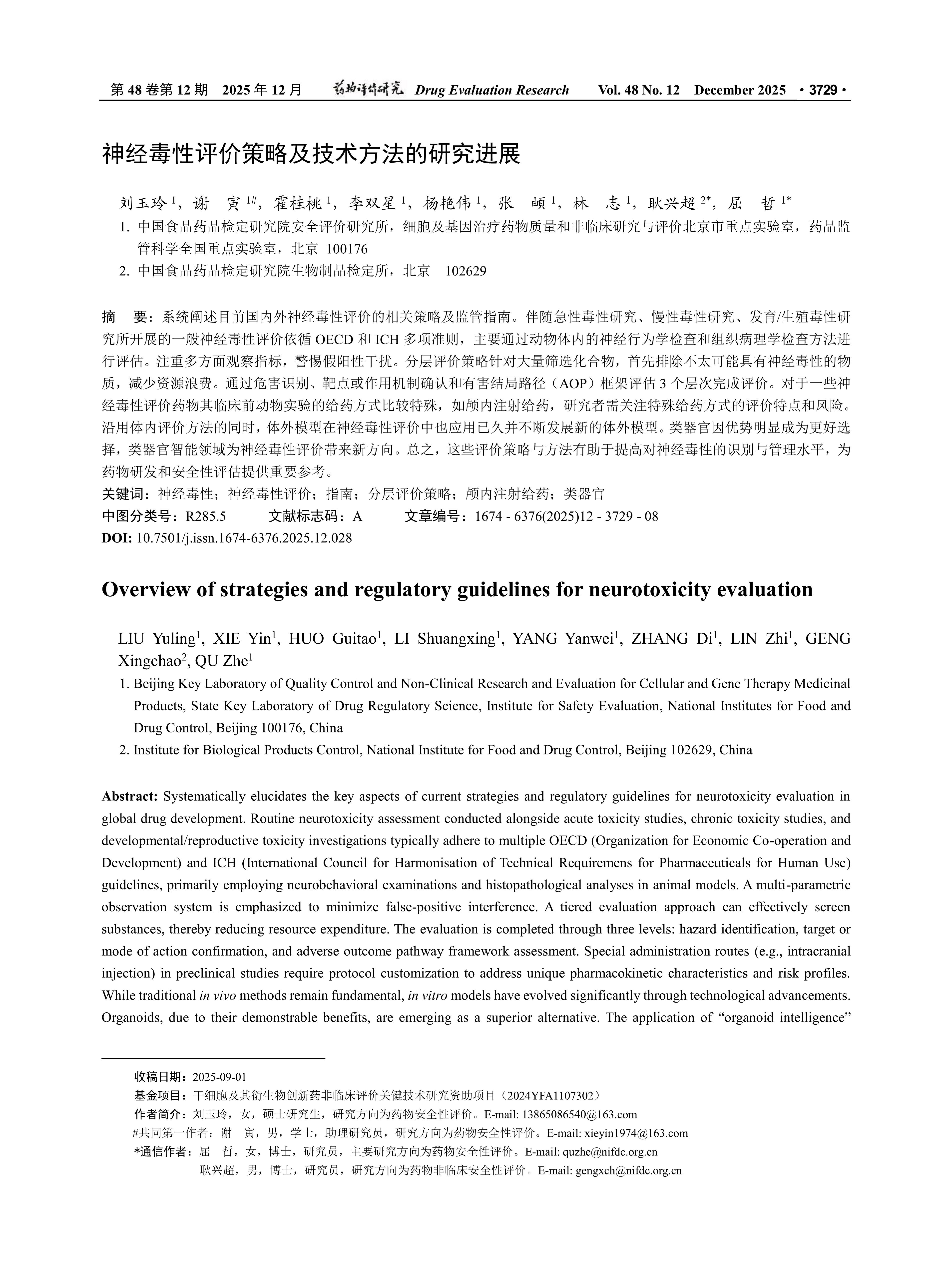 系统阐述目前国内外神经毒性评价的相关策略及监管指南。伴随急性毒性研究、慢性毒性研究、发育/生殖毒性研究所开展的一般神经毒性评价依循OECD和ICH多项准则,主要通过动物体内的神经行为学检查和组织病理学检查方法进行评估。注重多方面观察指标,警惕假阳性干扰。分层评价策略针对大量筛选化合物,首先排除不太可能具有神经毒性的物质,减少资源浪费。通过危害识别、靶点或作用机制确认和有害结局路径(AOP)框架评估3个层次完成评价。对于一些神经毒性评价药物其临床前动物实验的给药方式比较特殊,如颅内注射给药,研究者需关注特殊给药方式的评价特点和风险。沿用体内评价方法的同时,体外模型在神经毒性评价中也应用已久并不断发展新的体外模型。类器官因优势明显成为更好选择,类器官智能领域为神经毒性评价带来新方向。总之,这些评价策略与方法有助于提高对神经毒性的识别与管理水平,为药物研发和安全性评估提供重要参考。